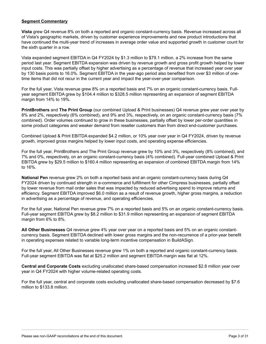 Segment Commentary Vista grew Q4 revenue 8% on both a reported and organic constant-currency basis. Revenue increased across all of Vista's geographic markets, driven by customer experience improvements and new product introductions that have continued the multi-year trend of increases in average order value and supported growth in customer count for the sixth quarter in a row. Vista expanded segment EBITDA in Q4 FY2024 by $1.3 million to $79.1 million, a 2% increase from the same period last year. Segment EBITDA expansion was driven by revenue growth and gross profit growth helped by lower input costs. This was partially offset by higher advertising as a percentage of revenue that increased year over year by 130 basis points to 16.0%. Segment EBITDA in the year-ago period also benefited from over $3 million of one- time items that did not recur in the current year and impact the year-over-year comparison. For the full year, Vista revenue grew 8% on a reported basis and 7% on an organic constant-currency basis. Full- year segment EBITDA grew by $104.4 million to $328.5 million representing an expansion of segment EBITDA margin from 14% to 19%. PrintBrothers and The Print Group (our combined Upload & Print businesses) Q4 revenue grew year over year by 8% and 2%, respectively (6% combined), and 9% and 3%, respectively, on an organic constant-currency basis (7% combined). Order volumes continued to grow in these businesses, partially offset by lower per-order quantities in some product categories and weaker demand from reseller customers than from direct end-customer purchases. Combined Upload & Print EBITDA expanded $4.2 million, or 10% year over year in Q4 FY2024, driven by revenue growth, improved gross margins helped by lower input costs, and operating expense efficiencies. For the full year, PrintBrothers and The Print Group revenue grew by 10% and 3%, respectively (8% combined), and 7% and 0%, respectively, on an organic constant-currency basis (4% combined). Full-year combined Upload & Print EBITDA grew by $29.5 million to $160.4 million representing an expansion of combined EBITDA margin from 14% to 16%. National Pen revenue grew 2% on both a reported basis and an organic constant-currency basis during Q4 FY2024 driven by continued strength in e-commerce and fulfillment for other Cimpress businesses, partially offset by lower revenue from mail order sales that was impacted by reduced advertising spend to improve returns and efficiency. Segment EBITDA improved $6.0 million as a result of revenue growth, higher gross margins, a reduction in advertising as a percentage of revenue, and operating efficiencies. For the full year, National Pen revenue grew 7% on a reported basis and 5% on an organic constant-currency basis. Full-year segment EBITDA grew by $8.2 million to $31.9 million representing an expansion of segment EBITDA margin from 6% to 8%. All Other Businesses Q4 revenue grew 4% year over year on a reported basis and 5% on an organic constant- currency basis. Segment EBITDA declined with lower gross margins and the non-recurrence of a prior-year benefit in operating expenses related to variable long-term incentive compensation in BuildASign. For the full year, All Other Businesses revenue grew 1% on both a reported and organic constant-currency basis. Full-year segment EBITDA was flat at $25.2 million and segment EBITDA margin was flat at 12%. Central and Corporate Costs excluding unallocated share-based compensation increased $2.8 million year over year in Q4 FY2024 with higher volume-related operating costs. For the full year, central and corporate costs excluding unallocated share-based compensation decreased by $7.6 million to $133.8 million. Please see non-GAAP reconciliations at the end of this document. Page 3 of 31