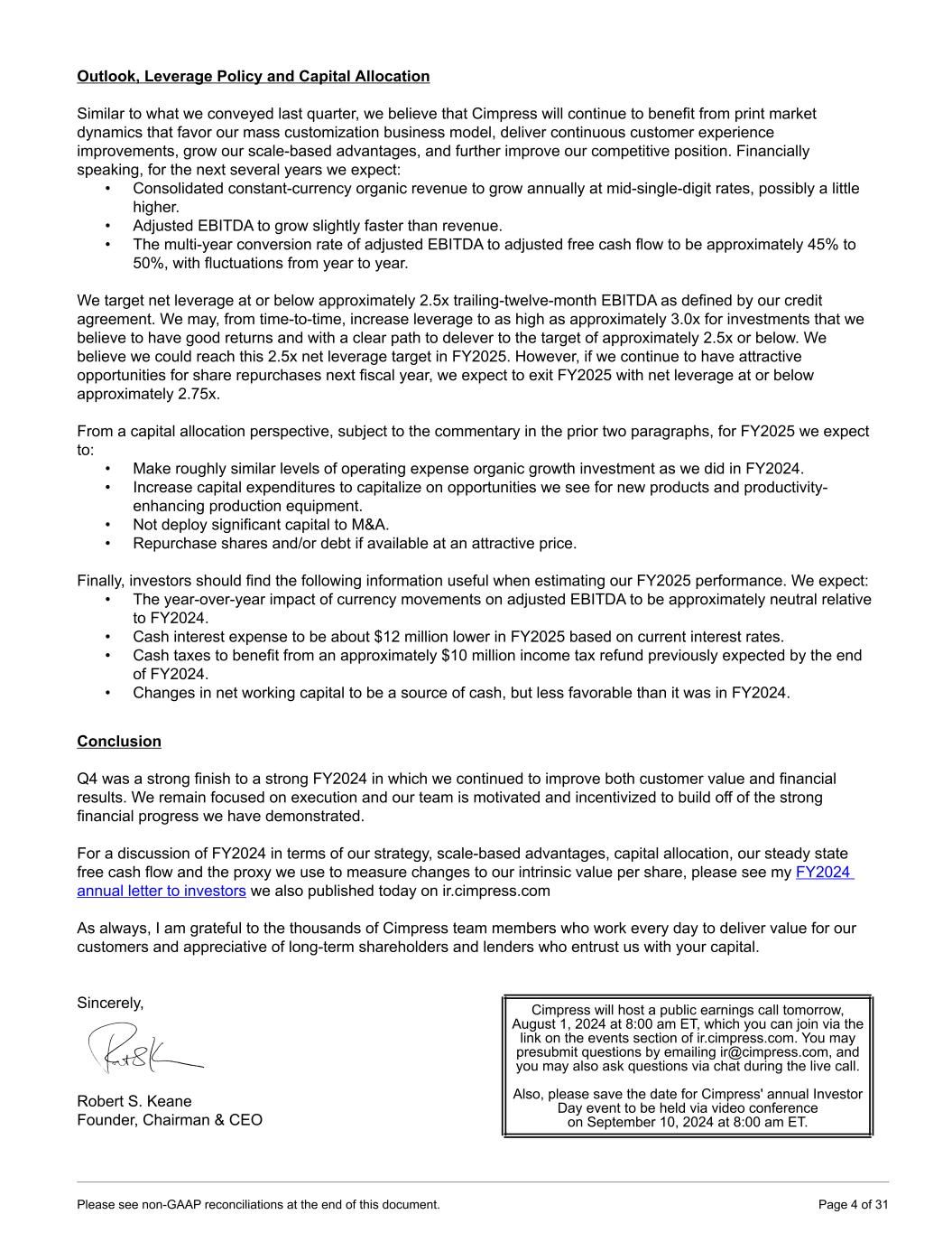Outlook, Leverage Policy and Capital Allocation Similar to what we conveyed last quarter, we believe that Cimpress will continue to benefit from print market dynamics that favor our mass customization business model, deliver continuous customer experience improvements, grow our scale-based advantages, and further improve our competitive position. Financially speaking, for the next several years we expect: • Consolidated constant-currency organic revenue to grow annually at mid-single-digit rates, possibly a little higher. • Adjusted EBITDA to grow slightly faster than revenue. • The multi-year conversion rate of adjusted EBITDA to adjusted free cash flow to be approximately 45% to 50%, with fluctuations from year to year. We target net leverage at or below approximately 2.5x trailing-twelve-month EBITDA as defined by our credit agreement. We may, from time-to-time, increase leverage to as high as approximately 3.0x for investments that we believe to have good returns and with a clear path to delever to the target of approximately 2.5x or below. We believe we could reach this 2.5x net leverage target in FY2025. However, if we continue to have attractive opportunities for share repurchases next fiscal year, we expect to exit FY2025 with net leverage at or below approximately 2.75x. From a capital allocation perspective, subject to the commentary in the prior two paragraphs, for FY2025 we expect to: • Make roughly similar levels of operating expense organic growth investment as we did in FY2024. • Increase capital expenditures to capitalize on opportunities we see for new products and productivity- enhancing production equipment. • Not deploy significant capital to M&A. • Repurchase shares and/or debt if available at an attractive price. Finally, investors should find the following information useful when estimating our FY2025 performance. We expect: • The year-over-year impact of currency movements on adjusted EBITDA to be approximately neutral relative to FY2024. • Cash interest expense to be about $12 million lower in FY2025 based on current interest rates. • Cash taxes to benefit from an approximately $10 million income tax refund previously expected by the end of FY2024. • Changes in net working capital to be a source of cash, but less favorable than it was in FY2024. Conclusion Q4 was a strong finish to a strong FY2024 in which we continued to improve both customer value and financial results. We remain focused on execution and our team is motivated and incentivized to build off of the strong financial progress we have demonstrated. For a discussion of FY2024 in terms of our strategy, scale-based advantages, capital allocation, our steady state free cash flow and the proxy we use to measure changes to our intrinsic value per share, please see my FY2024 annual letter to investors we also published today on ir.cimpress.com As always, I am grateful to the thousands of Cimpress team members who work every day to deliver value for our customers and appreciative of long-term shareholders and lenders who entrust us with your capital. Sincerely, Robert S. Keane Founder, Chairman & CEO Cimpress will host a public earnings call tomorrow, August 1, 2024 at 8:00 am ET, which you can join via the link on the events section of ir.cimpress.com. You may presubmit questions by emailing ir@cimpress.com, and you may also ask questions via chat during the live call. Also, please save the date for Cimpress' annual Investor Day event to be held via video conference on September 10, 2024 at 8:00 am ET. Please see non-GAAP reconciliations at the end of this document. Page 4 of 31