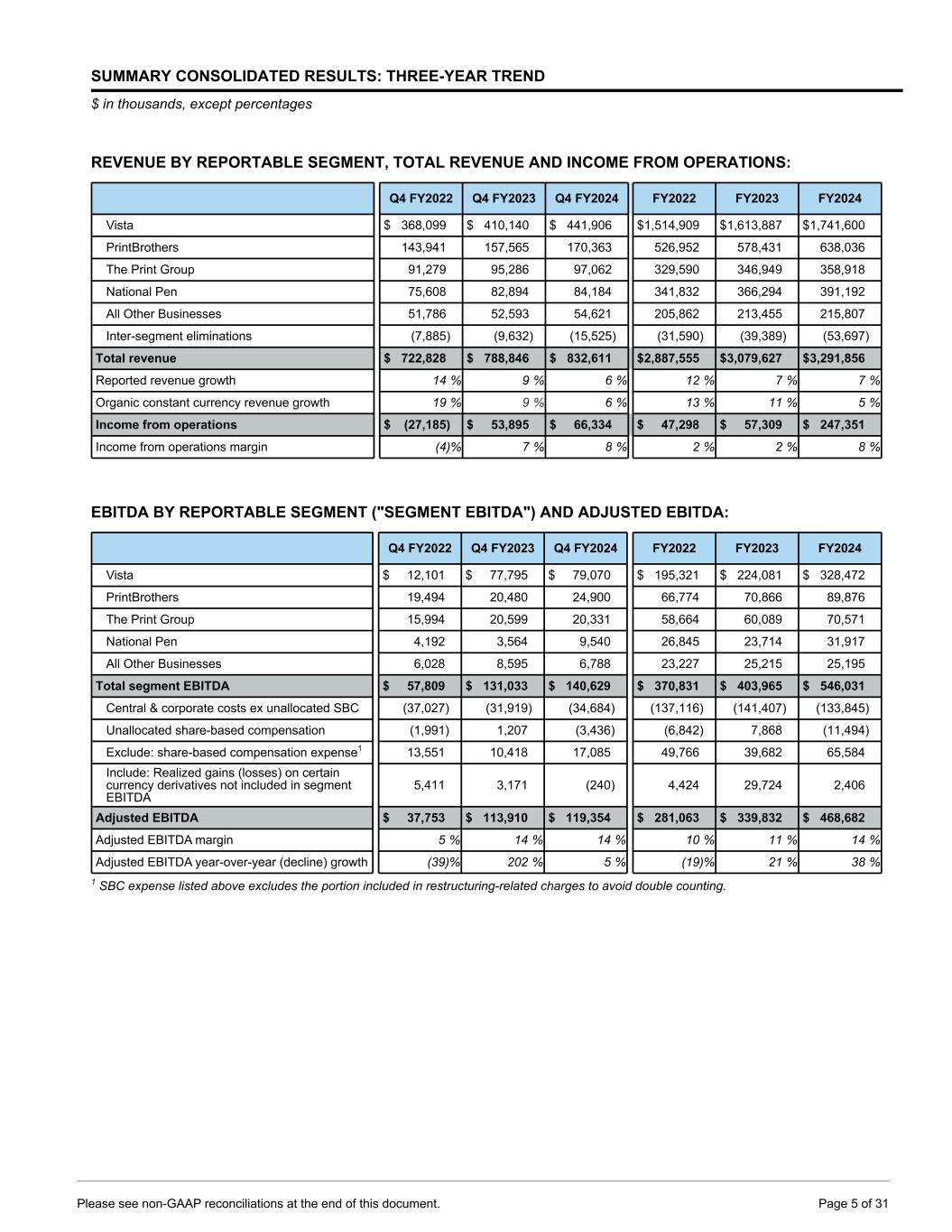 SUMMARY CONSOLIDATED RESULTS: THREE-YEAR TREND $ in thousands, except percentages REVENUE BY REPORTABLE SEGMENT, TOTAL REVENUE AND INCOME FROM OPERATIONS: Q4 FY2022 Q4 FY2023 Q4 FY2024 FY2022 FY2023 FY2024 Vista $ 368,099 $ 410,140 $ 441,906 $ 1,514,909 $ 1,613,887 $ 1,741,600 PrintBrothers 143,941 157,565 170,363 526,952 578,431 638,036 The Print Group 91,279 95,286 97,062 329,590 346,949 358,918 National Pen 75,608 82,894 84,184 341,832 366,294 391,192 All Other Businesses 51,786 52,593 54,621 205,862 213,455 215,807 Inter-segment eliminations (7,885) (9,632) (15,525) (31,590) (39,389) (53,697) Total revenue $ 722,828 $ 788,846 $ 832,611 $ 2,887,555 $ 3,079,627 $ 3,291,856 Reported revenue growth 14 % 9 % 6 % 12 % 7 % 7 % Organic constant currency revenue growth 19 % 9 % 6 % 13 % 11 % 5 % Income from operations $ (27,185) $ 53,895 $ 66,334 $ 47,298 $ 57,309 $ 247,351 Income from operations margin (4) % 7 % 8 % 2 % 2 % 8 % EBITDA BY REPORTABLE SEGMENT ("SEGMENT EBITDA") AND ADJUSTED EBITDA: Q4 FY2022 Q4 FY2023 Q4 FY2024 FY2022 FY2023 FY2024 Vista $ 12,101 $ 77,795 $ 79,070 $ 195,321 $ 224,081 $ 328,472 PrintBrothers 19,494 20,480 24,900 66,774 70,866 89,876 The Print Group 15,994 20,599 20,331 58,664 60,089 70,571 National Pen 4,192 3,564 9,540 26,845 23,714 31,917 All Other Businesses 6,028 8,595 6,788 23,227 25,215 25,195 Total segment EBITDA $ 57,809 $ 131,033 $ 140,629 $ 370,831 $ 403,965 $ 546,031 Central & corporate costs ex unallocated SBC (37,027) (31,919) (34,684) (137,116) (141,407) (133,845) Unallocated share-based compensation (1,991) 1,207 (3,436) (6,842) 7,868 (11,494) Exclude: share-based compensation expense1 13,551 10,418 17,085 49,766 39,682 65,584 Include: Realized gains (losses) on certain currency derivatives not included in segment EBITDA 5,411 3,171 (240) 4,424 29,724 2,406 Adjusted EBITDA $ 37,753 $ 113,910 $ 119,354 $ 281,063 $ 339,832 $ 468,682 Adjusted EBITDA margin 5 % 14 % 14 % 10 % 11 % 14 % Adjusted EBITDA year-over-year (decline) growth (39) % 202 % 5 % (19) % 21 % 38 % 1 SBC expense listed above excludes the portion included in restructuring-related charges to avoid double counting. Please see non-GAAP reconciliations at the end of this document. Page 5 of 31