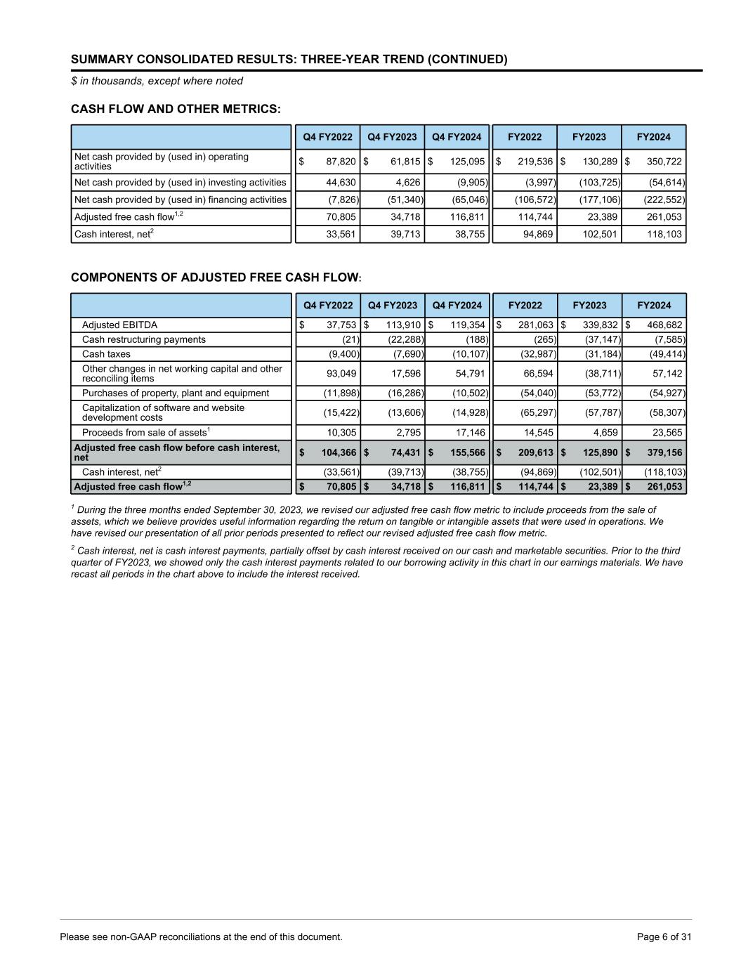 SUMMARY CONSOLIDATED RESULTS: THREE-YEAR TREND (CONTINUED) $ in thousands, except where noted CASH FLOW AND OTHER METRICS: Q4 FY2022 Q4 FY2023 Q4 FY2024 FY2022 FY2023 FY2024 Net cash provided by (used in) operating activities $ 87,820 $ 61,815 $ 125,095 $ 219,536 $ 130,289 $ 350,722 Net cash provided by (used in) investing activities 44,630 4,626 (9,905) (3,997) (103,725) (54,614) Net cash provided by (used in) financing activities (7,826) (51,340) (65,046) (106,572) (177,106) (222,552) Adjusted free cash flow1,2 70,805 34,718 116,811 114,744 23,389 261,053 Cash interest, net2 33,561 39,713 38,755 94,869 102,501 118,103 COMPONENTS OF ADJUSTED FREE CASH FLOW: Q4 FY2022 Q4 FY2023 Q4 FY2024 FY2022 FY2023 FY2024 Adjusted EBITDA $ 37,753 $ 113,910 $ 119,354 $ 281,063 $ 339,832 $ 468,682 Cash restructuring payments (21) (22,288) (188) (265) (37,147) (7,585) Cash taxes (9,400) (7,690) (10,107) (32,987) (31,184) (49,414) Other changes in net working capital and other reconciling items 93,049 17,596 54,791 66,594 (38,711) 57,142 Purchases of property, plant and equipment (11,898) (16,286) (10,502) (54,040) (53,772) (54,927) Capitalization of software and website development costs (15,422) (13,606) (14,928) (65,297) (57,787) (58,307) Proceeds from sale of assets1 10,305 2,795 17,146 14,545 4,659 23,565 Adjusted free cash flow before cash interest, net $ 104,366 $ 74,431 $ 155,566 $ 209,613 $ 125,890 $ 379,156 Cash interest, net2 (33,561) (39,713) (38,755) (94,869) (102,501) (118,103) Adjusted free cash flow1,2 $ 70,805 $ 34,718 $ 116,811 $ 114,744 $ 23,389 $ 261,053 1 During the three months ended September 30, 2023, we revised our adjusted free cash flow metric to include proceeds from the sale of assets, which we believe provides useful information regarding the return on tangible or intangible assets that were used in operations. We have revised our presentation of all prior periods presented to reflect our revised adjusted free cash flow metric. 2 Cash interest, net is cash interest payments, partially offset by cash interest received on our cash and marketable securities. Prior to the third quarter of FY2023, we showed only the cash interest payments related to our borrowing activity in this chart in our earnings materials. We have recast all periods in the chart above to include the interest received. Please see non-GAAP reconciliations at the end of this document. Page 6 of 31