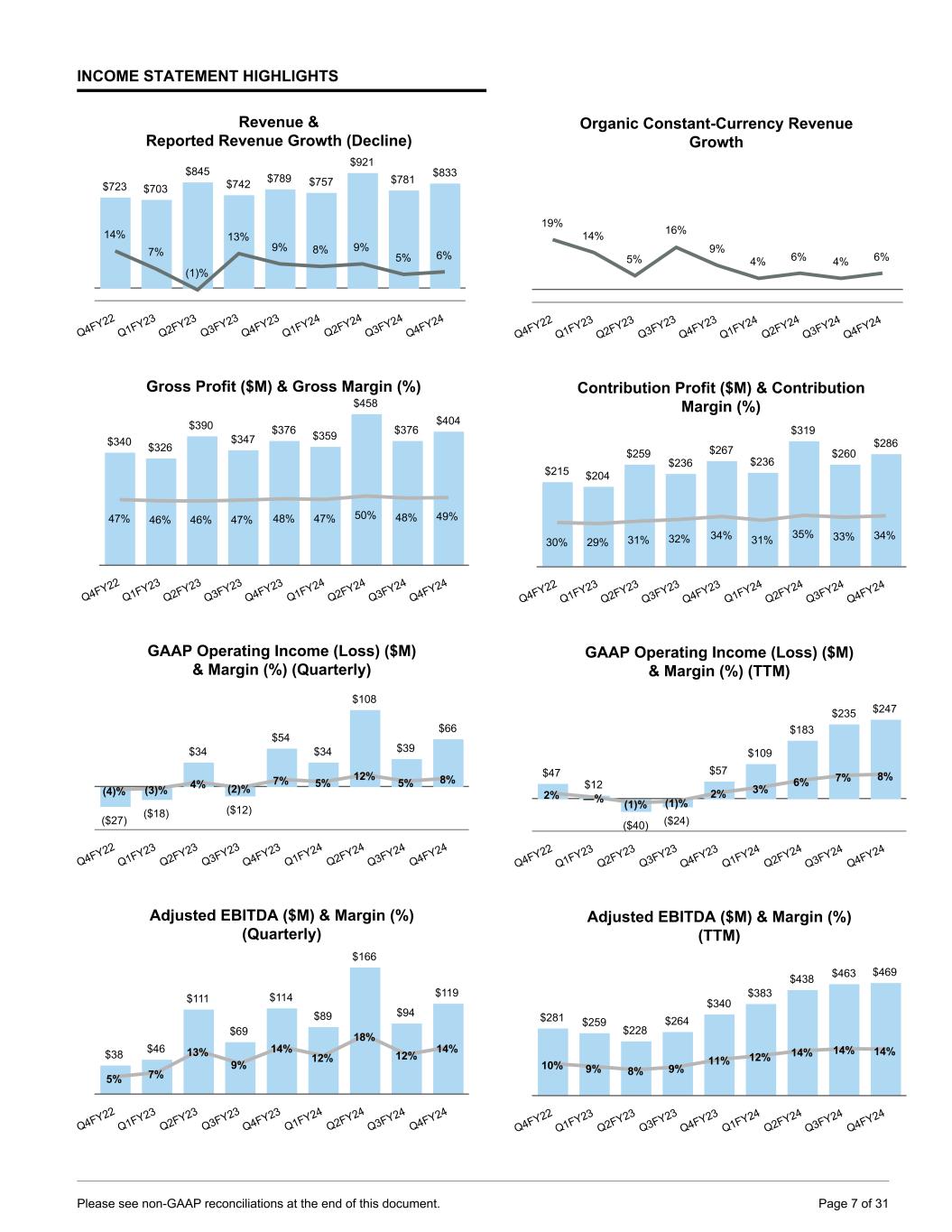 INCOME STATEMENT HIGHLIGHTS Revenue & Reported Revenue Growth (Decline) $723 $703 $845 $742 $789 $757 $921 $781 $833 14% 7% (1)% 13% 9% 8% 9% 5% 6% Q4FY22 Q1FY23 Q2FY23 Q3FY23 Q4FY23 Q1FY24 Q2FY24 Q3FY24 Q4FY24 Gross Profit ($M) & Gross Margin (%) $340 $326 $390 $347 $376 $359 $458 $376 $404 47% 46% 46% 47% 48% 47% 50% 48% 49% Q4FY22 Q1FY23 Q2FY23 Q3FY23 Q4FY23 Q1FY24 Q2FY24 Q3FY24 Q4FY24 GAAP Operating Income (Loss) ($M) & Margin (%) (Quarterly) ($27) ($18) $34 ($12) $54 $34 $108 $39 $66 (4)% (3)% 4% (2)% 7% 5% 12% 5% 8% Q4FY22 Q1FY23 Q2FY23 Q3FY23 Q4FY23 Q1FY24 Q2FY24 Q3FY24 Q4FY24 Adjusted EBITDA ($M) & Margin (%) (Quarterly) $38 $46 $111 $69 $114 $89 $166 $94 $119 5% 7% 13% 9% 14% 12% 18% 12% 14% Q4FY22 Q1FY23 Q2FY23 Q3FY23 Q4FY23 Q1FY24 Q2FY24 Q3FY24 Q4FY24 Organic Constant-Currency Revenue Growth 19% 14% 5% 16% 9% 4% 6% 4% 6% Q4FY22 Q1FY23 Q2FY23 Q3FY23 Q4FY23 Q1FY24 Q2FY24 Q3FY24 Q4FY24 Contribution Profit ($M) & Contribution Margin (%) $215 $204 $259 $236 $267 $236 $319 $260 $286 30% 29% 31% 32% 34% 31% 35% 33% 34% Q4FY22 Q1FY23 Q2FY23 Q3FY23 Q4FY23 Q1FY24 Q2FY24 Q3FY24 Q4FY24 GAAP Operating Income (Loss) ($M) & Margin (%) (TTM) $47 $12 ($40) ($24) $57 $109 $183 $235 $247 2% —% (1)% (1)% 2% 3% 6% 7% 8% Q4FY22 Q1FY23 Q2FY23 Q3FY23 Q4FY23 Q1FY24 Q2FY24 Q3FY24 Q4FY24 Adjusted EBITDA ($M) & Margin (%) (TTM) $281 $259 $228 $264 $340 $383 $438 $463 $469 10% 9% 8% 9% 11% 12% 14% 14% 14% Q4FY22 Q1FY23 Q2FY23 Q3FY23 Q4FY23 Q1FY24 Q2FY24 Q3FY24 Q4FY24 Please see non-GAAP reconciliations at the end of this document. Page 7 of 31
