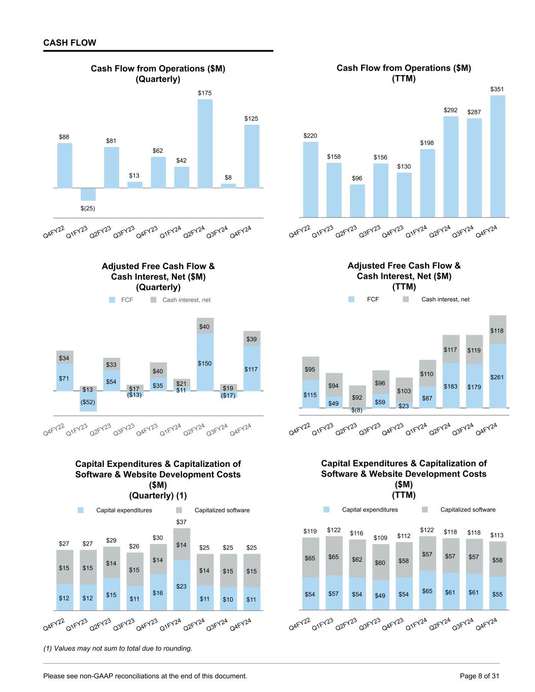 CASH FLOW Cash Flow from Operations ($M) (Quarterly) $88 $(25) $81 $13 $62 $42 $175 $8 $125 Q4FY22 Q1FY23 Q2FY23 Q3FY23 Q4FY23 Q1FY24 Q2FY24 Q3FY24 Q4FY24 Adjusted Free Cash Flow & Cash Interest, Net ($M) (Quarterly) $71 ($52) $54 ($13) $35 $11 $150 ($17) $117 $34 $13 $33 $17 $40 $21 $40 $19 $39 FCF Cash interest, net Q4FY22 Q1FY23 Q2FY23 Q3FY23 Q4FY23 Q1FY24 Q2FY24 Q3FY24 Q4FY24 Capital Expenditures & Capitalization of Software & Website Development Costs ($M) (Quarterly) (1) $12 $12 $15 $11 $16 $23 $11 $10 $11 $15 $15 $14 $15 $14 $14 $14 $15 $15 $27 $27 $29 $26 $30 $37 $25 $25 $25 Capital expenditures Capitalized software Q4FY22 Q1FY23 Q2FY23 Q3FY23 Q4FY23 Q1FY24 Q2FY24 Q3FY24 Q4FY24 (1) Values may not sum to total due to rounding. Cash Flow from Operations ($M) (TTM) $220 $158 $96 $156 $130 $198 $292 $287 $351 Q4FY22 Q1FY23 Q2FY23 Q3FY23 Q4FY23 Q1FY24 Q2FY24 Q3FY24 Q4FY24 Adjusted Free Cash Flow & Cash Interest, Net ($M) (TTM) $115 $49 $(8) $59 $23 $87 $183 $179 $261 $95 $94 $92 $96 $103 $110 $117 $119 $118 FCF Cash interest, net Q4FY22 Q1FY23 Q2FY23 Q3FY23 Q4FY23 Q1FY24 Q2FY24 Q3FY24 Q4FY24 Capital Expenditures & Capitalization of Software & Website Development Costs ($M) (TTM) $54 $57 $54 $49 $54 $65 $61 $61 $55 $65 $65 $62 $60 $58 $57 $57 $57 $58 $119 $122 $116 $109 $112 $122 $118 $118 $113 Capital expenditures Capitalized software Q4FY22 Q1FY23 Q2FY23 Q3FY23 Q4FY23 Q1FY24 Q2FY24 Q3FY24 Q4FY24 Please see non-GAAP reconciliations at the end of this document. Page 8 of 31