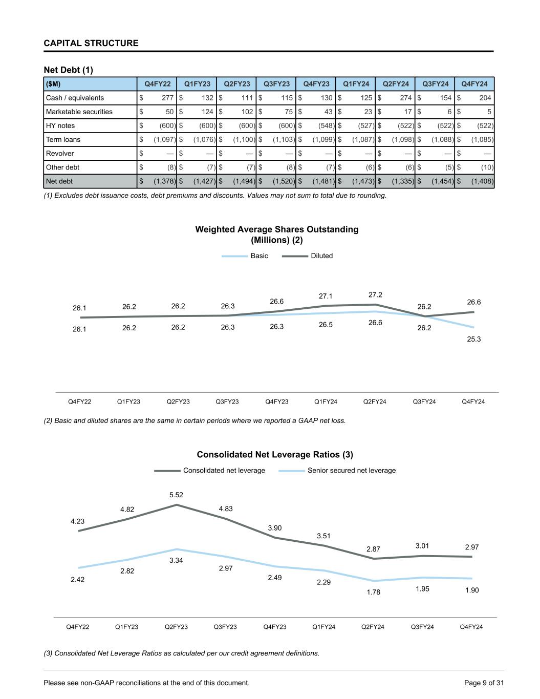 CAPITAL STRUCTURE Net Debt (1) ($M) Q4FY22 Q1FY23 Q2FY23 Q3FY23 Q4FY23 Q1FY24 Q2FY24 Q3FY24 Q4FY24 Cash / equivalents $ 277 $ 132 $ 111 $ 115 $ 130 $ 125 $ 274 $ 154 $ 204 Marketable securities $ 50 $ 124 $ 102 $ 75 $ 43 $ 23 $ 17 $ 6 $ 5 HY notes $ (600) $ (600) $ (600) $ (600) $ (548) $ (527) $ (522) $ (522) $ (522) Term loans $ (1,097) $ (1,076) $ (1,100) $ (1,103) $ (1,099) $ (1,087) $ (1,098) $ (1,088) $ (1,085) Revolver $ — $ — $ — $ — $ — $ — $ — $ — $ — Other debt $ (8) $ (7) $ (7) $ (8) $ (7) $ (6) $ (6) $ (5) $ (10) Net debt $ (1,378) $ (1,427) $ (1,494) $ (1,520) $ (1,481) $ (1,473) $ (1,335) $ (1,454) $ (1,408) (1) Excludes debt issuance costs, debt premiums and discounts. Values may not sum to total due to rounding. Weighted Average Shares Outstanding (Millions) (2) 26.1 26.2 26.2 26.3 26.3 26.5 26.6 26.2 25.3 26.1 26.2 26.2 26.3 26.6 27.1 27.2 26.2 26.6 Basic Diluted Q4FY22 Q1FY23 Q2FY23 Q3FY23 Q4FY23 Q1FY24 Q2FY24 Q3FY24 Q4FY24 (2) Basic and diluted shares are the same in certain periods where we reported a GAAP net loss. Consolidated Net Leverage Ratios (3) 4.23 4.82 5.52 4.83 3.90 3.51 2.87 3.01 2.97 2.42 2.82 3.34 2.97 2.49 2.29 1.78 1.95 1.90 Consolidated net leverage Senior secured net leverage Q4FY22 Q1FY23 Q2FY23 Q3FY23 Q4FY23 Q1FY24 Q2FY24 Q3FY24 Q4FY24 (3) Consolidated Net Leverage Ratios as calculated per our credit agreement definitions. Please see non-GAAP reconciliations at the end of this document. Page 9 of 31