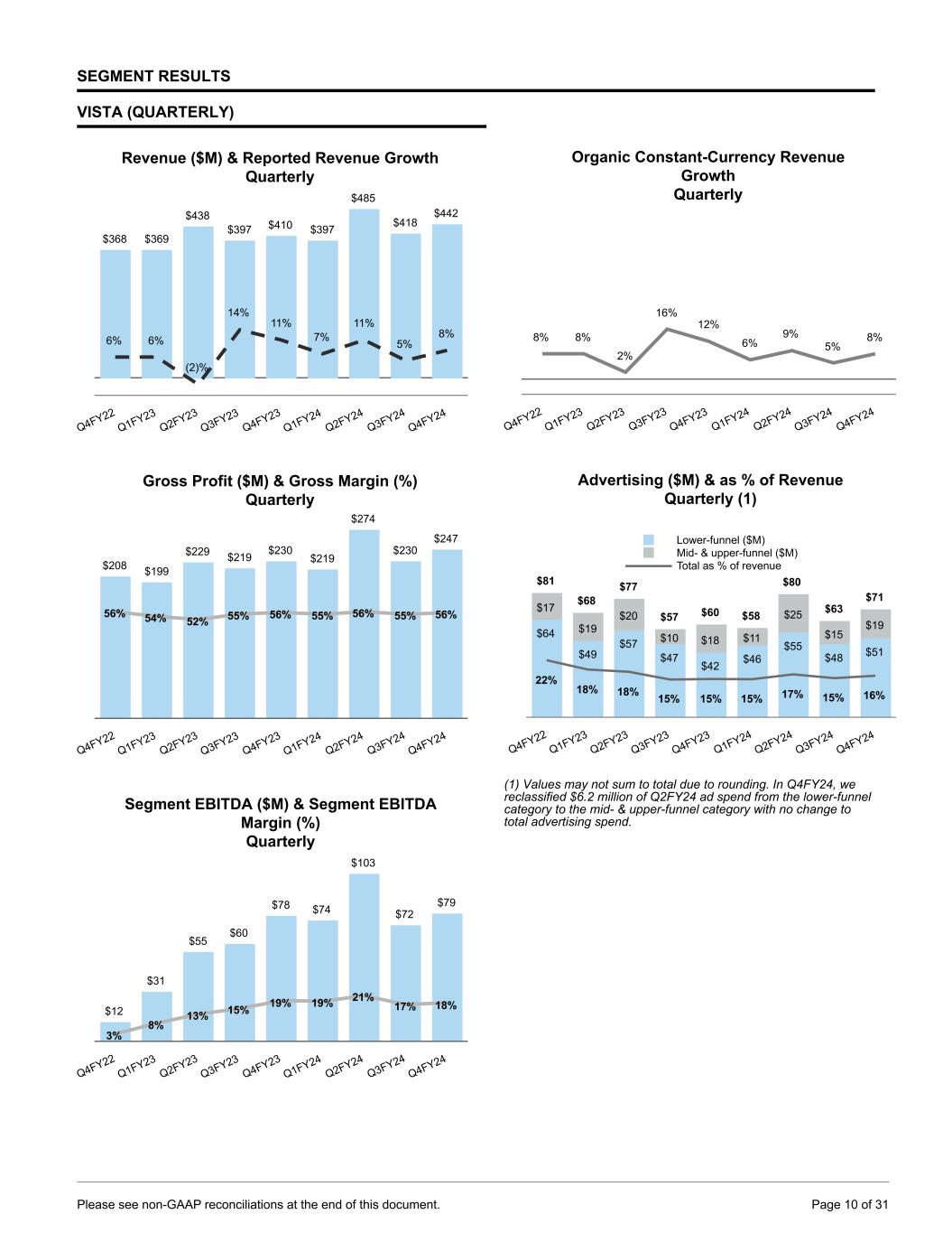 SEGMENT RESULTS VISTA (QUARTERLY) Revenue ($M) & Reported Revenue Growth Quarterly $368 $369 $438 $397 $410 $397 $485 $418 $442 6% 6% (2)% 14% 11% 7% 11% 5% 8% Q4FY22 Q1FY23 Q2FY23 Q3FY23 Q4FY23 Q1FY24 Q2FY24 Q3FY24 Q4FY24 Gross Profit ($M) & Gross Margin (%) Quarterly $208 $199 $229 $219 $230 $219 $274 $230 $247 56% 54% 52% 55% 56% 55% 56% 55% 56% Q4FY22 Q1FY23 Q2FY23 Q3FY23 Q4FY23 Q1FY24 Q2FY24 Q3FY24 Q4FY24 Segment EBITDA ($M) & Segment EBITDA Margin (%) Quarterly $12 $31 $55 $60 $78 $74 $103 $72 $79 3% 8% 13% 15% 19% 19% 21% 17% 18% Q4FY22 Q1FY23 Q2FY23 Q3FY23 Q4FY23 Q1FY24 Q2FY24 Q3FY24 Q4FY24 Organic Constant-Currency Revenue Growth Quarterly 8% 8% 2% 16% 12% 6% 9% 5% 8% Q4FY22 Q1FY23 Q2FY23 Q3FY23 Q4FY23 Q1FY24 Q2FY24 Q3FY24 Q4FY24 Advertising ($M) & as % of Revenue Quarterly (1) $81 $68 $77 $57 $60 $58 $80 $63 $71 $64 $49 $57 $47 $42 $46 $55 $48 $51 $17 $19 $20 $10 $18 $11 $25 $15 $19 22% 18% 18% 15% 15% 15% 17% 15% 16% Lower-funnel ($M) Mid- & upper-funnel ($M) Total as % of revenue Q4FY22 Q1FY23 Q2FY23 Q3FY23 Q4FY23 Q1FY24 Q2FY24 Q3FY24 Q4FY24 (1) Values may not sum to total due to rounding. In Q4FY24, we reclassified $6.2 million of Q2FY24 ad spend from the lower-funnel category to the mid- & upper-funnel category with no change to total advertising spend. Please see non-GAAP reconciliations at the end of this document. Page 10 of 31