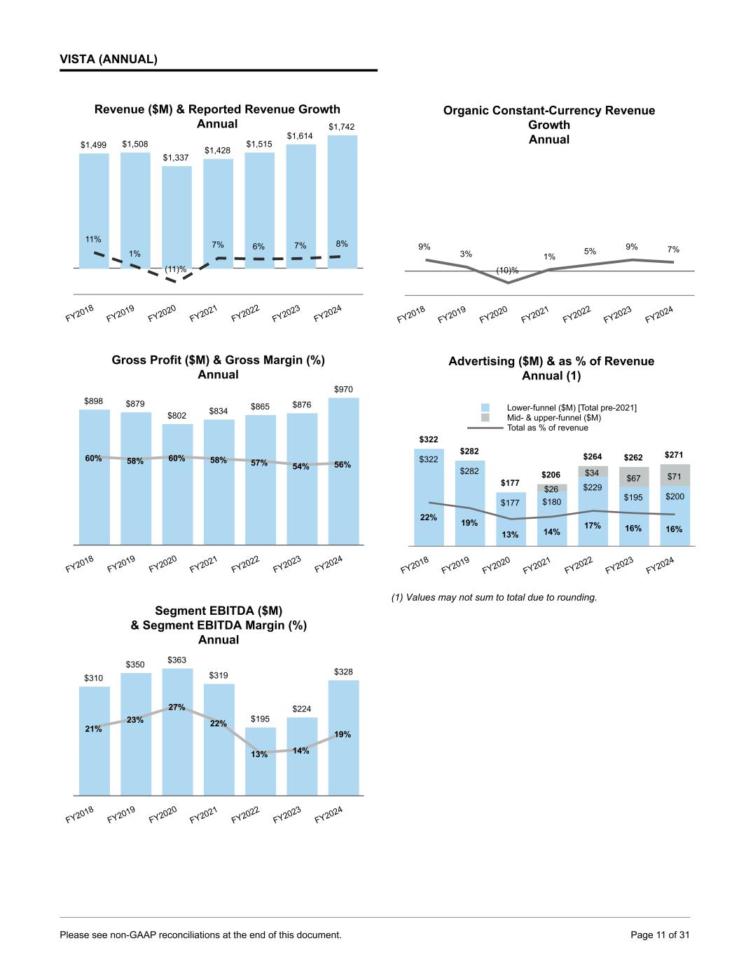 VISTA (ANNUAL) Revenue ($M) & Reported Revenue Growth Annual $1,499 $1,508 $1,337 $1,428 $1,515 $1,614 $1,742 11% 1% (11)% 7% 6% 7% 8% FY2018 FY2019 FY2020 FY2021 FY2022 FY2023 FY2024 Gross Profit ($M) & Gross Margin (%) Annual $898 $879 $802 $834 $865 $876 $970 60% 58% 60% 58% 57% 54% 56% FY2018 FY2019 FY2020 FY2021 FY2022 FY2023 FY2024 Segment EBITDA ($M) & Segment EBITDA Margin (%) Annual $310 $350 $363 $319 $195 $224 $328 21% 23% 27% 22% 13% 14% 19% FY2018 FY2019 FY2020 FY2021 FY2022 FY2023 FY2024 Organic Constant-Currency Revenue Growth Annual 9% 3% (10)% 1% 5% 9% 7% FY2018 FY2019 FY2020 FY2021 FY2022 FY2023 FY2024 Advertising ($M) & as % of Revenue Annual (1) $322 $282 $177 $206 $264 $262 $271$322 $282 $177 $180 $229 $195 $200 $26 $34 $67 $71 22% 19% 13% 14% 17% 16% 16% Lower-funnel ($M) [Total pre-2021] Mid- & upper-funnel ($M) Total as % of revenue FY2018 FY2019 FY2020 FY2021 FY2022 FY2023 FY2024 (1) Values may not sum to total due to rounding. Please see non-GAAP reconciliations at the end of this document. Page 11 of 31