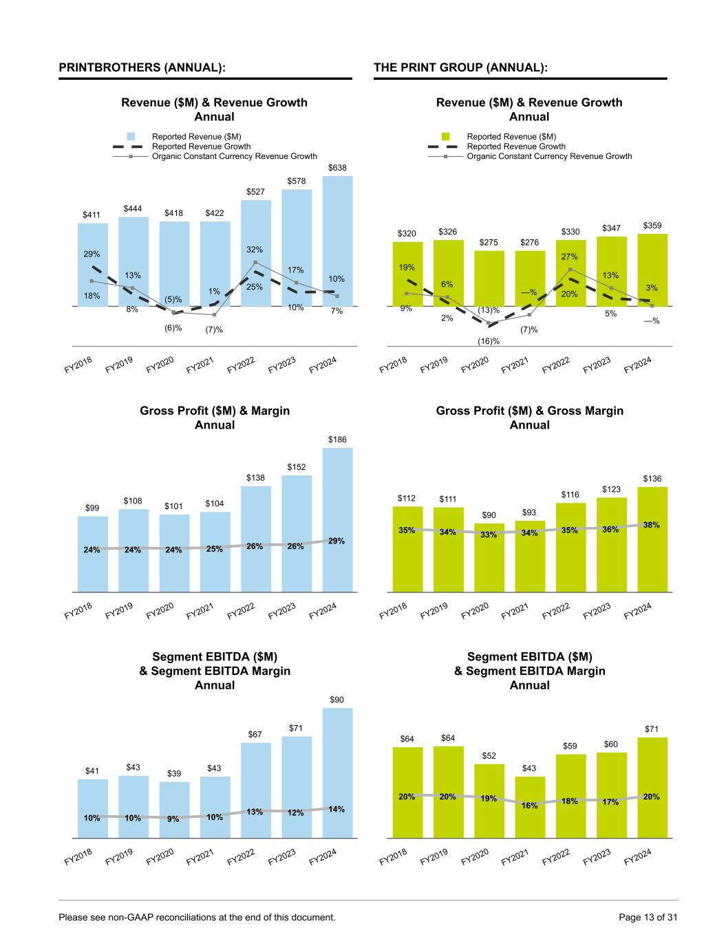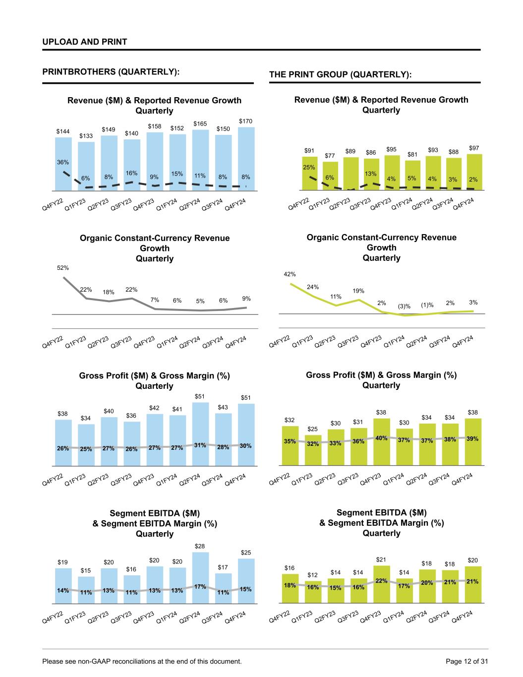 UPLOAD AND PRINT PRINTBROTHERS (QUARTERLY): Revenue ($M) & Reported Revenue Growth Quarterly $144 $133 $149 $140 $158 $152 $165 $150 $170 36% 6% 8% 16% 9% 15% 11% 8% 8% Q4FY22 Q1FY23 Q2FY23 Q3FY23 Q4FY23 Q1FY24 Q2FY24 Q3FY24 Q4FY24 Organic Constant-Currency Revenue Growth Quarterly 52% 22% 18% 22% 7% 6% 5% 6% 9% Q4FY22 Q1FY23 Q2FY23 Q3FY23 Q4FY23 Q1FY24 Q2FY24 Q3FY24 Q4FY24 Gross Profit ($M) & Gross Margin (%) Quarterly $38 $34 $40 $36 $42 $41 $51 $43 $51 26% 25% 27% 26% 27% 27% 31% 28% 30% Q4FY22 Q1FY23 Q2FY23 Q3FY23 Q4FY23 Q1FY24 Q2FY24 Q3FY24 Q4FY24 Segment EBITDA ($M) & Segment EBITDA Margin (%) Quarterly $19 $15 $20 $16 $20 $20 $28 $17 $25 14% 11% 13% 11% 13% 13% 17% 11% 15% Q4FY22 Q1FY23 Q2FY23 Q3FY23 Q4FY23 Q1FY24 Q2FY24 Q3FY24 Q4FY24 THE PRINT GROUP (QUARTERLY): Revenue ($M) & Reported Revenue Growth Quarterly $91 $77 $89 $86 $95 $81 $93 $88 $97 25% 6% 13% 4% 5% 4% 3% 2% Q4FY22 Q1FY23 Q2FY23 Q3FY23 Q4FY23 Q1FY24 Q2FY24 Q3FY24 Q4FY24 0 100 Organic Constant-Currency Revenue Growth Quarterly 42% 24% 11% 19% 2% (3)% (1)% 2% 3% Q4FY22 Q1FY23 Q2FY23 Q3FY23 Q4FY23 Q1FY24 Q2FY24 Q3FY24 Q4FY24 Gross Profit ($M) & Gross Margin (%) Quarterly $32 $25 $30 $31 $38 $30 $34 $34 $38 35% 32% 33% 36% 40% 37% 37% 38% 39% Q4FY22 Q1FY23 Q2FY23 Q3FY23 Q4FY23 Q1FY24 Q2FY24 Q3FY24 Q4FY24 Segment EBITDA ($M) & Segment EBITDA Margin (%) Quarterly $16 $12 $14 $14 $21 $14 $18 $18 $20 18% 16% 15% 16% 22% 17% 20% 21% 21% Q4FY22 Q1FY23 Q2FY23 Q3FY23 Q4FY23 Q1FY24 Q2FY24 Q3FY24 Q4FY24 Please see non-GAAP reconciliations at the end of this document. Page 12 of 31