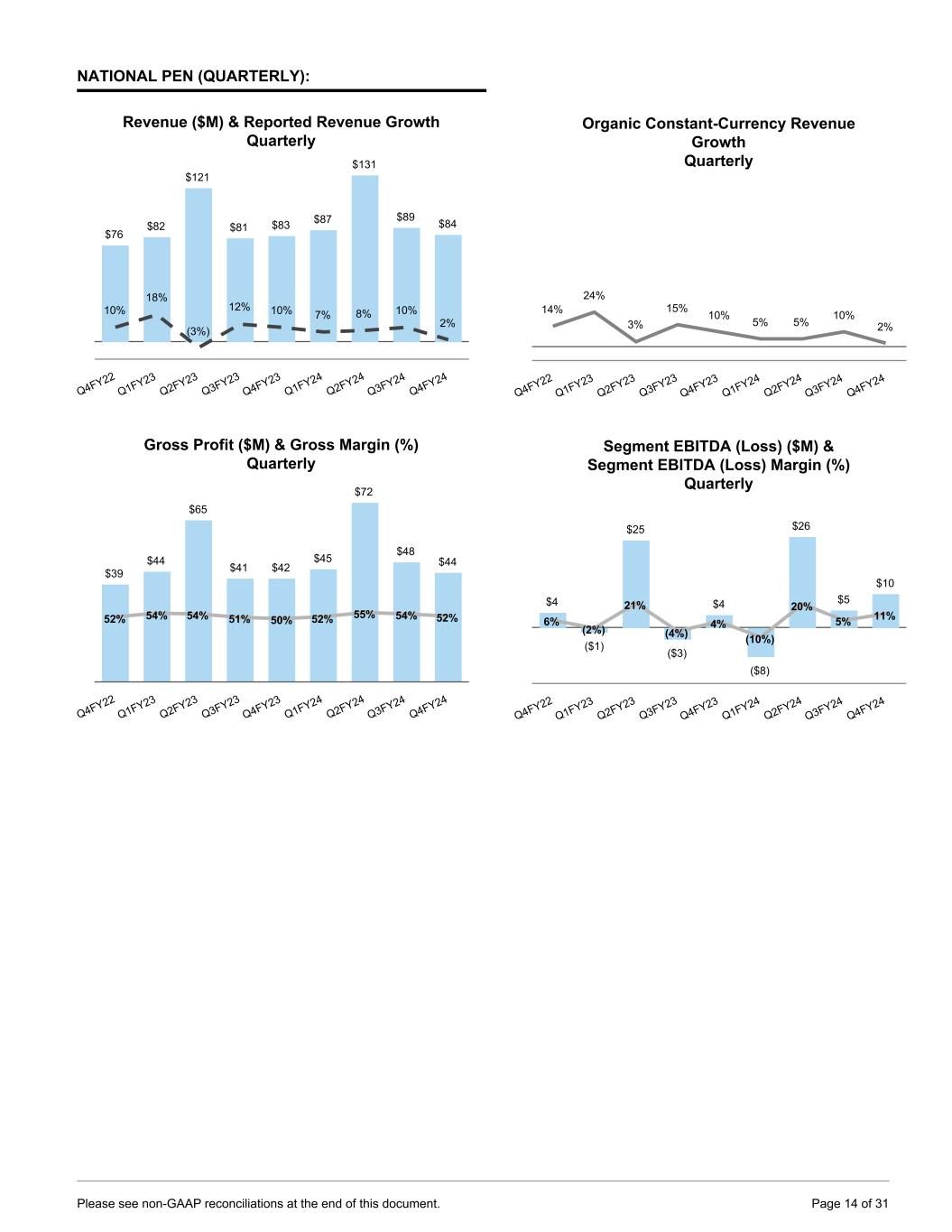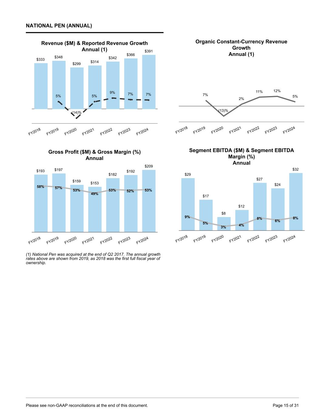 NATIONAL PEN (QUARTERLY): Revenue ($M) & Reported Revenue Growth Quarterly $76 $82 $121 $81 $83 $87 $131 $89 $84 10% 18% (3%) 12% 10% 7% 8% 10% 2% Q4FY22 Q1FY23 Q2FY23 Q3FY23 Q4FY23 Q1FY24 Q2FY24 Q3FY24 Q4FY24 Gross Profit ($M) & Gross Margin (%) Quarterly $39 $44 $65 $41 $42 $45 $72 $48 $44 52% 54% 54% 51% 50% 52% 55% 54% 52% Q4FY22 Q1FY23 Q2FY23 Q3FY23 Q4FY23 Q1FY24 Q2FY24 Q3FY24 Q4FY24 Organic Constant-Currency Revenue Growth Quarterly 14% 24% 3% 15% 10% 5% 5% 10% 2% Q4FY22 Q1FY23 Q2FY23 Q3FY23 Q4FY23 Q1FY24 Q2FY24 Q3FY24 Q4FY24 Segment EBITDA (Loss) ($M) & Segment EBITDA (Loss) Margin (%) Quarterly $4 ($1) $25 ($3) $4 ($8) $26 $5 $10 6% (2%) 21% (4%) 4% (10%) 20% 5% 11% Q4FY22 Q1FY23 Q2FY23 Q3FY23 Q4FY23 Q1FY24 Q2FY24 Q3FY24 Q4FY24 Please see non-GAAP reconciliations at the end of this document. Page 14 of 31
