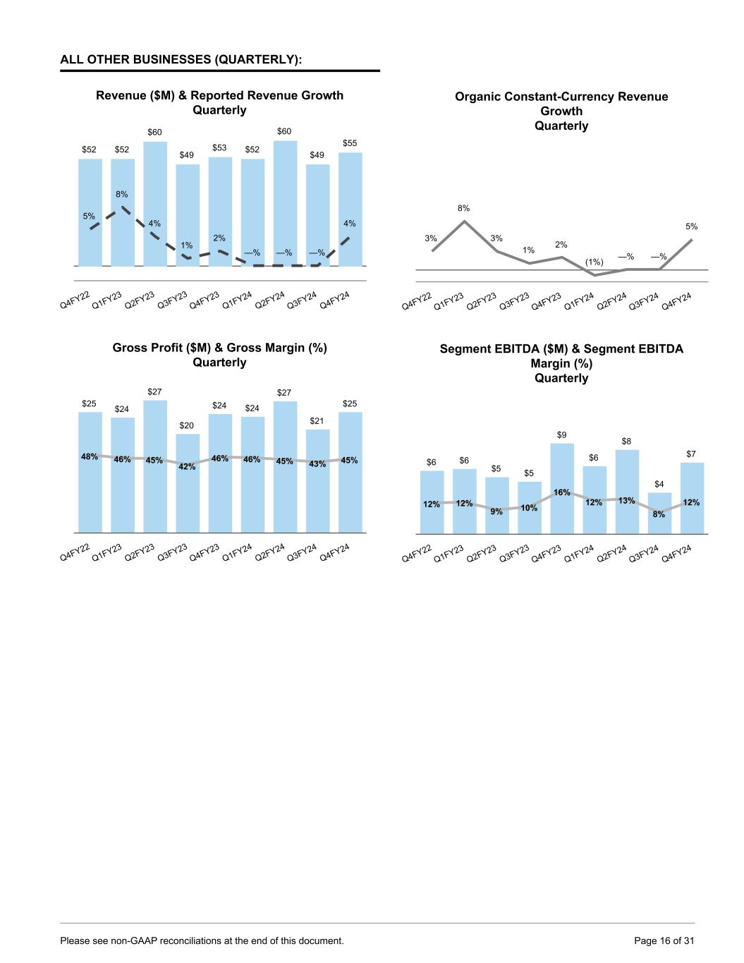 ALL OTHER BUSINESSES (QUARTERLY): Revenue ($M) & Reported Revenue Growth Quarterly $52 $52 $60 $49 $53 $52 $60 $49 $55 5% 8% 4% 1% 2% —% —% —% 4% Q4FY22 Q1FY23 Q2FY23 Q3FY23 Q4FY23 Q1FY24 Q2FY24 Q3FY24 Q4FY24 Gross Profit ($M) & Gross Margin (%) Quarterly $25 $24 $27 $20 $24 $24 $27 $21 $25 48% 46% 45% 42% 46% 46% 45% 43% 45% Q4FY22 Q1FY23 Q2FY23 Q3FY23 Q4FY23 Q1FY24 Q2FY24 Q3FY24 Q4FY24 Organic Constant-Currency Revenue Growth Quarterly 3% 8% 3% 1% 2% (1%) —% —% 5% Q4FY22 Q1FY23 Q2FY23 Q3FY23 Q4FY23 Q1FY24 Q2FY24 Q3FY24 Q4FY24 Segment EBITDA ($M) & Segment EBITDA Margin (%) Quarterly $6 $6 $5 $5 $9 $6 $8 $4 $7 12% 12% 9% 10% 16% 12% 13% 8% 12% Q4FY22 Q1FY23 Q2FY23 Q3FY23 Q4FY23 Q1FY24 Q2FY24 Q3FY24 Q4FY24 Please see non-GAAP reconciliations at the end of this document. Page 16 of 31