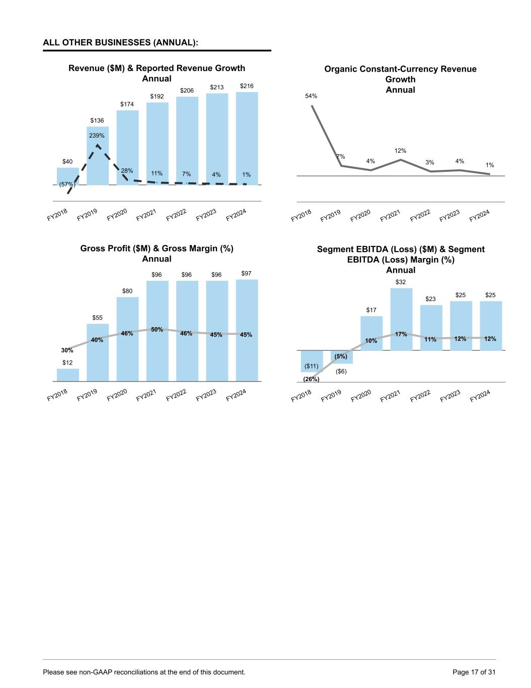 ALL OTHER BUSINESSES (ANNUAL): Revenue ($M) & Reported Revenue Growth Annual $40 $136 $174 $192 $206 $213 $216 (57%) 239% 28% 11% 7% 4% 1% FY2018 FY2019 FY2020 FY2021 FY2022 FY2023 FY2024 Gross Profit ($M) & Gross Margin (%) Annual $12 $55 $80 $96 $96 $96 $97 30% 40% 46% 50% 46% 45% 45% FY2018 FY2019 FY2020 FY2021 FY2022 FY2023 FY2024 Organic Constant-Currency Revenue Growth Annual 54% 7% 4% 12% 3% 4% 1% FY2018 FY2019 FY2020 FY2021 FY2022 FY2023 FY2024 Segment EBITDA (Loss) ($M) & Segment EBITDA (Loss) Margin (%) Annual ($11) ($6) $17 $32 $23 $25 $25 (26%) (5%) 10% 17% 11% 12% 12% FY2018 FY2019 FY2020 FY2021 FY2022 FY2023 FY2024 Please see non-GAAP reconciliations at the end of this document. Page 17 of 31