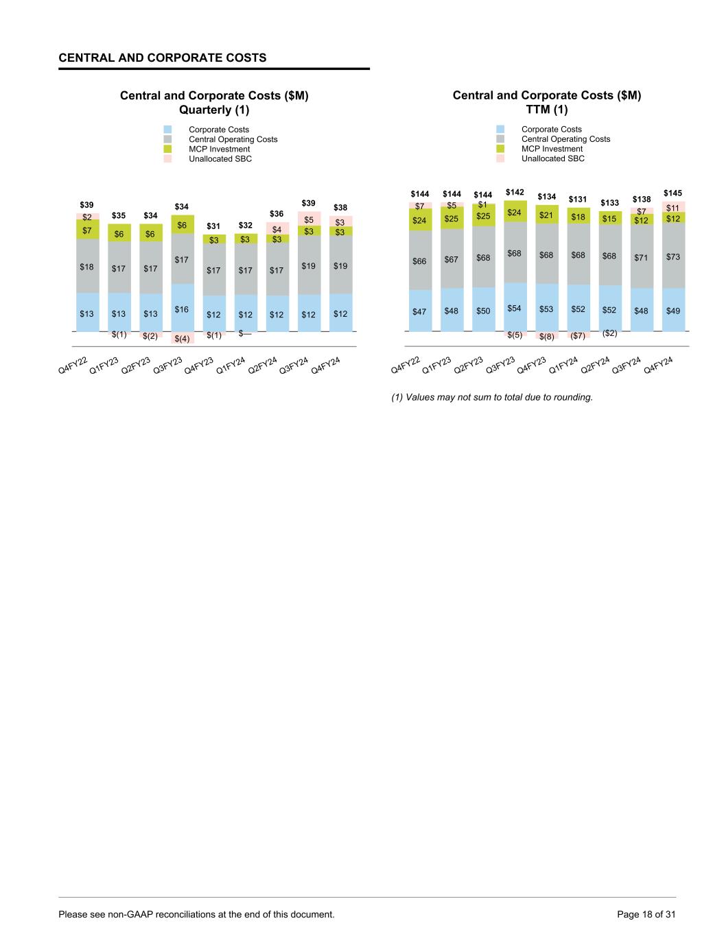 CENTRAL AND CORPORATE COSTS Central and Corporate Costs ($M) Quarterly (1) $13 $13 $13 $16 $12 $12 $12 $12 $12 $18 $17 $17 $17 $17 $17 $17 $19 $19 $7 $6 $6 $6 $3 $3 $3 $3 $3 $2 $(1) $(2) $(4) $(1) $— $4 $5 $3 $39 $35 $34 $34 $31 $32 $36 $39 $38 Corporate Costs Central Operating Costs MCP Investment Unallocated SBC Q4FY22 Q1FY23 Q2FY23 Q3FY23 Q4FY23 Q1FY24 Q2FY24 Q3FY24 Q4FY24 Central and Corporate Costs ($M) TTM (1) $47 $48 $50 $54 $53 $52 $52 $48 $49 $66 $67 $68 $68 $68 $68 $68 $71 $73 $24 $25 $25 $24 $21 $18 $15 $12 $12 $7 $5 $1 $(5) $(8) ($7) ($2) $7 $11 $144 $144 $144 $142 $134 $131 $133 $138 $145 Corporate Costs Central Operating Costs MCP Investment Unallocated SBC Q4FY22 Q1FY23 Q2FY23 Q3FY23 Q4FY23 Q1FY24 Q2FY24 Q3FY24 Q4FY24 (1) Values may not sum to total due to rounding. Please see non-GAAP reconciliations at the end of this document. Page 18 of 31