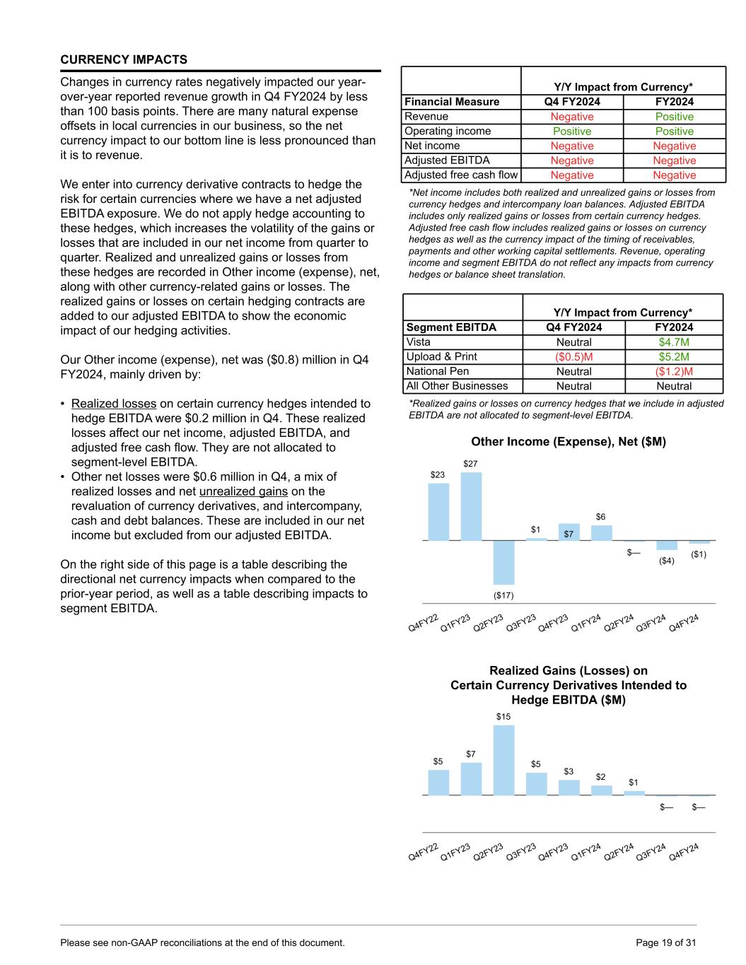 CURRENCY IMPACTS Changes in currency rates negatively impacted our year- over-year reported revenue growth in Q4 FY2024 by less than 100 basis points. There are many natural expense offsets in local currencies in our business, so the net currency impact to our bottom line is less pronounced than it is to revenue. We enter into currency derivative contracts to hedge the risk for certain currencies where we have a net adjusted EBITDA exposure. We do not apply hedge accounting to these hedges, which increases the volatility of the gains or losses that are included in our net income from quarter to quarter. Realized and unrealized gains or losses from these hedges are recorded in Other income (expense), net, along with other currency-related gains or losses. The realized gains or losses on certain hedging contracts are added to our adjusted EBITDA to show the economic impact of our hedging activities. Our Other income (expense), net was ($0.8) million in Q4 FY2024, mainly driven by: • Realized losses on certain currency hedges intended to hedge EBITDA were $0.2 million in Q4. These realized losses affect our net income, adjusted EBITDA, and adjusted free cash flow. They are not allocated to segment-level EBITDA. • Other net losses were $0.6 million in Q4, a mix of realized losses and net unrealized gains on the revaluation of currency derivatives, and intercompany, cash and debt balances. These are included in our net income but excluded from our adjusted EBITDA. On the right side of this page is a table describing the directional net currency impacts when compared to the prior-year period, as well as a table describing impacts to segment EBITDA. Y/Y Impact from Currency* Financial Measure Q4 FY2024 FY2024 Revenue Negative Positive Operating income Positive Positive Net income Negative Negative Adjusted EBITDA Negative Negative Adjusted free cash flow Negative Negative *Net income includes both realized and unrealized gains or losses from currency hedges and intercompany loan balances. Adjusted EBITDA includes only realized gains or losses from certain currency hedges. Adjusted free cash flow includes realized gains or losses on currency hedges as well as the currency impact of the timing of receivables, payments and other working capital settlements. Revenue, operating income and segment EBITDA do not reflect any impacts from currency hedges or balance sheet translation. Y/Y Impact from Currency* Segment EBITDA Q4 FY2024 FY2024 Vista Neutral $4.7M Upload & Print ($0.5)M $5.2M National Pen Neutral ($1.2)M All Other Businesses Neutral Neutral *Realized gains or losses on currency hedges that we include in adjusted EBITDA are not allocated to segment-level EBITDA. Other Income (Expense), Net ($M) $23 $27 ($17) $1 $7 $6 $— ($4) ($1) Q4FY22 Q1FY23 Q2FY23 Q3FY23 Q4FY23 Q1FY24 Q2FY24 Q3FY24 Q4FY24 Realized Gains (Losses) on Certain Currency Derivatives Intended to Hedge EBITDA ($M) $5 $7 $15 $5 $3 $2 $1 $— $— Q4FY22 Q1FY23 Q2FY23 Q3FY23 Q4FY23 Q1FY24 Q2FY24 Q3FY24 Q4FY24 Please see non-GAAP reconciliations at the end of this document. Page 19 of 31