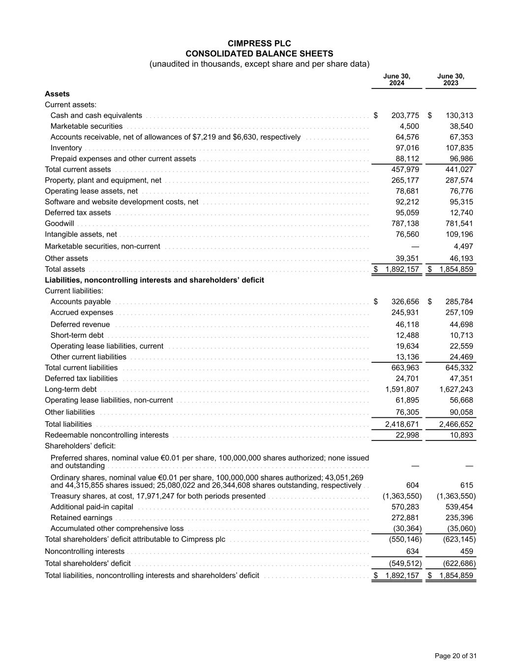 CIMPRESS PLC CONSOLIDATED BALANCE SHEETS (unaudited in thousands, except share and per share data) June 30, 2024 June 30, 2023 Assets Current assets: Cash and cash equivalents . . . . . . . . . . . . . . . . . . . . . . . . . . . . . . . . . . . . . . . . . . . . . . . . . . . . . . . . . . . $ 203,775 $ 130,313 Marketable securities . . . . . . . . . . . . . . . . . . . . . . . . . . . . . . . . . . . . . . . . . . . . . . . . . . . . . . . . . . . . . . . . 4,500 38,540 Accounts receivable, net of allowances of $7,219 and $6,630, respectively . . . . . . . . . . . . . . . . . 64,576 67,353 Inventory . . . . . . . . . . . . . . . . . . . . . . . . . . . . . . . . . . . . . . . . . . . . . . . . . . . . . . . . . . . . . . . . . . . . . . . . . . . 97,016 107,835 Prepaid expenses and other current assets . . . . . . . . . . . . . . . . . . . . . . . . . . . . . . . . . . . . . . . . . . . . . 88,112 96,986 Total current assets . . . . . . . . . . . . . . . . . . . . . . . . . . . . . . . . . . . . . . . . . . . . . . . . . . . . . . . . . . . . . . . . . . . 457,979 441,027 Property, plant and equipment, net . . . . . . . . . . . . . . . . . . . . . . . . . . . . . . . . . . . . . . . . . . . . . . . . . . . . . . 265,177 287,574 Operating lease assets, net . . . . . . . . . . . . . . . . . . . . . . . . . . . . . . . . . . . . . . . . . . . . . . . . . . . . . . . . . . . . 78,681 76,776 Software and website development costs, net . . . . . . . . . . . . . . . . . . . . . . . . . . . . . . . . . . . . . . . . . . . . 92,212 95,315 Deferred tax assets . . . . . . . . . . . . . . . . . . . . . . . . . . . . . . . . . . . . . . . . . . . . . . . . . . . . . . . . . . . . . . . . . . . 95,059 12,740 Goodwill . . . . . . . . . . . . . . . . . . . . . . . . . . . . . . . . . . . . . . . . . . . . . . . . . . . . . . . . . . . . . . . . . . . . . . . . . . . . . 787,138 781,541 Intangible assets, net . . . . . . . . . . . . . . . . . . . . . . . . . . . . . . . . . . . . . . . . . . . . . . . . . . . . . . . . . . . . . . . . . . 76,560 109,196 Marketable securities, non-current . . . . . . . . . . . . . . . . . . . . . . . . . . . . . . . . . . . . . . . . . . . . . . . . . . . . . . — 4,497 Other assets . . . . . . . . . . . . . . . . . . . . . . . . . . . . . . . . . . . . . . . . . . . . . . . . . . . . . . . . . . . . . . . . . . . . . . . . . 39,351 46,193 Total assets . . . . . . . . . . . . . . . . . . . . . . . . . . . . . . . . . . . . . . . . . . . . . . . . . . . . . . . . . . . . . . . . . . . . . . . . . . $ 1,892,157 $ 1,854,859 Liabilities, noncontrolling interests and shareholders’ deficit Current liabilities: Accounts payable . . . . . . . . . . . . . . . . . . . . . . . . . . . . . . . . . . . . . . . . . . . . . . . . . . . . . . . . . . . . . . . . . . . $ 326,656 $ 285,784 Accrued expenses . . . . . . . . . . . . . . . . . . . . . . . . . . . . . . . . . . . . . . . . . . . . . . . . . . . . . . . . . . . . . . . . . . . 245,931 257,109 Deferred revenue . . . . . . . . . . . . . . . . . . . . . . . . . . . . . . . . . . . . . . . . . . . . . . . . . . . . . . . . . . . . . . . . . . . 46,118 44,698 Short-term debt . . . . . . . . . . . . . . . . . . . . . . . . . . . . . . . . . . . . . . . . . . . . . . . . . . . . . . . . . . . . . . . . . . . . . 12,488 10,713 Operating lease liabilities, current . . . . . . . . . . . . . . . . . . . . . . . . . . . . . . . . . . . . . . . . . . . . . . . . . . . . . 19,634 22,559 Other current liabilities . . . . . . . . . . . . . . . . . . . . . . . . . . . . . . . . . . . . . . . . . . . . . . . . . . . . . . . . . . . . . . . 13,136 24,469 Total current liabilities . . . . . . . . . . . . . . . . . . . . . . . . . . . . . . . . . . . . . . . . . . . . . . . . . . . . . . . . . . . . . . . . . 663,963 645,332 Deferred tax liabilities . . . . . . . . . . . . . . . . . . . . . . . . . . . . . . . . . . . . . . . . . . . . . . . . . . . . . . . . . . . . . . . . . 24,701 47,351 Long-term debt . . . . . . . . . . . . . . . . . . . . . . . . . . . . . . . . . . . . . . . . . . . . . . . . . . . . . . . . . . . . . . . . . . . . . . . 1,591,807 1,627,243 Operating lease liabilities, non-current . . . . . . . . . . . . . . . . . . . . . . . . . . . . . . . . . . . . . . . . . . . . . . . . . . . 61,895 56,668 Other liabilities . . . . . . . . . . . . . . . . . . . . . . . . . . . . . . . . . . . . . . . . . . . . . . . . . . . . . . . . . . . . . . . . . . . . . . . 76,305 90,058 Total liabilities . . . . . . . . . . . . . . . . . . . . . . . . . . . . . . . . . . . . . . . . . . . . . . . . . . . . . . . . . . . . . . . . . . . . . . . . 2,418,671 2,466,652 Redeemable noncontrolling interests . . . . . . . . . . . . . . . . . . . . . . . . . . . . . . . . . . . . . . . . . . . . . . . . . . . . 22,998 10,893 Shareholders’ deficit: Preferred shares, nominal value €0.01 per share, 100,000,000 shares authorized; none issued and outstanding . . . . . . . . . . . . . . . . . . . . . . . . . . . . . . . . . . . . . . . . . . . . . . . . . . . . . . . . . . . . . . . . . . . . . — — Ordinary shares, nominal value €0.01 per share, 100,000,000 shares authorized; 43,051,269 and 44,315,855 shares issued; 25,080,022 and 26,344,608 shares outstanding, respectively . . 604 615 Treasury shares, at cost, 17,971,247 for both periods presented . . . . . . . . . . . . . . . . . . . . . . . . . . . (1,363,550) (1,363,550) Additional paid-in capital . . . . . . . . . . . . . . . . . . . . . . . . . . . . . . . . . . . . . . . . . . . . . . . . . . . . . . . . . . . . . 570,283 539,454 Retained earnings . . . . . . . . . . . . . . . . . . . . . . . . . . . . . . . . . . . . . . . . . . . . . . . . . . . . . . . . . . . . . . . . . . . 272,881 235,396 Accumulated other comprehensive loss . . . . . . . . . . . . . . . . . . . . . . . . . . . . . . . . . . . . . . . . . . . . . . . . (30,364) (35,060) Total shareholders’ deficit attributable to Ci