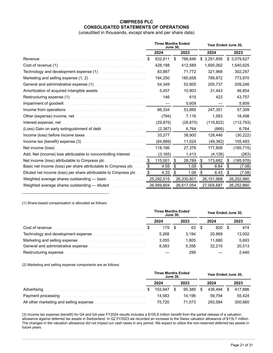 CIMPRESS PLC CONSOLIDATED STATEMENTS OF OPERATIONS (unaudited in thousands, except share and per share data) Three Months Ended June 30, Year Ended June 30, 2024 2023 2024 2023 Revenue . . . . . . . . . . . . . . . . . . . . . . . . . . . . . . . . . . . . . . . . . . . . . . . . . . . . $ 832,611 $ 788,846 $ 3,291,856 $ 3,079,627 Cost of revenue (1) . . . . . . . . . . . . . . . . . . . . . . . . . . . . . . . . . . . . . . . . . . . 428,188 412,589 1,695,062 1,640,625 Technology and development expense (1) . . . . . . . . . . . . . . . . . . . . . . . 83,887 71,772 321,968 302,257 Marketing and selling expense (1, 2) . . . . . . . . . . . . . . . . . . . . . . . . . . . . 194,250 180,658 789,872 773,970 General and administrative expense (1) . . . . . . . . . . . . . . . . . . . . . . . . . 54,349 52,805 205,737 209,246 Amortization of acquired intangible assets . . . . . . . . . . . . . . . . . . . . . . . 5,457 10,903 31,443 46,854 Restructuring expense (1) . . . . . . . . . . . . . . . . . . . . . . . . . . . . . . . . . . . . . 146 615 423 43,757 Impairment of goodwill . . . . . . . . . . . . . . . . . . . . . . . . . . . . . . . . . . . . . . . . — 5,609 — 5,609 Income from operations . . . . . . . . . . . . . . . . . . . . . . . . . . . . . . . . . . . . . . . 66,334 53,895 247,351 57,309 Other (expense) income, net . . . . . . . . . . . . . . . . . . . . . . . . . . . . . . . . . . . (794) 7,116 1,583 18,498 Interest expense, net . . . . . . . . . . . . . . . . . . . . . . . . . . . . . . . . . . . . . . . . . . (29,876) (28,875) (119,822) (112,793) (Loss) Gain on early extinguishment of debt . . . . . . . . . . . . . . . . . . . . . . (2,387) 6,764 (666) 6,764 Income (loss) before income taxes . . . . . . . . . . . . . . . . . . . . . . . . . . . . . . 33,277 38,900 128,446 (30,222) Income tax (benefit) expense (3) . . . . . . . . . . . . . . . . . . . . . . . . . . . . . . . (84,889) 11,524 (49,362) 155,493 Net income (loss) . . . . . . . . . . . . . . . . . . . . . . . . . . . . . . . . . . . . . . . . . . . . . 118,166 27,376 177,808 (185,715) Add: Net (income) loss attributable to noncontrolling interest . . . . . . . (3,165) 1,413 (4,126) (263) Net income (loss) attributable to Cimpress plc . . . . . . . . . . . . . . . . . . . . $ 115,001 $ 28,789 $ 173,682 $ (185,978) Basic net income (loss) per share attributable to Cimpress plc . . . . . . $ 4.55 $ 1.09 $ 6.64 $ (7.08) Diluted net income (loss) per share attributable to Cimpress plc . . . . $ 4.33 $ 1.08 $ 6.43 $ (7.08) Weighted average shares outstanding — basic . . . . . . . . . . . . . . . . . . . 25,292,515 26,330,801 26,151,968 26,252,860 Weighted average shares outstanding — diluted . . . . . . . . . . . . . . . . . . 26,569,804 26,617,054 27,004,687 26,252,860 ____________________________________________ (1) Share-based compensation is allocated as follows: Three Months Ended June 30, Year Ended June 30, 2024 2023 2024 2023 Cost of revenue . . . . . . . . . . . . . . . . . . . . . . . . . . . . . . . . . . . . . . . . . . . . . . $ 179 $ 63 $ 820 $ 474 Technology and development expense . . . . . . . . . . . . . . . . . . . . . . . . . . 5,268 3,194 20,869 13,002 Marketing and selling expense . . . . . . . . . . . . . . . . . . . . . . . . . . . . . . . . . 3,055 1,805 11,680 5,693 General and administrative expense . . . . . . . . . . . . . . . . . . . . . . . . . . . . 8,583 5,356 32,215 20,513 Restructuring expense . . . . . . . . . . . . . . . . . . . . . . . . . . . . . . . . . . . . . . . . — 299 — 2,440 (2) Marketing and selling expense components are as follows: Three Months Ended June 30, Year Ended June 30, 2024 2023 2024 2023 Advertising . . . . . . . . . . . . . . . . . . . . . . . . . . . . . . . . . . . . . . . . . . . . . . . . . . $ 103,947 $ 95,389 $ 436,494 $ 417,886 Payment processing . . . . . . . . . . . . . . . . . . . . . . . . . . . . . . . . . . . . . . . . . . 14,583 14,196 59,794 55,424 All other marketing and selling expense . . . . . . . . . . . . . . . . . . . . . . . . . 75,720 71,073 293,584 300,660 (3) Income tax expense (benefit) for Q4 and full-year FY2024 results includes a $105.8 million benefit from the partial release of a valuation allowance against deferred tax assets in Switzerland. In Q2 FY2023 we recorded an increase to the Swiss valuation allowance of $116.7 million. The changes in the valuation allowance did not impact our cash taxes in any period. We expect to utilize the non-reserved deferred tax assets in future years. Page 21 of 31