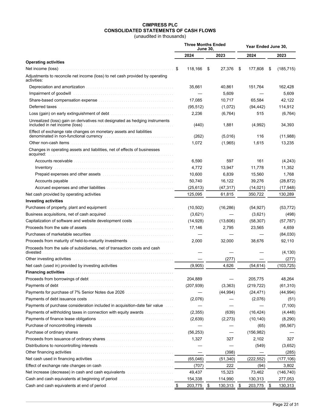 CIMPRESS PLC CONSOLIDATED STATEMENTS OF CASH FLOWS (unaudited in thousands) Three Months Ended June 30, Year Ended June 30, 2024 2023 2024 2023 Operating activities Net income (loss) . . . . . . . . . . . . . . . . . . . . . . . . . . . . . . . . . . . . . . . . . . . . . . . . . . . . . . $ 118,166 $ 27,376 $ 177,808 $ (185,715) Adjustments to reconcile net income (loss) to net cash provided by operating activities: Depreciation and amortization . . . . . . . . . . . . . . . . . . . . . . . . . . . . . . . . . . . . . . . . . . 35,661 40,861 151,764 162,428 Impairment of goodwill . . . . . . . . . . . . . . . . . . . . . . . . . . . . . . . . . . . . . . . . . . . . . . . . — 5,609 — 5,609 Share-based compensation expense . . . . . . . . . . . . . . . . . . . . . . . . . . . . . . . . . . . . 17,085 10,717 65,584 42,122 Deferred taxes . . . . . . . . . . . . . . . . . . . . . . . . . . . . . . . . . . . . . . . . . . . . . . . . . . . . . . . (95,512) (1,072) (94,442) 114,912 Loss (gain) on early extinguishment of debt . . . . . . . . . . . . . . . . . . . . . . . . . . . . . . 2,236 (6,764) 515 (6,764) Unrealized (loss) gain on derivatives not designated as hedging instruments included in net income (loss) . . . . . . . . . . . . . . . . . . . . . . . . . . . . . . . . . . . . . . . . . . . (440) 1,881 (4,992) 34,393 Effect of exchange rate changes on monetary assets and liabilities denominated in non-functional currency . . . . . . . . . . . . . . . . . . . . . . . . . . . . . . . . . (262) (5,016) 116 (11,988) Other non-cash items . . . . . . . . . . . . . . . . . . . . . . . . . . . . . . . . . . . . . . . . . . . . . . . . . 1,072 (1,965) 1,615 13,235 Changes in operating assets and liabilities, net of effects of businesses acquired: . . . . . . . . . . . . . . . . . . . . . . . . . . . . . . . . . . . . . . . . . . . . . . . . . . . . . . . . . . . . Accounts receivable . . . . . . . . . . . . . . . . . . . . . . . . . . . . . . . . . . . . . . . . . . . . . . . . 6,590 597 161 (4,243) Inventory . . . . . . . . . . . . . . . . . . . . . . . . . . . . . . . . . . . . . . . . . . . . . . . . . . . . . . . . . 4,772 13,947 11,778 11,352 Prepaid expenses and other assets . . . . . . . . . . . . . . . . . . . . . . . . . . . . . . . . . . 10,600 6,839 15,560 1,768 Accounts payable . . . . . . . . . . . . . . . . . . . . . . . . . . . . . . . . . . . . . . . . . . . . . . . . . . 50,740 16,122 39,276 (28,872) Accrued expenses and other liabilities . . . . . . . . . . . . . . . . . . . . . . . . . . . . . . . . (25,613) (47,317) (14,021) (17,948) Net cash provided by operating activities 125,095 61,815 350,722 130,289 Investing activities Purchases of property, plant and equipment . . . . . . . . . . . . . . . . . . . . . . . . . . . . . . . (10,502) (16,286) (54,927) (53,772) Business acquisitions, net of cash acquired . . . . . . . . . . . . . . . . . . . . . . . . . . . . . . . . (3,621) — (3,621) (498) Capitalization of software and website development costs . . . . . . . . . . . . . . . . . . . (14,928) (13,606) (58,307) (57,787) Proceeds from the sale of assets . . . . . . . . . . . . . . . . . . . . . . . . . . . . . . . . . . . . . . . . . 17,146 2,795 23,565 4,659 Purchases of marketable securities . . . . . . . . . . . . . . . . . . . . . . . . . . . . . . . . . . . . . . . — — — (84,030) Proceeds from maturity of held-to-maturity investments . . . . . . . . . . . . . . . . . . . . . 2,000 32,000 38,676 92,110 Proceeds from the sale of subsidiaries, net of transaction costs and cash divested . . . . . . . . . . . . . . . . . . . . . . . . . . . . . . . . . . . . . . . . . . . . . . . . . . . . . . . . . . . . . . . — — — (4,130) Other investing activities . . . . . . . . . . . . . . . . . . . . . . . . . . . . . . . . . . . . . . . . . . . . . . . . — (277) — (277) Net cash (used in) provided by investing activities (9,905) 4,626 (54,614) (103,725) Financing activities . . . . . . . . . . . . . . . . . . . . . . . . . . . . . . . . . . . . . . . . . . . . . . . . . . . Proceeds from borrowings of debt . . . . . . . . . . . . . . . . . . . . . . . . . . . . . . . . . . . . . . . . 204,889 — 205,775 48,264 Payments of debt . . . . . . . . . . . . . . . . . . . . . . . . . . . . . . . . . . . . . . . . . . . . . . . . . . . . . . (207,939) (3,363) (219,722) (61,310) Payments for purchase of 7% Senior Notes due 2026 . . . . . . . . . . . . . . . . . . . . . . . — (44,994) (24,471) (44,994) Payments of debt issuance costs . . . . . . . . . . . . . . . . . . . . . . . . . . . . . . . . . . . . . . . . . (2,076) — (2,076) (51) Payments of purchase consideration included in acquisition-date fair value . . . . — — — (7,100) Payments of withholding taxes in connection with equity awards . . . . . . . . . . . . . . (2,355) (639) (16,424) (4,448) Payments of finance lease obligations . . . . . . . . . . . . . . . . . . . . . . . . . . . . . . . . . . . . (2,639) (2,273) (10,140) (8,290) Purchase of noncontrolling interests . . . . . . . . . . . . . . . . . . . . . . . . . . . . . . . . . . . . . . — — (65) (95,567) Purchase of ordinary shares . . . . . . . . . . . . . . . . . . . . . . . . . . . . . . . . . . . . . . . . . . . . . (56,253) — (156,982) — Proceeds from issuance of ordinary shares . . . . . . . . . . . . . . . . . . . . . . . . . . . . . . . . 1,327 327 2,102 327 Distributions to noncontrolling interests . . . . . . . . . . . . . . . . . . . . . . . . . . . . . . . . . . . . — — (549) (3,652) Other financing activities . . . . . . . . . . . . . . . . . . . . . . . . . . . . . . . . . . . . . . . . . . . . . . . . — (398) — (285) Net cash used in financing activities . . . . . . . . . . . . . . . . . . . . . . . . . . . . . . . . . . . . . . (65,046) (51,340) (222,552) (177,106) Effect of exchange rate changes on cash . . . . . . . . . . . . . . . . . . . . . . . . . . . . . . . . . . (707) 222 (94) 3,802 Net increase (decrease