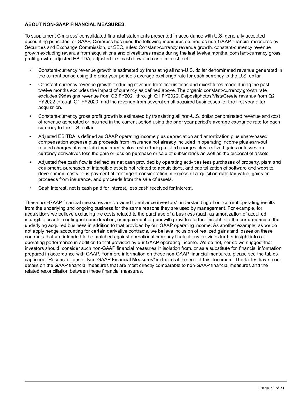 ABOUT NON-GAAP FINANCIAL MEASURES: To supplement Cimpress’ consolidated financial statements presented in accordance with U.S. generally accepted accounting principles, or GAAP, Cimpress has used the following measures defined as non-GAAP financial measures by Securities and Exchange Commission, or SEC, rules: Constant-currency revenue growth, constant-currency revenue growth excluding revenue from acquisitions and divestitures made during the last twelve months, constant-currency gross profit growth, adjusted EBITDA, adjusted free cash flow and cash interest, net: • Constant-currency revenue growth is estimated by translating all non-U.S. dollar denominated revenue generated in the current period using the prior year period’s average exchange rate for each currency to the U.S. dollar. • Constant-currency revenue growth excluding revenue from acquisitions and divestitures made during the past twelve months excludes the impact of currency as defined above. The organic constant-currency growth rate excludes 99designs revenue from Q2 FY2021 through Q1 FY2022, Depositphotos/VistaCreate revenue from Q2 FY2022 through Q1 FY2023, and the revenue from several small acquired businesses for the first year after acquisition. • Constant-currency gross profit growth is estimated by translating all non-U.S. dollar denominated revenue and cost of revenue generated or incurred in the current period using the prior year period’s average exchange rate for each currency to the U.S. dollar. • Adjusted EBITDA is defined as GAAP operating income plus depreciation and amortization plus share-based compensation expense plus proceeds from insurance not already included in operating income plus earn-out related charges plus certain impairments plus restructuring related charges plus realized gains or losses on currency derivatives less the gain or loss on purchase or sale of subsidiaries as well as the disposal of assets. • Adjusted free cash flow is defined as net cash provided by operating activities less purchases of property, plant and equipment, purchases of intangible assets not related to acquisitions, and capitalization of software and website development costs, plus payment of contingent consideration in excess of acquisition-date fair value, gains on proceeds from insurance, and proceeds from the sale of assets. • Cash interest, net is cash paid for interest, less cash received for interest. These non-GAAP financial measures are provided to enhance investors' understanding of our current operating results from the underlying and ongoing business for the same reasons they are used by management. For example, for acquisitions we believe excluding the costs related to the purchase of a business (such as amortization of acquired intangible assets, contingent consideration, or impairment of goodwill) provides further insight into the performance of the underlying acquired business in addition to that provided by our GAAP operating income. As another example, as we do not apply hedge accounting for certain derivative contracts, we believe inclusion of realized gains and losses on these contracts that are intended to be matched against operational currency fluctuations provides further insight into our operating performance in addition to that provided by our GAAP operating income. We do not, nor do we suggest that investors should, consider such non-GAAP financial measures in isolation from, or as a substitute for, financial information prepared in accordance with GAAP. For more information on these non-GAAP financial measures, please see the tables captioned “Reconciliations of Non-GAAP Financial Measures” included at the end of this document. The tables have more details on the GAAP financial measures that are most directly comparable to non-GAAP financial measures and the related reconciliation between these financial measures. Page 23 of 31