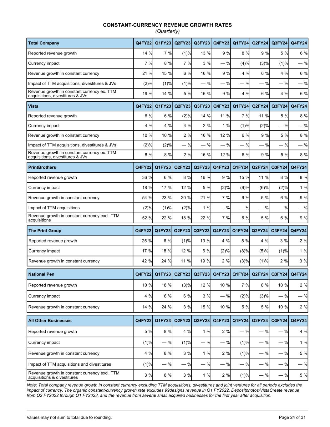 CONSTANT-CURRENCY REVENUE GROWTH RATES (Quarterly) Total Company Q4FY22 Q1FY23 Q2FY23 Q3FY23 Q4FY23 Q1FY24 Q2FY24 Q3FY24 Q4FY24 Reported revenue growth 14 % 7 % (1) % 13 % 9 % 8 % 9 % 5 % 6 % Currency impact 7 % 8 % 7 % 3 % — % (4) % (3) % (1) % — % Revenue growth in constant currency 21 % 15 % 6 % 16 % 9 % 4 % 6 % 4 % 6 % Impact of TTM acquisitions, divestitures & JVs (2) % (1) % (1) % — % — % — % — % — % — % Revenue growth in constant currency ex. TTM acquisitions, divestitures & JVs 19 % 14 % 5 % 16 % 9 % 4 % 6 % 4 % 6 % Vista Q4FY22 Q1FY23 Q2FY23 Q3FY23 Q4FY23 Q1FY24 Q2FY24 Q3FY24 Q4FY24 Reported revenue growth 6 % 6 % (2) % 14 % 11 % 7 % 11 % 5 % 8 % Currency impact 4 % 4 % 4 % 2 % 1 % (1) % (2) % — % — % Revenue growth in constant currency 10 % 10 % 2 % 16 % 12 % 6 % 9 % 5 % 8 % Impact of TTM acquisitions, divestitures & JVs (2) % (2) % — % — % — % — % — % — % — % Revenue growth in constant currency ex. TTM acquisitions, divestitures & JVs 8 % 8 % 2 % 16 % 12 % 6 % 9 % 5 % 8 % PrintBrothers Q4FY22 Q1FY23 Q2FY23 Q3FY23 Q4FY23 Q1FY24 Q2FY24 Q3FY24 Q4FY24 Reported revenue growth 36 % 6 % 8 % 16 % 9 % 15 % 11 % 8 % 8 % Currency impact 18 % 17 % 12 % 5 % (2) % (9) % (6) % (2) % 1 % Revenue growth in constant currency 54 % 23 % 20 % 21 % 7 % 6 % 5 % 6 % 9 % Impact of TTM acquisitions (2) % (1) % (2) % 1 % — % — % — % — % — % Revenue growth in constant currency excl. TTM acquisitions 52 % 22 % 18 % 22 % 7 % 6 % 5 % 6 % 9 % The Print Group Q4FY22 Q1FY23 Q2FY23 Q3FY23 Q4FY23 Q1FY24 Q2FY24 Q3FY24 Q4FY24 Reported revenue growth 25 % 6 % (1) % 13 % 4 % 5 % 4 % 3 % 2 % Currency impact 17 % 18 % 12 % 6 % (2) % (8) % (5) % (1) % 1 % Revenue growth in constant currency 42 % 24 % 11 % 19 % 2 % (3) % (1) % 2 % 3 % National Pen Q4FY22 Q1FY23 Q2FY23 Q3FY23 Q4FY23 Q1FY24 Q2FY24 Q3FY24 Q4FY24 Reported revenue growth 10 % 18 % (3) % 12 % 10 % 7 % 8 % 10 % 2 % Currency impact 4 % 6 % 6 % 3 % — % (2) % (3) % — % — % Revenue growth in constant currency 14 % 24 % 3 % 15 % 10 % 5 % 5 % 10 % 2 % All Other Businesses Q4FY22 Q1FY23 Q2FY23 Q3FY23 Q4FY23 Q1FY24 Q2FY24 Q3FY24 Q4FY24 Reported revenue growth 5 % 8 % 4 % 1 % 2 % — % — % — % 4 % Currency impact (1) % — % (1) % — % — % (1) % — % — % 1 % Revenue growth in constant currency 4 % 8 % 3 % 1 % 2 % (1) % — % — % 5 % Impact of TTM acquisitions and divestitures (1) % — % — % — % — % — % — % — % — % Revenue growth in constant currency excl. TTM acquisitions & divestitures 3 % 8 % 3 % 1 % 2 % (1) % — % — % 5 % Note: Total company revenue growth in constant currency excluding TTM acquisitions, divestitures and joint ventures for all periods excludes the impact of currency. The organic constant-currency growth rate excludes 99designs revenue in Q1 FY2022, Depositphotos/VistaCreate revenue from Q2 FY2022 through Q1 FY2023, and the revenue from several small acquired businesses for the first year after acquisition. Values may not sum to total due to rounding. Page 24 of 31