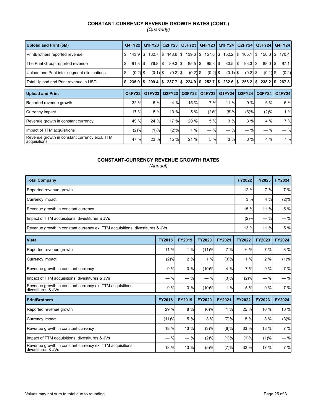 CONSTANT-CURRENCY REVENUE GROWTH RATES (CONT.) (Quarterly) Upload and Print ($M) Q4FY22 Q1FY23 Q2FY23 Q3FY23 Q4FY23 Q1FY24 Q2FY24 Q3FY24 Q4FY24 PrintBrothers reported revenue $ 143.9 $ 132.7 $ 148.6 $ 139.6 $ 157.6 $ 152.2 $ 165.1 $ 150.3 $ 170.4 The Print Group reported revenue $ 91.3 $ 76.8 $ 89.3 $ 85.5 $ 95.3 $ 80.5 $ 93.3 $ 88.0 $ 97.1 Upload and Print inter-segment eliminations $ (0.2) $ (0.1) $ (0.2) $ (0.2) $ (0.2) $ (0.1) $ (0.2) $ (0.1) $ (0.2) Total Upload and Print revenue in USD $ 235.0 $ 209.4 $ 237.7 $ 224.9 $ 252.7 $ 232.6 $ 258.2 $ 238.2 $ 267.3 Upload and Print Q4FY22 Q1FY23 Q2FY23 Q3FY23 Q4FY23 Q1FY24 Q2FY24 Q3FY24 Q4FY24 Reported revenue growth 32 % 6 % 4 % 15 % 7 % 11 % 9 % 6 % 6 % Currency impact 17 % 18 % 13 % 5 % (2) % (8) % (6) % (2) % 1 % Revenue growth in constant currency 49 % 24 % 17 % 20 % 5 % 3 % 3 % 4 % 7 % Impact of TTM acquisitions (2) % (1) % (2) % 1 % — % — % — % — % — % Revenue growth in constant currency excl. TTM acquisitions 47 % 23 % 15 % 21 % 5 % 3 % 3 % 4 % 7 % CONSTANT-CURRENCY REVENUE GROWTH RATES (Annual) Total Company FY2022 FY2023 FY2024 Reported revenue growth 12 % 7 % 7 % Currency impact 3 % 4 % (2) % Revenue growth in constant currency 15 % 11 % 5 % Impact of TTM acquisitions, divestitures & JVs (2) % — % — % Revenue growth in constant currency ex. TTM acquisitions, divestitures & JVs 13 % 11 % 5 % Vista FY2018 FY2019 FY2020 FY2021 FY2022 FY2023 FY2024 Reported revenue growth 11 % 1 % (11) % 7 % 6 % 7 % 8 % Currency impact (2) % 2 % 1 % (3) % 1 % 2 % (1) % Revenue growth in constant currency 9 % 3 % (10) % 4 % 7 % 9 % 7 % Impact of TTM acquisitions, divestitures & JVs — % — % — % (3) % (2) % — % — % Revenue growth in constant currency ex. TTM acquisitions, divestitures & JVs 9 % 3 % (10) % 1 % 5 % 9 % 7 % PrintBrothers FY2018 FY2019 FY2020 FY2021 FY2022 FY2023 FY2024 Reported revenue growth 29 % 8 % (6) % 1 % 25 % 10 % 10 % Currency impact (11) % 5 % 3 % (7) % 8 % 8 % (3) % Revenue growth in constant currency 18 % 13 % (3) % (6) % 33 % 18 % 7 % Impact of TTM acquisitions, divestitures & JVs — % — % (2) % (1) % (1) % (1) % — % Revenue growth in constant currency ex. TTM acquisitions, divestitures & JVs 18 % 13 % (5) % (7) % 32 % 17 % 7 % Values may not sum to total due to rounding. Page 25 of 31