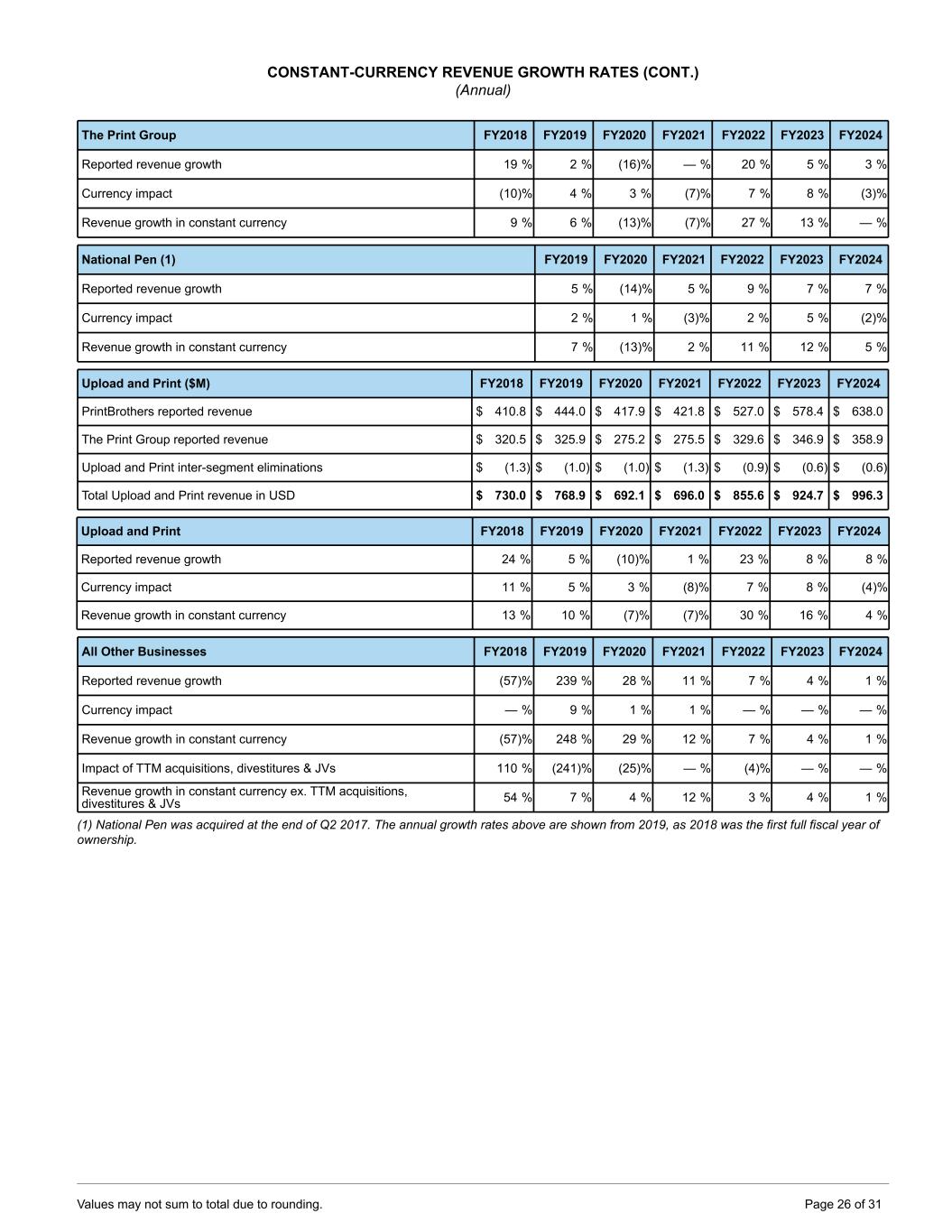 CONSTANT-CURRENCY REVENUE GROWTH RATES (CONT.) (Annual) The Print Group FY2018 FY2019 FY2020 FY2021 FY2022 FY2023 FY2024 Reported revenue growth 19 % 2 % (16) % — % 20 % 5 % 3 % Currency impact (10) % 4 % 3 % (7) % 7 % 8 % (3) % Revenue growth in constant currency 9 % 6 % (13) % (7) % 27 % 13 % — % National Pen (1) FY2019 FY2020 FY2021 FY2022 FY2023 FY2024 Reported revenue growth 5 % (14) % 5 % 9 % 7 % 7 % Currency impact 2 % 1 % (3) % 2 % 5 % (2) % Revenue growth in constant currency 7 % (13) % 2 % 11 % 12 % 5 % Upload and Print ($M) FY2018 FY2019 FY2020 FY2021 FY2022 FY2023 FY2024 PrintBrothers reported revenue $ 410.8 $ 444.0 $ 417.9 $ 421.8 $ 527.0 $ 578.4 $ 638.0 The Print Group reported revenue $ 320.5 $ 325.9 $ 275.2 $ 275.5 $ 329.6 $ 346.9 $ 358.9 Upload and Print inter-segment eliminations $ (1.3) $ (1.0) $ (1.0) $ (1.3) $ (0.9) $ (0.6) $ (0.6) Total Upload and Print revenue in USD $ 730.0 $ 768.9 $ 692.1 $ 696.0 $ 855.6 $ 924.7 $ 996.3 Upload and Print FY2018 FY2019 FY2020 FY2021 FY2022 FY2023 FY2024 Reported revenue growth 24 % 5 % (10) % 1 % 23 % 8 % 8 % Currency impact 11 % 5 % 3 % (8) % 7 % 8 % (4) % Revenue growth in constant currency 13 % 10 % (7) % (7) % 30 % 16 % 4 % All Other Businesses FY2018 FY2019 FY2020 FY2021 FY2022 FY2023 FY2024 Reported revenue growth (57) % 239 % 28 % 11 % 7 % 4 % 1 % Currency impact — % 9 % 1 % 1 % — % — % — % Revenue growth in constant currency (57) % 248 % 29 % 12 % 7 % 4 % 1 % Impact of TTM acquisitions, divestitures & JVs 110 % (241) % (25) % — % (4) % — % — % Revenue growth in constant currency ex. TTM acquisitions, divestitures & JVs 54 % 7 % 4 % 12 % 3 % 4 % 1 % (1) National Pen was acquired at the end of Q2 2017. The annual growth rates above are shown from 2019, as 2018 was the first full fiscal year of ownership. Values may not sum to total due to rounding. Page 26 of 31