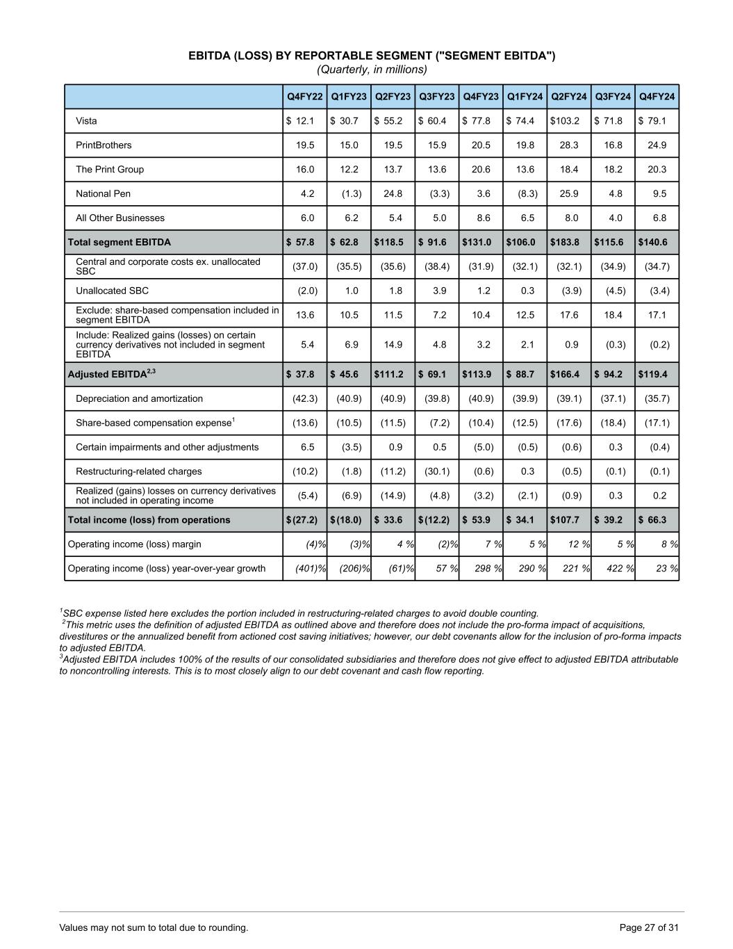 EBITDA (LOSS) BY REPORTABLE SEGMENT ("SEGMENT EBITDA") (Quarterly, in millions) Q4FY22 Q1FY23 Q2FY23 Q3FY23 Q4FY23 Q1FY24 Q2FY24 Q3FY24 Q4FY24 Vista $ 12.1 $ 30.7 $ 55.2 $ 60.4 $ 77.8 $ 74.4 $ 103.2 $ 71.8 $ 79.1 PrintBrothers 19.5 15.0 19.5 15.9 20.5 19.8 28.3 16.8 24.9 The Print Group 16.0 12.2 13.7 13.6 20.6 13.6 18.4 18.2 20.3 National Pen 4.2 (1.3) 24.8 (3.3) 3.6 (8.3) 25.9 4.8 9.5 All Other Businesses 6.0 6.2 5.4 5.0 8.6 6.5 8.0 4.0 6.8 Total segment EBITDA $ 57.8 $ 62.8 $ 118.5 $ 91.6 $ 131.0 $ 106.0 $ 183.8 $ 115.6 $ 140.6 Central and corporate costs ex. unallocated SBC (37.0) (35.5) (35.6) (38.4) (31.9) (32.1) (32.1) (34.9) (34.7) Unallocated SBC (2.0) 1.0 1.8 3.9 1.2 0.3 (3.9) (4.5) (3.4) Exclude: share-based compensation included in segment EBITDA 13.6 10.5 11.5 7.2 10.4 12.5 17.6 18.4 17.1 Include: Realized gains (losses) on certain currency derivatives not included in segment EBITDA 5.4 6.9 14.9 4.8 3.2 2.1 0.9 (0.3) (0.2) Adjusted EBITDA2,3 $ 37.8 $ 45.6 $ 111.2 $ 69.1 $ 113.9 $ 88.7 $ 166.4 $ 94.2 $ 119.4 Depreciation and amortization (42.3) (40.9) (40.9) (39.8) (40.9) (39.9) (39.1) (37.1) (35.7) Share-based compensation expense1 (13.6) (10.5) (11.5) (7.2) (10.4) (12.5) (17.6) (18.4) (17.1) Certain impairments and other adjustments 6.5 (3.5) 0.9 0.5 (5.0) (0.5) (0.6) 0.3 (0.4) Restructuring-related charges (10.2) (1.8) (11.2) (30.1) (0.6) 0.3 (0.5) (0.1) (0.1) Realized (gains) losses on currency derivatives not included in operating income (5.4) (6.9) (14.9) (4.8) (3.2) (2.1) (0.9) 0.3 0.2 Total income (loss) from operations $ (27.2) $ (18.0) $ 33.6 $ (12.2) $ 53.9 $ 34.1 $ 107.7 $ 39.2 $ 66.3 Operating income (loss) margin (4) % (3) % 4 % (2) % 7 % 5 % 12 % 5 % 8 % Operating income (loss) year-over-year growth (401) % (206) % (61) % 57 % 298 % 290 % 221 % 422 % 23 % 1SBC expense listed here excludes the portion included in restructuring-related charges to avoid double counting. 2This metric uses the definition of adjusted EBITDA as outlined above and therefore does not include the pro-forma impact of acquisitions, divestitures or the annualized benefit from actioned cost saving initiatives; however, our debt covenants allow for the inclusion of pro-forma impacts to adjusted EBITDA. 3Adjusted EBITDA includes 100% of the results of our consolidated subsidiaries and therefore does not give effect to adjusted EBITDA attributable to noncontrolling interests. This is to most closely align to our debt covenant and cash flow reporting. Values may not sum to total due to rounding. Page 27 of 31