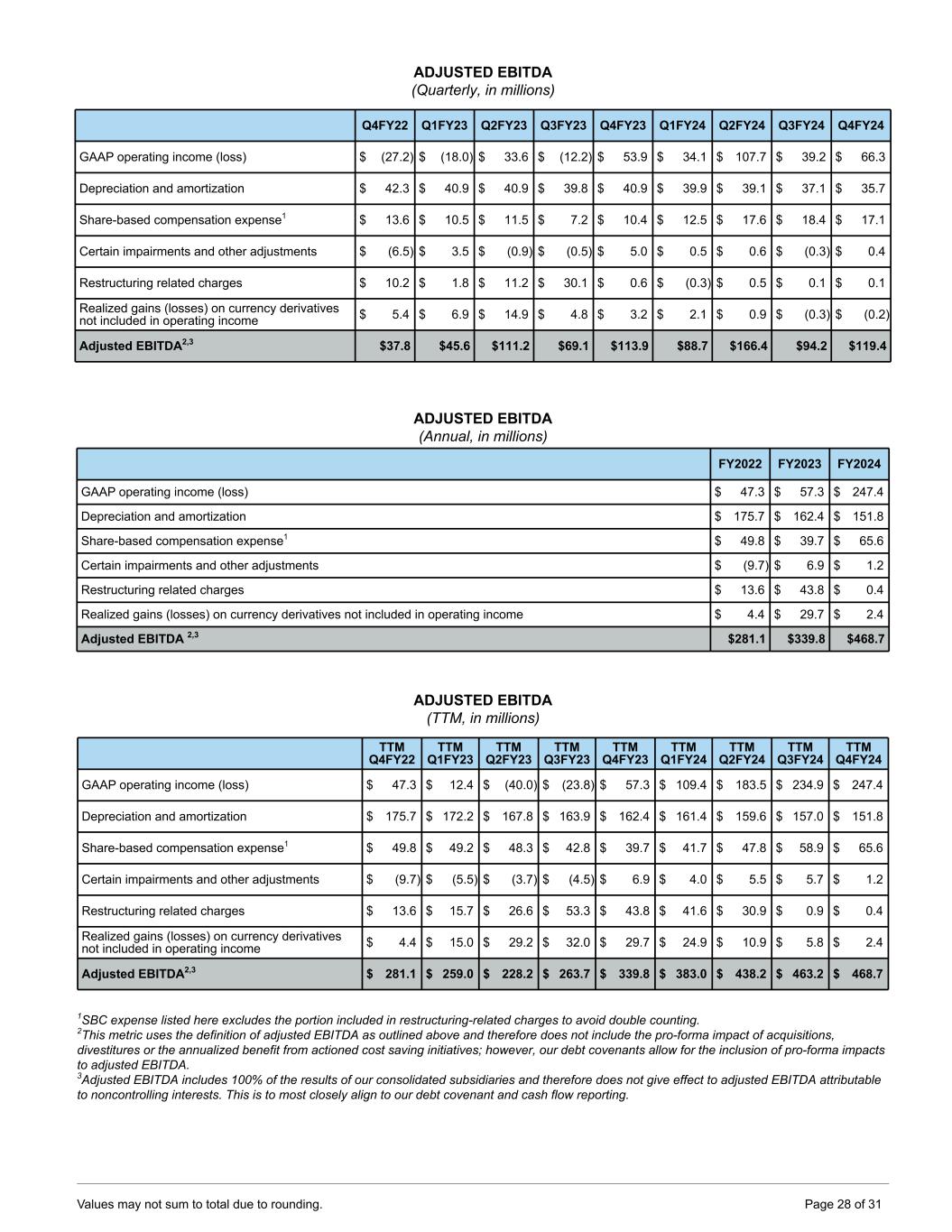 ADJUSTED EBITDA (Quarterly, in millions) Q4FY22 Q1FY23 Q2FY23 Q3FY23 Q4FY23 Q1FY24 Q2FY24 Q3FY24 Q4FY24 GAAP operating income (loss) $ (27.2) $ (18.0) $ 33.6 $ (12.2) $ 53.9 $ 34.1 $ 107.7 $ 39.2 $ 66.3 Depreciation and amortization $ 42.3 $ 40.9 $ 40.9 $ 39.8 $ 40.9 $ 39.9 $ 39.1 $ 37.1 $ 35.7 Share-based compensation expense1 $ 13.6 $ 10.5 $ 11.5 $ 7.2 $ 10.4 $ 12.5 $ 17.6 $ 18.4 $ 17.1 Certain impairments and other adjustments $ (6.5) $ 3.5 $ (0.9) $ (0.5) $ 5.0 $ 0.5 $ 0.6 $ (0.3) $ 0.4 Restructuring related charges $ 10.2 $ 1.8 $ 11.2 $ 30.1 $ 0.6 $ (0.3) $ 0.5 $ 0.1 $ 0.1 Realized gains (losses) on currency derivatives not included in operating income $ 5.4 $ 6.9 $ 14.9 $ 4.8 $ 3.2 $ 2.1 $ 0.9 $ (0.3) $ (0.2) Adjusted EBITDA2,3 $37.8 $45.6 $111.2 $69.1 $113.9 $88.7 $166.4 $94.2 $119.4 ADJUSTED EBITDA (Annual, in millions) FY2022 FY2023 FY2024 GAAP operating income (loss) $ 47.3 $ 57.3 $ 247.4 Depreciation and amortization $ 175.7 $ 162.4 $ 151.8 Share-based compensation expense1 $ 49.8 $ 39.7 $ 65.6 Certain impairments and other adjustments $ (9.7) $ 6.9 $ 1.2 Restructuring related charges $ 13.6 $ 43.8 $ 0.4 Realized gains (losses) on currency derivatives not included in operating income $ 4.4 $ 29.7 $ 2.4 Adjusted EBITDA 2,3 $281.1 $339.8 $468.7 ADJUSTED EBITDA (TTM, in millions) TTM Q4FY22 TTM Q1FY23 TTM Q2FY23 TTM Q3FY23 TTM Q4FY23 TTM Q1FY24 TTM Q2FY24 TTM Q3FY24 TTM Q4FY24 GAAP operating income (loss) $ 47.3 $ 12.4 $ (40.0) $ (23.8) $ 57.3 $ 109.4 $ 183.5 $ 234.9 $ 247.4 Depreciation and amortization $ 175.7 $ 172.2 $ 167.8 $ 163.9 $ 162.4 $ 161.4 $ 159.6 $ 157.0 $ 151.8 Share-based compensation expense1 $ 49.8 $ 49.2 $ 48.3 $ 42.8 $ 39.7 $ 41.7 $ 47.8 $ 58.9 $ 65.6 Certain impairments and other adjustments $ (9.7) $ (5.5) $ (3.7) $ (4.5) $ 6.9 $ 4.0 $ 5.5 $ 5.7 $ 1.2 Restructuring related charges $ 13.6 $ 15.7 $ 26.6 $ 53.3 $ 43.8 $ 41.6 $ 30.9 $ 0.9 $ 0.4 Realized gains (losses) on currency derivatives not included in operating income $ 4.4 $ 15.0 $ 29.2 $ 32.0 $ 29.7 $ 24.9 $ 10.9 $ 5.8 $ 2.4 Adjusted EBITDA2,3 $ 281.1 $ 259.0 $ 228.2 $ 263.7 $ 339.8 $ 383.0 $ 438.2 $ 463.2 $ 468.7 1SBC expense listed here excludes the portion included in restructuring-related charges to avoid double counting. 2This metric uses the definition of adjusted EBITDA as outlined above and therefore does not include the pro-forma impact of acquisitions, divestitures or the annualized benefit from actioned cost saving initiatives; however, our debt covenants allow for the inclusion of pro-forma impacts to adjusted EBITDA. 3Adjusted EBITDA includes 100% of the results of our consolidated subsidiaries and therefore does not give effect to adjusted EBITDA attributable to noncontrolling interests. This is to most closely align to our debt covenant and cash flow reporting. Values may not sum to total due to rounding. Page 28 of 31
