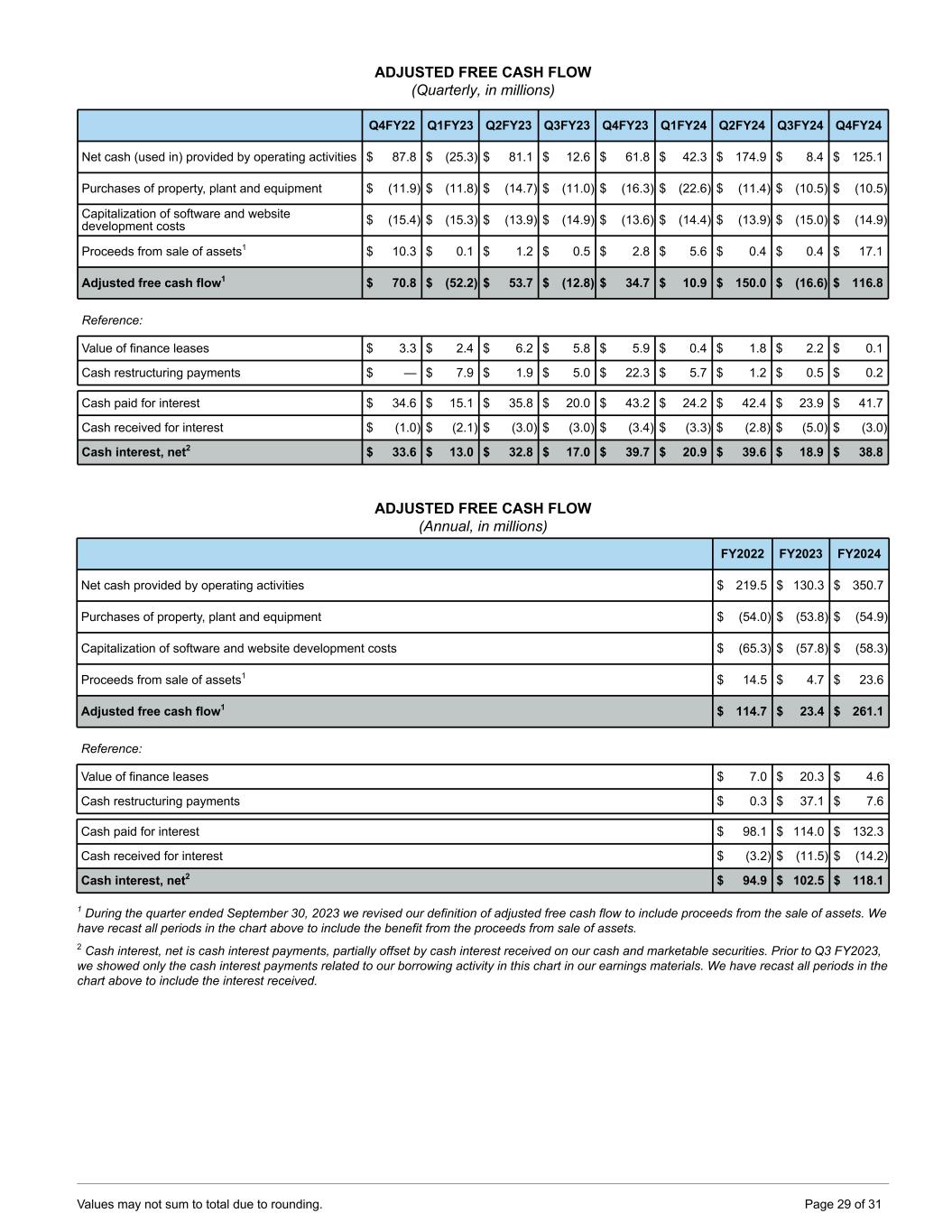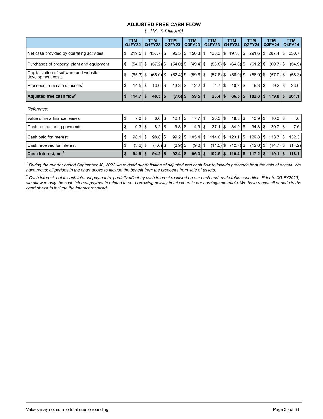 ADJUSTED FREE CASH FLOW (Quarterly, in millions) Q4FY22 Q1FY23 Q2FY23 Q3FY23 Q4FY23 Q1FY24 Q2FY24 Q3FY24 Q4FY24 Net cash (used in) provided by operating activities $ 87.8 $ (25.3) $ 81.1 $ 12.6 $ 61.8 $ 42.3 $ 174.9 $ 8.4 $ 125.1 Purchases of property, plant and equipment $ (11.9) $ (11.8) $ (14.7) $ (11.0) $ (16.3) $ (22.6) $ (11.4) $ (10.5) $ (10.5) Capitalization of software and website development costs $ (15.4) $ (15.3) $ (13.9) $ (14.9) $ (13.6) $ (14.4) $ (13.9) $ (15.0) $ (14.9) Proceeds from sale of assets1 $ 10.3 $ 0.1 $ 1.2 $ 0.5 $ 2.8 $ 5.6 $ 0.4 $ 0.4 $ 17.1 Adjusted free cash flow1 $ 70.8 $ (52.2) $ 53.7 $ (12.8) $ 34.7 $ 10.9 $ 150.0 $ (16.6) $ 116.8 Reference: Value of finance leases $ 3.3 $ 2.4 $ 6.2 $ 5.8 $ 5.9 $ 0.4 $ 1.8 $ 2.2 $ 0.1 Cash restructuring payments $ — $ 7.9 $ 1.9 $ 5.0 $ 22.3 $ 5.7 $ 1.2 $ 0.5 $ 0.2 Cash paid for interest $ 34.6 $ 15.1 $ 35.8 $ 20.0 $ 43.2 $ 24.2 $ 42.4 $ 23.9 $ 41.7 Cash received for interest $ (1.0) $ (2.1) $ (3.0) $ (3.0) $ (3.4) $ (3.3) $ (2.8) $ (5.0) $ (3.0) Cash interest, net2 $ 33.6 $ 13.0 $ 32.8 $ 17.0 $ 39.7 $ 20.9 $ 39.6 $ 18.9 $ 38.8 ADJUSTED FREE CASH FLOW (Annual, in millions) FY2022 FY2023 FY2024 Net cash provided by operating activities $ 219.5 $ 130.3 $ 350.7 Purchases of property, plant and equipment $ (54.0) $ (53.8) $ (54.9) Capitalization of software and website development costs $ (65.3) $ (57.8) $ (58.3) Proceeds from sale of assets1 $ 14.5 $ 4.7 $ 23.6 Adjusted free cash flow1 $ 114.7 $ 23.4 $ 261.1 Reference: Value of finance leases $ 7.0 $ 20.3 $ 4.6 Cash restructuring payments $ 0.3 $ 37.1 $ 7.6 Cash paid for interest $ 98.1 $ 114.0 $ 132.3 Cash received for interest $ (3.2) $ (11.5) $ (14.2) Cash interest, net2 $ 94.9 $ 102.5 $ 118.1 1 During the quarter ended September 30, 2023 we revised our definition of adjusted free cash flow to include proceeds from the sale of assets. We have recast all periods in the chart above to include the benefit from the proceeds from sale of assets. 2 Cash interest, net is cash interest payments, partially offset by cash interest received on our cash and marketable securities. Prior to Q3 FY2023, we showed only the cash interest payments related to our borrowing activity in this chart in our earnings materials. We have recast all periods in the chart above to include the interest received. Values may not sum to total due to rounding. Page 29 of 31