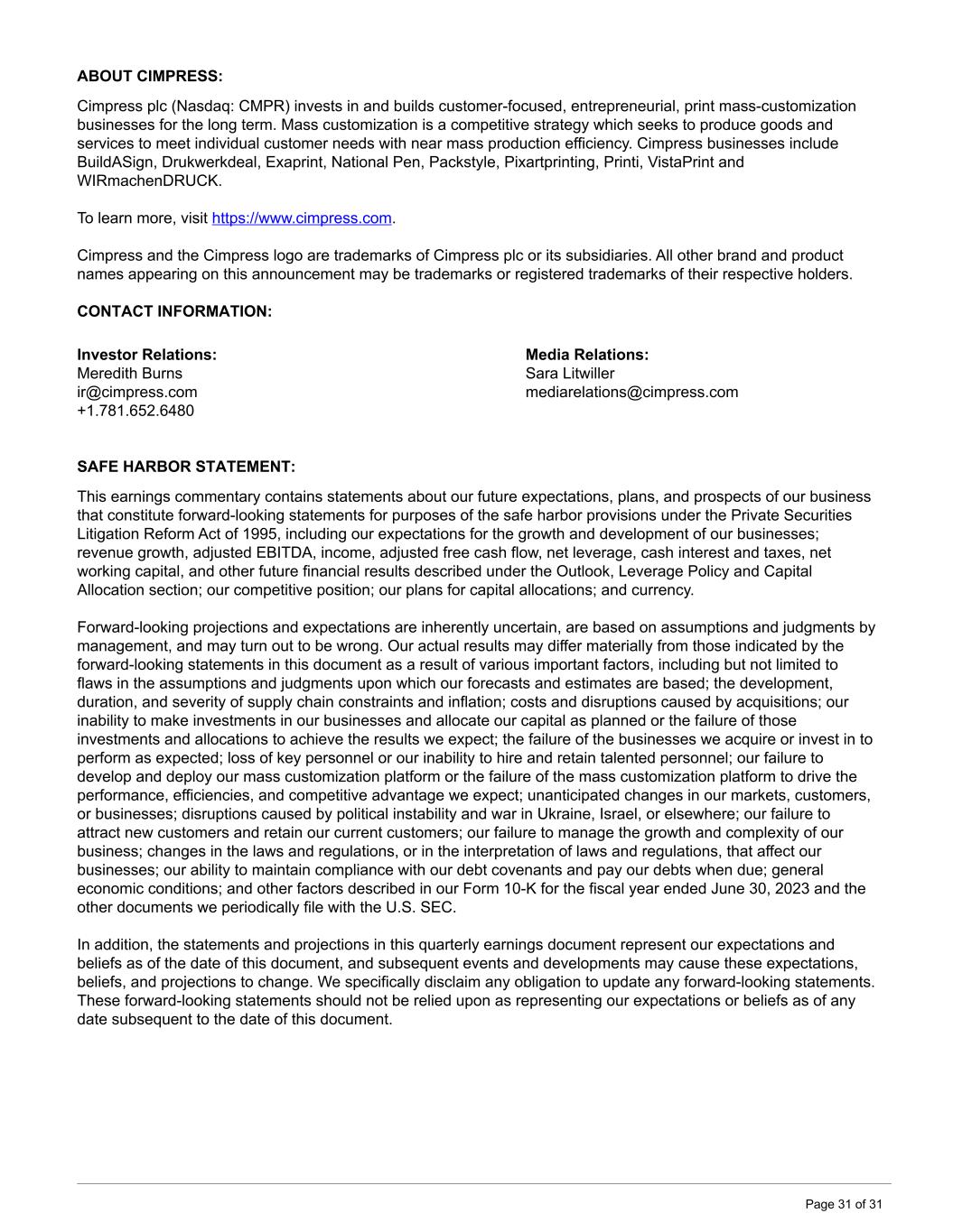 ABOUT CIMPRESS: Cimpress plc (Nasdaq: CMPR) invests in and builds customer-focused, entrepreneurial, print mass-customization businesses for the long term. Mass customization is a competitive strategy which seeks to produce goods and services to meet individual customer needs with near mass production efficiency. Cimpress businesses include BuildASign, Drukwerkdeal, Exaprint, National Pen, Packstyle, Pixartprinting, Printi, VistaPrint and WIRmachenDRUCK. To learn more, visit https://www.cimpress.com. Cimpress and the Cimpress logo are trademarks of Cimpress plc or its subsidiaries. All other brand and product names appearing on this announcement may be trademarks or registered trademarks of their respective holders. CONTACT INFORMATION: Investor Relations: Media Relations: Meredith Burns Sara Litwiller ir@cimpress.com mediarelations@cimpress.com +1.781.652.6480 SAFE HARBOR STATEMENT: This earnings commentary contains statements about our future expectations, plans, and prospects of our business that constitute forward-looking statements for purposes of the safe harbor provisions under the Private Securities Litigation Reform Act of 1995, including our expectations for the growth and development of our businesses; revenue growth, adjusted EBITDA, income, adjusted free cash flow, net leverage, cash interest and taxes, net working capital, and other future financial results described under the Outlook, Leverage Policy and Capital Allocation section; our competitive position; our plans for capital allocations; and currency. Forward-looking projections and expectations are inherently uncertain, are based on assumptions and judgments by management, and may turn out to be wrong. Our actual results may differ materially from those indicated by the forward-looking statements in this document as a result of various important factors, including but not limited to flaws in the assumptions and judgments upon which our forecasts and estimates are based; the development, duration, and severity of supply chain constraints and inflation; costs and disruptions caused by acquisitions; our inability to make investments in our businesses and allocate our capital as planned or the failure of those investments and allocations to achieve the results we expect; the failure of the businesses we acquire or invest in to perform as expected; loss of key personnel or our inability to hire and retain talented personnel; our failure to develop and deploy our mass customization platform or the failure of the mass customization platform to drive the performance, efficiencies, and competitive advantage we expect; unanticipated changes in our markets, customers, or businesses; disruptions caused by political instability and war in Ukraine, Israel, or elsewhere; our failure to attract new customers and retain our current customers; our failure to manage the growth and complexity of our business; changes in the laws and regulations, or in the interpretation of laws and regulations, that affect our businesses; our ability to maintain compliance with our debt covenants and pay our debts when due; general economic conditions; and other factors described in our Form 10-K for the fiscal year ended June 30, 2023 and the other documents we periodically file with the U.S. SEC. In addition, the statements and projections in this quarterly earnings document represent our expectations and beliefs as of the date of this document, and subsequent events and developments may cause these expectations, beliefs, and projections to change. We specifically disclaim any obligation to update any forward-looking statements. These forward-looking statements should not be relied upon as representing our expectations or beliefs as of any date subsequent to the date of this document. Page 31 of 31