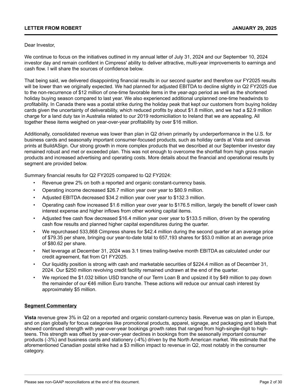 LETTER FROM ROBERT JANUARY 29, 2025 Dear Investor, We continue to focus on the initiatives outlined in my annual letter of July 31, 2024 and our September 10, 2024 investor day and remain confident in Cimpress' ability to deliver attractive, multi-year improvements to earnings and cash flow. I will share the sources of confidence below. That being said, we delivered disappointing financial results in our second quarter and therefore our FY2025 results will be lower than we originally expected. We had planned for adjusted EBITDA to decline slightly in Q2 FY2025 due to the non-recurrence of $12 million of one-time favorable items in the year-ago period as well as the shortened holiday buying season compared to last year. We also experienced additional unplanned one-time headwinds to profitability. In Canada there was a postal strike during the holiday peak that kept our customers from buying holiday cards given the uncertainty of deliverability, which reduced profits by about $1.8 million, and we had a $2.9 million charge for a land duty tax in Australia related to our 2019 redomiciliation to Ireland that we are appealing. All together these items weighed on year-over-year profitability by over $16 million. Additionally, consolidated revenue was lower than plan in Q2 driven primarily by underperformance in the U.S. for business cards and seasonally important consumer-focused products, such as holiday cards at Vista and canvas prints at BuildASign. Our strong growth in more complex products that we described at our September investor day remained robust and met or exceeded plan. This was not enough to overcome the shortfall from high gross margin products and increased advertising and operating costs. More details about the financial and operational results by segment are provided below. Summary financial results for Q2 FY2025 compared to Q2 FY2024: • Revenue grew 2% on both a reported and organic constant-currency basis. • Operating income decreased $26.7 million year over year to $80.9 million. • Adjusted EBITDA decreased $34.2 million year over year to $132.3 million. • Operating cash flow increased $1.6 million year over year to $176.5 million, largely the benefit of lower cash interest expense and higher inflows from other working capital items. • Adjusted free cash flow decreased $16.4 million year over year to $133.5 million, driven by the operating cash flow results and planned higher capital expenditures during the quarter. • We repurchased 533,868 Cimpress shares for $42.4 million during the second quarter at an average price of $79.35 per share, bringing our year-to-date total to 657,193 shares for $53.0 million at an average price of $80.62 per share. • Net leverage at December 31, 2024 was 3.1 times trailing-twelve month EBITDA as calculated under our credit agreement, flat from Q1 FY2025. • Our liquidity position is strong with cash and marketable securities of $224.4 million as of December 31, 2024. Our $250 million revolving credit facility remained undrawn at the end of the quarter. • We repriced the $1.032 billion USD tranche of our Term Loan B and upsized it by $49 million to pay down the remainder of our €46 million Euro tranche. These actions will reduce our annual cash interest by approximately $5 million. Segment Commentary Vista revenue grew 3% in Q2 on a reported and organic constant-currency basis. Revenue was on plan in Europe, and on plan globally for focus categories like promotional products, apparel, signage, and packaging and labels that showed continued strength with year-over-year bookings growth rates that ranged from high-single-digit to high- teens. This strength was offset by year-over-year declines in bookings from the seasonally important consumer products (-3%) and business cards and stationery (-4%) driven by the North American market. We estimate that the aforementioned Canadian postal strike had a $3 million impact to revenue in Q2, most notably in the consumer category. Please see non-GAAP reconciliations at the end of this document. Page 2 of 30