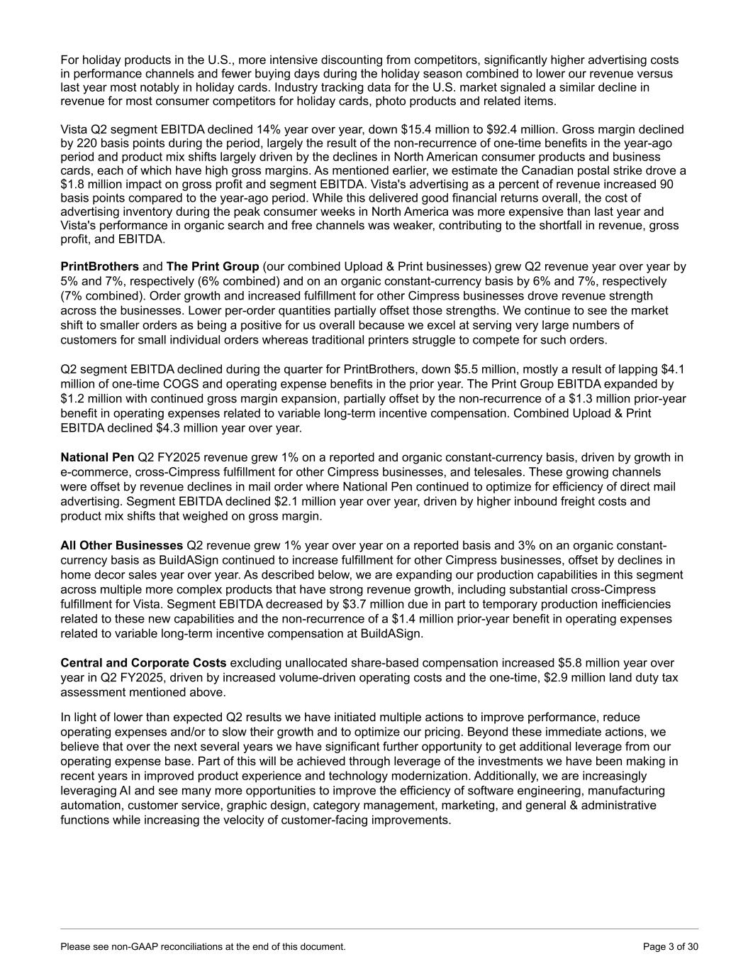 For holiday products in the U.S., more intensive discounting from competitors, significantly higher advertising costs in performance channels and fewer buying days during the holiday season combined to lower our revenue versus last year most notably in holiday cards. Industry tracking data for the U.S. market signaled a similar decline in revenue for most consumer competitors for holiday cards, photo products and related items. Vista Q2 segment EBITDA declined 14% year over year, down $15.4 million to $92.4 million. Gross margin declined by 220 basis points during the period, largely the result of the non-recurrence of one-time benefits in the year-ago period and product mix shifts largely driven by the declines in North American consumer products and business cards, each of which have high gross margins. As mentioned earlier, we estimate the Canadian postal strike drove a $1.8 million impact on gross profit and segment EBITDA. Vista's advertising as a percent of revenue increased 90 basis points compared to the year-ago period. While this delivered good financial returns overall, the cost of advertising inventory during the peak consumer weeks in North America was more expensive than last year and Vista's performance in organic search and free channels was weaker, contributing to the shortfall in revenue, gross profit, and EBITDA. PrintBrothers and The Print Group (our combined Upload & Print businesses) grew Q2 revenue year over year by 5% and 7%, respectively (6% combined) and on an organic constant-currency basis by 6% and 7%, respectively (7% combined). Order growth and increased fulfillment for other Cimpress businesses drove revenue strength across the businesses. Lower per-order quantities partially offset those strengths. We continue to see the market shift to smaller orders as being a positive for us overall because we excel at serving very large numbers of customers for small individual orders whereas traditional printers struggle to compete for such orders. Q2 segment EBITDA declined during the quarter for PrintBrothers, down $5.5 million, mostly a result of lapping $4.1 million of one-time COGS and operating expense benefits in the prior year. The Print Group EBITDA expanded by $1.2 million with continued gross margin expansion, partially offset by the non-recurrence of a $1.3 million prior-year benefit in operating expenses related to variable long-term incentive compensation. Combined Upload & Print EBITDA declined $4.3 million year over year. National Pen Q2 FY2025 revenue grew 1% on a reported and organic constant-currency basis, driven by growth in e-commerce, cross-Cimpress fulfillment for other Cimpress businesses, and telesales. These growing channels were offset by revenue declines in mail order where National Pen continued to optimize for efficiency of direct mail advertising. Segment EBITDA declined $2.1 million year over year, driven by higher inbound freight costs and product mix shifts that weighed on gross margin. All Other Businesses Q2 revenue grew 1% year over year on a reported basis and 3% on an organic constant- currency basis as BuildASign continued to increase fulfillment for other Cimpress businesses, offset by declines in home decor sales year over year. As described below, we are expanding our production capabilities in this segment across multiple more complex products that have strong revenue growth, including substantial cross-Cimpress fulfillment for Vista. Segment EBITDA decreased by $3.7 million due in part to temporary production inefficiencies related to these new capabilities and the non-recurrence of a $1.4 million prior-year benefit in operating expenses related to variable long-term incentive compensation at BuildASign. Central and Corporate Costs excluding unallocated share-based compensation increased $5.8 million year over year in Q2 FY2025, driven by increased volume-driven operating costs and the one-time, $2.9 million land duty tax assessment mentioned above. In light of lower than expected Q2 results we have initiated multiple actions to improve performance, reduce operating expenses and/or to slow their growth and to optimize our pricing. Beyond these immediate actions, we believe that over the next several years we have significant further opportunity to get additional leverage from our operating expense base. Part of this will be achieved through leverage of the investments we have been making in recent years in improved product experience and technology modernization. Additionally, we are increasingly leveraging AI and see many more opportunities to improve the efficiency of software engineering, manufacturing automation, customer service, graphic design, category management, marketing, and general & administrative functions while increasing the velocity of customer-facing improvements. Please see non-GAAP reconciliations at the end of this document. Page 3 of 30