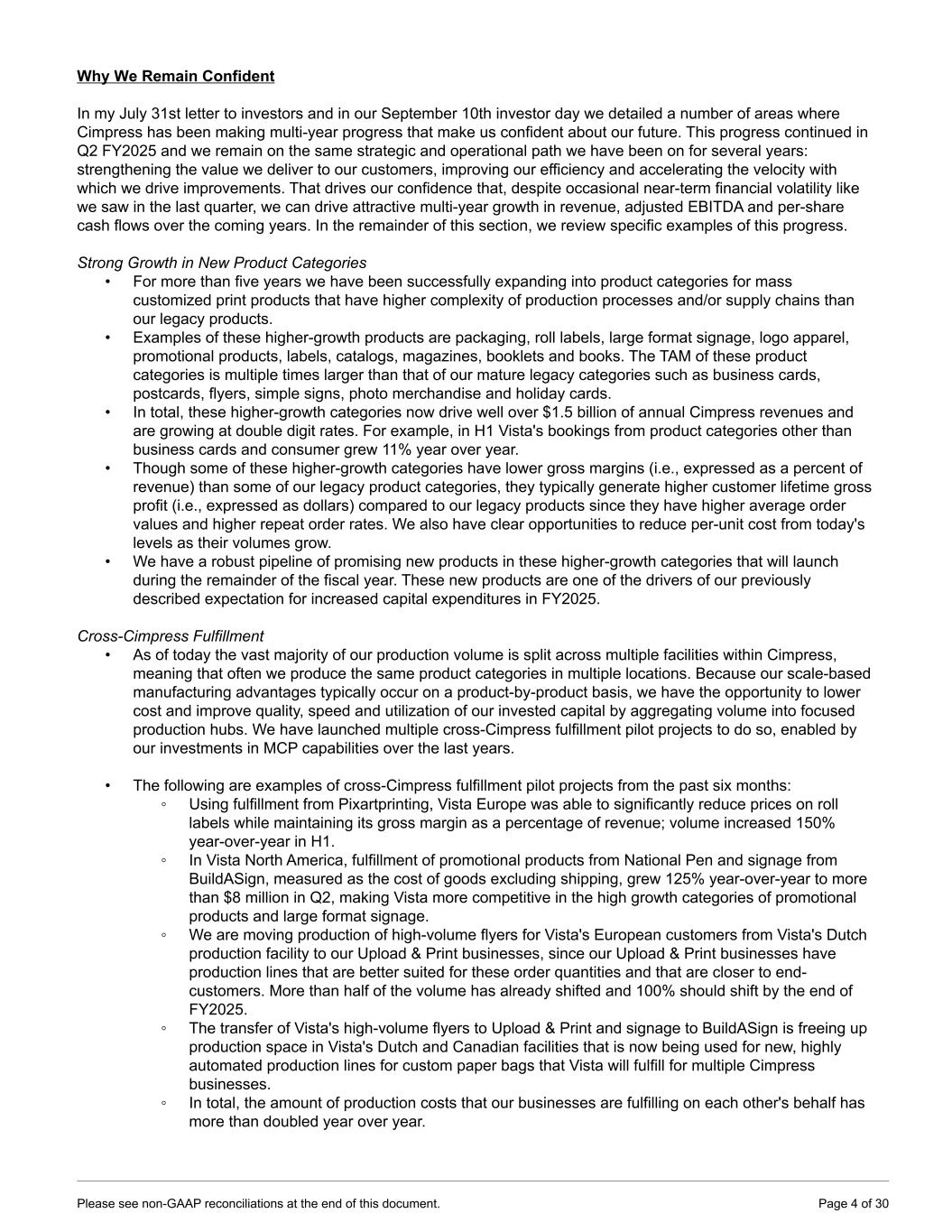 Why We Remain Confident In my July 31st letter to investors and in our September 10th investor day we detailed a number of areas where Cimpress has been making multi-year progress that make us confident about our future. This progress continued in Q2 FY2025 and we remain on the same strategic and operational path we have been on for several years: strengthening the value we deliver to our customers, improving our efficiency and accelerating the velocity with which we drive improvements. That drives our confidence that, despite occasional near-term financial volatility like we saw in the last quarter, we can drive attractive multi-year growth in revenue, adjusted EBITDA and per-share cash flows over the coming years. In the remainder of this section, we review specific examples of this progress. Strong Growth in New Product Categories • For more than five years we have been successfully expanding into product categories for mass customized print products that have higher complexity of production processes and/or supply chains than our legacy products. • Examples of these higher-growth products are packaging, roll labels, large format signage, logo apparel, promotional products, labels, catalogs, magazines, booklets and books. The TAM of these product categories is multiple times larger than that of our mature legacy categories such as business cards, postcards, flyers, simple signs, photo merchandise and holiday cards. • In total, these higher-growth categories now drive well over $1.5 billion of annual Cimpress revenues and are growing at double digit rates. For example, in H1 Vista's bookings from product categories other than business cards and consumer grew 11% year over year. • Though some of these higher-growth categories have lower gross margins (i.e., expressed as a percent of revenue) than some of our legacy product categories, they typically generate higher customer lifetime gross profit (i.e., expressed as dollars) compared to our legacy products since they have higher average order values and higher repeat order rates. We also have clear opportunities to reduce per-unit cost from today's levels as their volumes grow. • We have a robust pipeline of promising new products in these higher-growth categories that will launch during the remainder of the fiscal year. These new products are one of the drivers of our previously described expectation for increased capital expenditures in FY2025. Cross-Cimpress Fulfillment • As of today the vast majority of our production volume is split across multiple facilities within Cimpress, meaning that often we produce the same product categories in multiple locations. Because our scale-based manufacturing advantages typically occur on a product-by-product basis, we have the opportunity to lower cost and improve quality, speed and utilization of our invested capital by aggregating volume into focused production hubs. We have launched multiple cross-Cimpress fulfillment pilot projects to do so, enabled by our investments in MCP capabilities over the last years. • The following are examples of cross-Cimpress fulfillment pilot projects from the past six months: ◦ Using fulfillment from Pixartprinting, Vista Europe was able to significantly reduce prices on roll labels while maintaining its gross margin as a percentage of revenue; volume increased 150% year-over-year in H1. ◦ In Vista North America, fulfillment of promotional products from National Pen and signage from BuildASign, measured as the cost of goods excluding shipping, grew 125% year-over-year to more than $8 million in Q2, making Vista more competitive in the high growth categories of promotional products and large format signage. ◦ We are moving production of high-volume flyers for Vista's European customers from Vista's Dutch production facility to our Upload & Print businesses, since our Upload & Print businesses have production lines that are better suited for these order quantities and that are closer to end- customers. More than half of the volume has already shifted and 100% should shift by the end of FY2025. ◦ The transfer of Vista's high-volume flyers to Upload & Print and signage to BuildASign is freeing up production space in Vista's Dutch and Canadian facilities that is now being used for new, highly automated production lines for custom paper bags that Vista will fulfill for multiple Cimpress businesses. ◦ In total, the amount of production costs that our businesses are fulfilling on each other's behalf has more than doubled year over year. Please see non-GAAP reconciliations at the end of this document. Page 4 of 30
