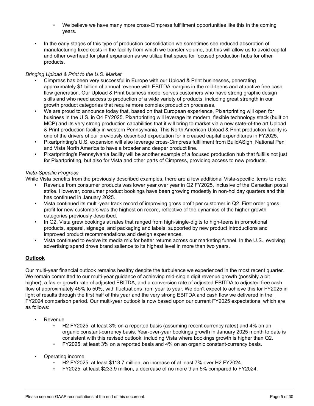 ◦ We believe we have many more cross-Cimpress fulfillment opportunities like this in the coming years. • In the early stages of this type of production consolidation we sometimes see reduced absorption of manufacturing fixed costs in the facility from which we transfer volume, but this will allow us to avoid capital and other overhead for plant expansion as we utilize that space for focused production hubs for other products. Bringing Upload & Print to the U.S. Market • Cimpress has been very successful in Europe with our Upload & Print businesses, generating approximately $1 billion of annual revenue with EBITDA margins in the mid-teens and attractive free cash flow generation. Our Upload & Print business model serves customers who have strong graphic design skills and who need access to production of a wide variety of products, including great strength in our growth product categories that require more complex production processes. • We are proud to announce today that, based on that European experience, Pixartprinting will open for business in the U.S. in Q4 FY2025. Pixartprinting will leverage its modern, flexible technology stack (built on MCP) and its very strong production capabilities that it will bring to market via a new state-of-the art Upload & Print production facility in western Pennsylvania. This North American Upload & Print production facility is one of the drivers of our previously described expectation for increased capital expenditures in FY2025. • Pixartprinting's U.S. expansion will also leverage cross-Cimpress fulfillment from BuildASign, National Pen and Vista North America to have a broader and deeper product line. • Pixartprinting's Pennsylvania facility will be another example of a focused production hub that fulfills not just for Pixartprinting, but also for Vista and other parts of Cimpress, providing access to new products. Vista-Specific Progress While Vista benefits from the previously described examples, there are a few additional Vista-specific items to note: • Revenue from consumer products was lower year over year in Q2 FY2025, inclusive of the Canadian postal strike. However, consumer product bookings have been growing modestly in non-holiday quarters and this has continued in January 2025. • Vista continued its multi-year track record of improving gross profit per customer in Q2. First order gross profit for new customers was the highest on record, reflective of the dynamics of the higher-growth categories previously described. • In Q2, Vista grew bookings at rates that ranged from high-single-digits to high-teens in promotional products, apparel, signage, and packaging and labels, supported by new product introductions and improved product recommendations and design experiences. • Vista continued to evolve its media mix for better returns across our marketing funnel. In the U.S., evolving advertising spend drove brand salience to its highest level in more than two years. Outlook Our multi-year financial outlook remains healthy despite the turbulence we experienced in the most recent quarter. We remain committed to our multi-year guidance of achieving mid-single digit revenue growth (possibly a bit higher), a faster growth rate of adjusted EBITDA, and a conversion rate of adjusted EBITDA to adjusted free cash flow of approximately 45% to 50%, with fluctuations from year to year. We don't expect to achieve this for FY2025 in light of results through the first half of this year and the very strong EBITDA and cash flow we delivered in the FY2024 comparison period. Our multi-year outlook is now based upon our current FY2025 expectations, which are as follows: • Revenue ◦ H2 FY2025: at least 3% on a reported basis (assuming recent currency rates) and 4% on an organic constant-currency basis. Year-over-year bookings growth in January 2025 month to date is consistent with this revised outlook, including Vista where bookings growth is higher than Q2. ◦ FY2025: at least 3% on a reported basis and 4% on an organic constant-currency basis. • Operating income ◦ H2 FY2025: at least $113.7 million, an increase of at least 7% over H2 FY2024. ◦ FY2025: at least $233.9 million, a decrease of no more than 5% compared to FY2024. Please see non-GAAP reconciliations at the end of this document. Page 5 of 30