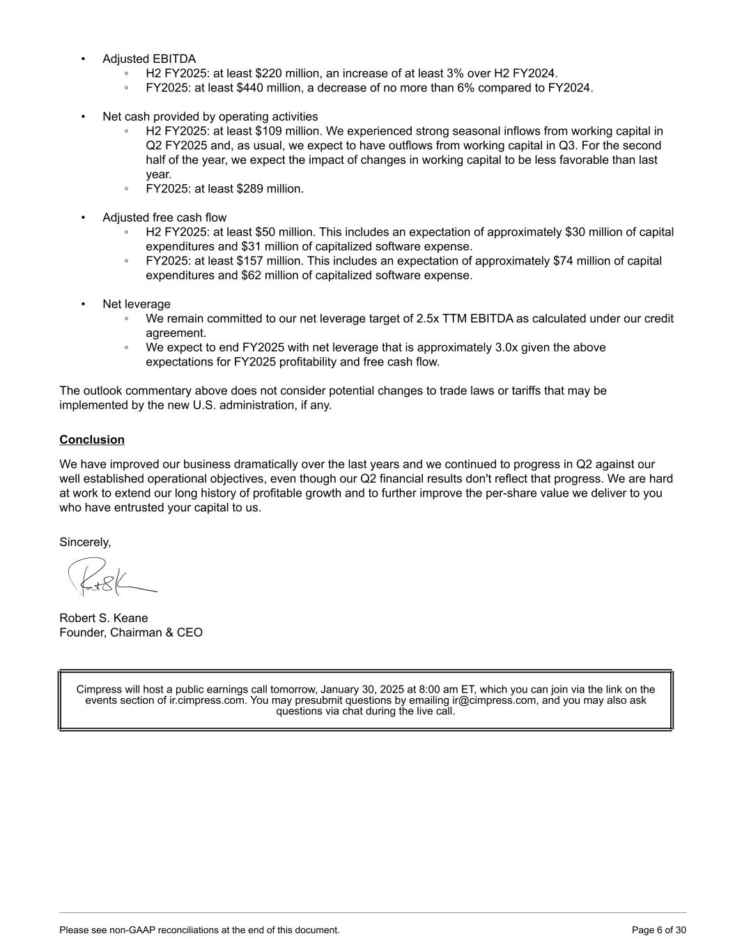 • Adjusted EBITDA ◦ H2 FY2025: at least $220 million, an increase of at least 3% over H2 FY2024. ◦ FY2025: at least $440 million, a decrease of no more than 6% compared to FY2024. • Net cash provided by operating activities ◦ H2 FY2025: at least $109 million. We experienced strong seasonal inflows from working capital in Q2 FY2025 and, as usual, we expect to have outflows from working capital in Q3. For the second half of the year, we expect the impact of changes in working capital to be less favorable than last year. ◦ FY2025: at least $289 million. • Adjusted free cash flow ◦ H2 FY2025: at least $50 million. This includes an expectation of approximately $30 million of capital expenditures and $31 million of capitalized software expense. ◦ FY2025: at least $157 million. This includes an expectation of approximately $74 million of capital expenditures and $62 million of capitalized software expense. • Net leverage ◦ We remain committed to our net leverage target of 2.5x TTM EBITDA as calculated under our credit agreement. ◦ We expect to end FY2025 with net leverage that is approximately 3.0x given the above expectations for FY2025 profitability and free cash flow. The outlook commentary above does not consider potential changes to trade laws or tariffs that may be implemented by the new U.S. administration, if any. Conclusion We have improved our business dramatically over the last years and we continued to progress in Q2 against our well established operational objectives, even though our Q2 financial results don't reflect that progress. We are hard at work to extend our long history of profitable growth and to further improve the per-share value we deliver to you who have entrusted your capital to us. Sincerely, Robert S. Keane Founder, Chairman & CEO Cimpress will host a public earnings call tomorrow, January 30, 2025 at 8:00 am ET, which you can join via the link on the events section of ir.cimpress.com. You may presubmit questions by emailing ir@cimpress.com, and you may also ask questions via chat during the live call. Please see non-GAAP reconciliations at the end of this document. Page 6 of 30