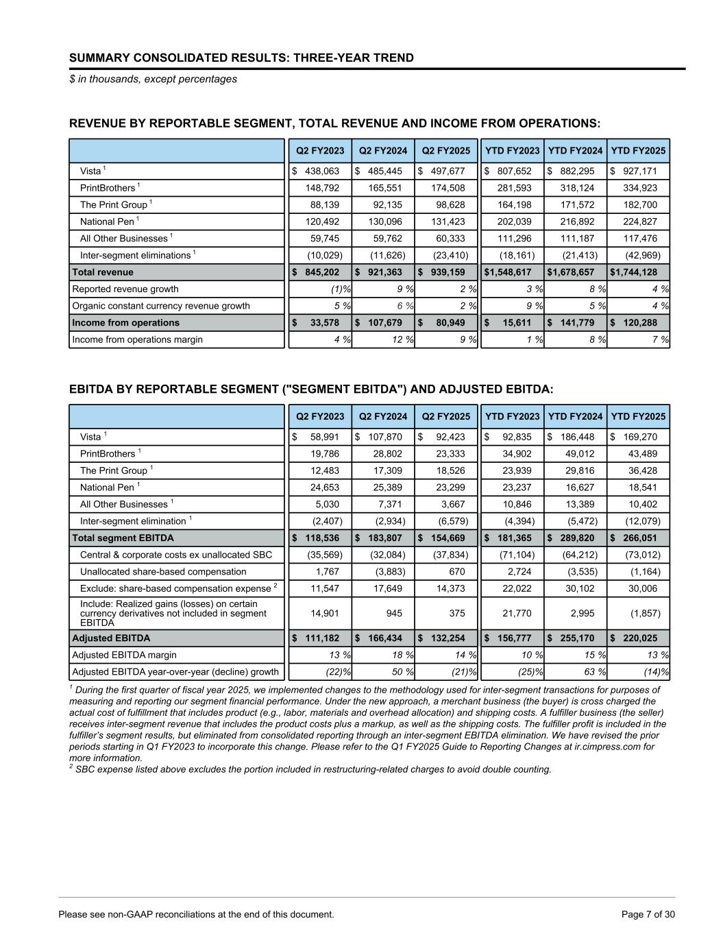 SUMMARY CONSOLIDATED RESULTS: THREE-YEAR TREND $ in thousands, except percentages REVENUE BY REPORTABLE SEGMENT, TOTAL REVENUE AND INCOME FROM OPERATIONS: Q2 FY2023 Q2 FY2024 Q2 FY2025 YTD FY2023 YTD FY2024 YTD FY2025 Vista 1 $ 438,063 $ 485,445 $ 497,677 $ 807,652 $ 882,295 $ 927,171 PrintBrothers 1 148,792 165,551 174,508 281,593 318,124 334,923 The Print Group 1 88,139 92,135 98,628 164,198 171,572 182,700 National Pen 1 120,492 130,096 131,423 202,039 216,892 224,827 All Other Businesses 1 59,745 59,762 60,333 111,296 111,187 117,476 Inter-segment eliminations 1 (10,029) (11,626) (23,410) (18,161) (21,413) (42,969) Total revenue $ 845,202 $ 921,363 $ 939,159 $ 1,548,617 $ 1,678,657 $ 1,744,128 Reported revenue growth (1) % 9 % 2 % 3 % 8 % 4 % Organic constant currency revenue growth 5 % 6 % 2 % 9 % 5 % 4 % Income from operations $ 33,578 $ 107,679 $ 80,949 $ 15,611 $ 141,779 $ 120,288 Income from operations margin 4 % 12 % 9 % 1 % 8 % 7 % EBITDA BY REPORTABLE SEGMENT ("SEGMENT EBITDA") AND ADJUSTED EBITDA: Q2 FY2023 Q2 FY2024 Q2 FY2025 YTD FY2023 YTD FY2024 YTD FY2025 Vista 1 $ 58,991 $ 107,870 $ 92,423 $ 92,835 $ 186,448 $ 169,270 PrintBrothers 1 19,786 28,802 23,333 34,902 49,012 43,489 The Print Group 1 12,483 17,309 18,526 23,939 29,816 36,428 National Pen 1 24,653 25,389 23,299 23,237 16,627 18,541 All Other Businesses 1 5,030 7,371 3,667 10,846 13,389 10,402 Inter-segment elimination 1 (2,407) (2,934) (6,579) (4,394) (5,472) (12,079) Total segment EBITDA $ 118,536 $ 183,807 $ 154,669 $ 181,365 $ 289,820 $ 266,051 Central & corporate costs ex unallocated SBC (35,569) (32,084) (37,834) (71,104) (64,212) (73,012) Unallocated share-based compensation 1,767 (3,883) 670 2,724 (3,535) (1,164) Exclude: share-based compensation expense 2 11,547 17,649 14,373 22,022 30,102 30,006 Include: Realized gains (losses) on certain currency derivatives not included in segment EBITDA 14,901 945 375 21,770 2,995 (1,857) Adjusted EBITDA $ 111,182 $ 166,434 $ 132,254 $ 156,777 $ 255,170 $ 220,025 Adjusted EBITDA margin 13 % 18 % 14 % 10 % 15 % 13 % Adjusted EBITDA year-over-year (decline) growth (22) % 50 % (21) % (25) % 63 % (14) % 1 During the first quarter of fiscal year 2025, we implemented changes to the methodology used for inter-segment transactions for purposes of measuring and reporting our segment financial performance. Under the new approach, a merchant business (the buyer) is cross charged the actual cost of fulfillment that includes product (e.g., labor, materials and overhead allocation) and shipping costs. A fulfiller business (the seller) receives inter-segment revenue that includes the product costs plus a markup, as well as the shipping costs. The fulfiller profit is included in the fulfiller’s segment results, but eliminated from consolidated reporting through an inter-segment EBITDA elimination. We have revised the prior periods starting in Q1 FY2023 to incorporate this change. Please refer to the Q1 FY2025 Guide to Reporting Changes at ir.cimpress.com for more information. 2 SBC expense listed above excludes the portion included in restructuring-related charges to avoid double counting. Please see non-GAAP reconciliations at the end of this document. Page 7 of 30
