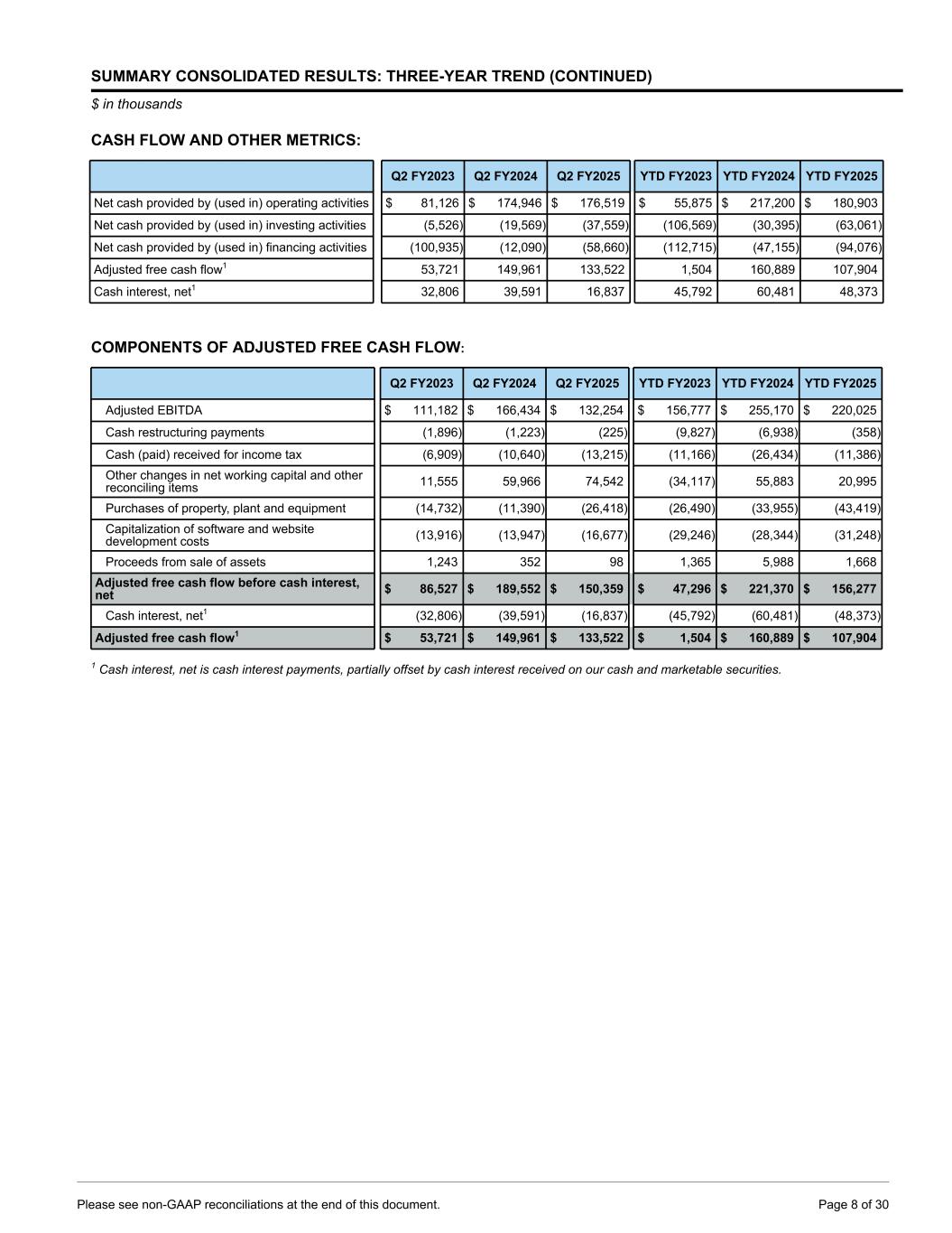 SUMMARY CONSOLIDATED RESULTS: THREE-YEAR TREND (CONTINUED) $ in thousands CASH FLOW AND OTHER METRICS: Q2 FY2023 Q2 FY2024 Q2 FY2025 YTD FY2023 YTD FY2024 YTD FY2025 Net cash provided by (used in) operating activities $ 81,126 $ 174,946 $ 176,519 $ 55,875 $ 217,200 $ 180,903 Net cash provided by (used in) investing activities (5,526) (19,569) (37,559) (106,569) (30,395) (63,061) Net cash provided by (used in) financing activities (100,935) (12,090) (58,660) (112,715) (47,155) (94,076) Adjusted free cash flow1 53,721 149,961 133,522 1,504 160,889 107,904 Cash interest, net1 32,806 39,591 16,837 45,792 60,481 48,373 COMPONENTS OF ADJUSTED FREE CASH FLOW: Q2 FY2023 Q2 FY2024 Q2 FY2025 YTD FY2023 YTD FY2024 YTD FY2025 Adjusted EBITDA $ 111,182 $ 166,434 $ 132,254 $ 156,777 $ 255,170 $ 220,025 Cash restructuring payments (1,896) (1,223) (225) (9,827) (6,938) (358) Cash (paid) received for income tax (6,909) (10,640) (13,215) (11,166) (26,434) (11,386) Other changes in net working capital and other reconciling items 11,555 59,966 74,542 (34,117) 55,883 20,995 Purchases of property, plant and equipment (14,732) (11,390) (26,418) (26,490) (33,955) (43,419) Capitalization of software and website development costs (13,916) (13,947) (16,677) (29,246) (28,344) (31,248) Proceeds from sale of assets 1,243 352 98 1,365 5,988 1,668 Adjusted free cash flow before cash interest, net $ 86,527 $ 189,552 $ 150,359 $ 47,296 $ 221,370 $ 156,277 Cash interest, net1 (32,806) (39,591) (16,837) (45,792) (60,481) (48,373) Adjusted free cash flow1 $ 53,721 $ 149,961 $ 133,522 $ 1,504 $ 160,889 $ 107,904 1 Cash interest, net is cash interest payments, partially offset by cash interest received on our cash and marketable securities. Please see non-GAAP reconciliations at the end of this document. Page 8 of 30