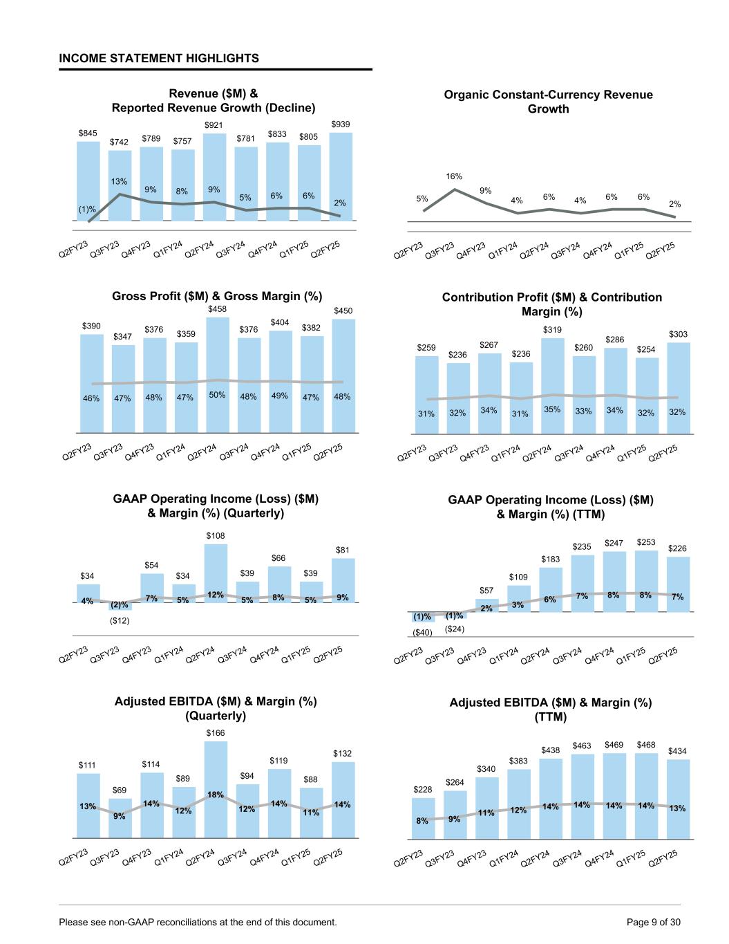 INCOME STATEMENT HIGHLIGHTS Revenue ($M) & Reported Revenue Growth (Decline) $845 $742 $789 $757 $921 $781 $833 $805 $939 (1)% 13% 9% 8% 9% 5% 6% 6% 2% Q2FY23 Q3FY23 Q4FY23 Q1FY24 Q2FY24 Q3FY24 Q4FY24 Q1FY25 Q2FY25 Gross Profit ($M) & Gross Margin (%) $390 $347 $376 $359 $458 $376 $404 $382 $450 46% 47% 48% 47% 50% 48% 49% 47% 48% Q2FY23 Q3FY23 Q4FY23 Q1FY24 Q2FY24 Q3FY24 Q4FY24 Q1FY25 Q2FY25 GAAP Operating Income (Loss) ($M) & Margin (%) (Quarterly) $34 ($12) $54 $34 $108 $39 $66 $39 $81 4% (2)% 7% 5% 12% 5% 8% 5% 9% Q2FY23 Q3FY23 Q4FY23 Q1FY24 Q2FY24 Q3FY24 Q4FY24 Q1FY25 Q2FY25 Adjusted EBITDA ($M) & Margin (%) (Quarterly) $111 $69 $114 $89 $166 $94 $119 $88 $132 13% 9% 14% 12% 18% 12% 14% 11% 14% Q2FY23 Q3FY23 Q4FY23 Q1FY24 Q2FY24 Q3FY24 Q4FY24 Q1FY25 Q2FY25 Organic Constant-Currency Revenue Growth 5% 16% 9% 4% 6% 4% 6% 6% 2% Q2FY23 Q3FY23 Q4FY23 Q1FY24 Q2FY24 Q3FY24 Q4FY24 Q1FY25 Q2FY25 Contribution Profit ($M) & Contribution Margin (%) $259 $236 $267 $236 $319 $260 $286 $254 $303 31% 32% 34% 31% 35% 33% 34% 32% 32% Q2FY23 Q3FY23 Q4FY23 Q1FY24 Q2FY24 Q3FY24 Q4FY24 Q1FY25 Q2FY25 GAAP Operating Income (Loss) ($M) & Margin (%) (TTM) ($40) ($24) $57 $109 $183 $235 $247 $253 $226 (1)% (1)% 2% 3% 6% 7% 8% 8% 7% Q2FY23 Q3FY23 Q4FY23 Q1FY24 Q2FY24 Q3FY24 Q4FY24 Q1FY25 Q2FY25 Adjusted EBITDA ($M) & Margin (%) (TTM) $228 $264 $340 $383 $438 $463 $469 $468 $434 8% 9% 11% 12% 14% 14% 14% 14% 13% Q2FY23 Q3FY23 Q4FY23 Q1FY24 Q2FY24 Q3FY24 Q4FY24 Q1FY25 Q2FY25 Please see non-GAAP reconciliations at the end of this document. Page 9 of 30