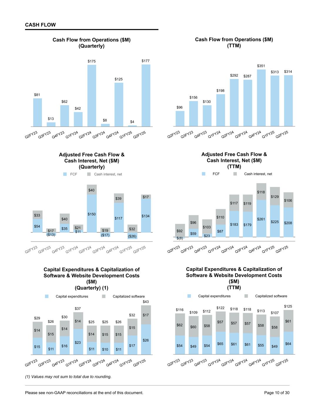 CASH FLOW Cash Flow from Operations ($M) (Quarterly) $81 $13 $62 $42 $175 $8 $125 $4 $177 Q2FY23 Q3FY23 Q4FY23 Q1FY24 Q2FY24 Q3FY24 Q4FY24 Q1FY25 Q2FY25 Adjusted Free Cash Flow & Cash Interest, Net ($M) (Quarterly) $54 ($13) $35 $11 $150 ($17) $117 ($26) $134$33 $17 $40 $21 $40 $19 $39 $32 $17 FCF Cash interest, net Q2FY23 Q3FY23 Q4FY23 Q1FY24 Q2FY24 Q3FY24 Q4FY24 Q1FY25 Q2FY25 Capital Expenditures & Capitalization of Software & Website Development Costs ($M) (Quarterly) (1) $15 $11 $16 $23 $11 $10 $11 $17 $26 $14 $15 $14 $14 $14 $15 $15 $15 $17 $29 $26 $30 $37 $25 $25 $26 $32 $43 Capital expenditures Capitalized software Q2FY23 Q3FY23 Q4FY23 Q1FY24 Q2FY24 Q3FY24 Q4FY24 Q1FY25 Q2FY25 (1) Values may not sum to total due to rounding. Cash Flow from Operations ($M) (TTM) $96 $156 $130 $198 $292 $287 $351 $313 $314 Q2FY23 Q3FY23 Q4FY23 Q1FY24 Q2FY24 Q3FY24 Q4FY24 Q1FY25 Q2FY25 Adjusted Free Cash Flow & Cash Interest, Net ($M) (TTM) $(8) $59 $23 $87 $183 $179 $261 $225 $208 $92 $96 $103 $110 $117 $119 $118 $129 $106 FCF Cash interest, net Q2FY23 Q3FY23 Q4FY23 Q1FY24 Q2FY24 Q3FY24 Q4FY24 Q1FY25 Q2FY25 Capital Expenditures & Capitalization of Software & Website Development Costs ($M) (TTM) $54 $49 $54 $65 $61 $61 $55 $49 $64 $62 $60 $58 $57 $57 $57 $58 $58 $61 $116 $109 $112 $122 $118 $118 $113 $107 $125 Capital expenditures Capitalized software Q2FY23 Q3FY23 Q4FY23 Q1FY24 Q2FY24 Q3FY24 Q4FY24 Q1FY25 Q2FY25 Please see non-GAAP reconciliations at the end of this document. Page 10 of 30