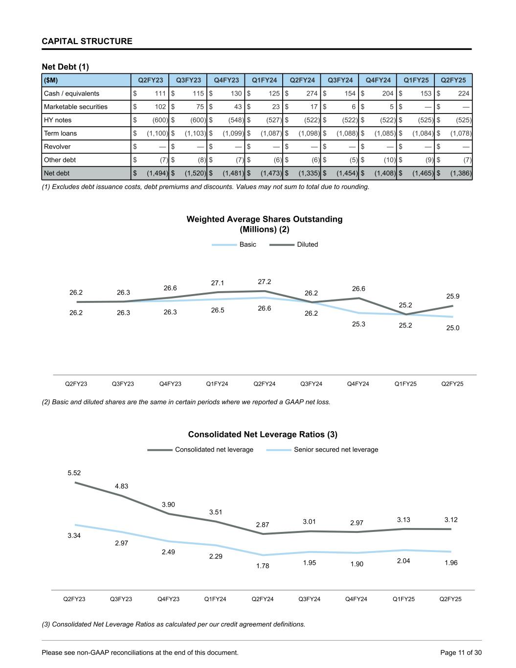 CAPITAL STRUCTURE Net Debt (1) ($M) Q2FY23 Q3FY23 Q4FY23 Q1FY24 Q2FY24 Q3FY24 Q4FY24 Q1FY25 Q2FY25 Cash / equivalents $ 111 $ 115 $ 130 $ 125 $ 274 $ 154 $ 204 $ 153 $ 224 Marketable securities $ 102 $ 75 $ 43 $ 23 $ 17 $ 6 $ 5 $ — $ — HY notes $ (600) $ (600) $ (548) $ (527) $ (522) $ (522) $ (522) $ (525) $ (525) Term loans $ (1,100) $ (1,103) $ (1,099) $ (1,087) $ (1,098) $ (1,088) $ (1,085) $ (1,084) $ (1,078) Revolver $ — $ — $ — $ — $ — $ — $ — $ — $ — Other debt $ (7) $ (8) $ (7) $ (6) $ (6) $ (5) $ (10) $ (9) $ (7) Net debt $ (1,494) $ (1,520) $ (1,481) $ (1,473) $ (1,335) $ (1,454) $ (1,408) $ (1,465) $ (1,386) (1) Excludes debt issuance costs, debt premiums and discounts. Values may not sum to total due to rounding. Weighted Average Shares Outstanding (Millions) (2) 26.2 26.3 26.3 26.5 26.6 26.2 25.3 25.2 25.0 26.2 26.3 26.6 27.1 27.2 26.2 26.6 25.2 25.9 Basic Diluted Q2FY23 Q3FY23 Q4FY23 Q1FY24 Q2FY24 Q3FY24 Q4FY24 Q1FY25 Q2FY25 (2) Basic and diluted shares are the same in certain periods where we reported a GAAP net loss. Consolidated Net Leverage Ratios (3) 5.52 4.83 3.90 3.51 2.87 3.01 2.97 3.13 3.12 3.34 2.97 2.49 2.29 1.78 1.95 1.90 2.04 1.96 Consolidated net leverage Senior secured net leverage Q2FY23 Q3FY23 Q4FY23 Q1FY24 Q2FY24 Q3FY24 Q4FY24 Q1FY25 Q2FY25 (3) Consolidated Net Leverage Ratios as calculated per our credit agreement definitions. Please see non-GAAP reconciliations at the end of this document. Page 11 of 30
