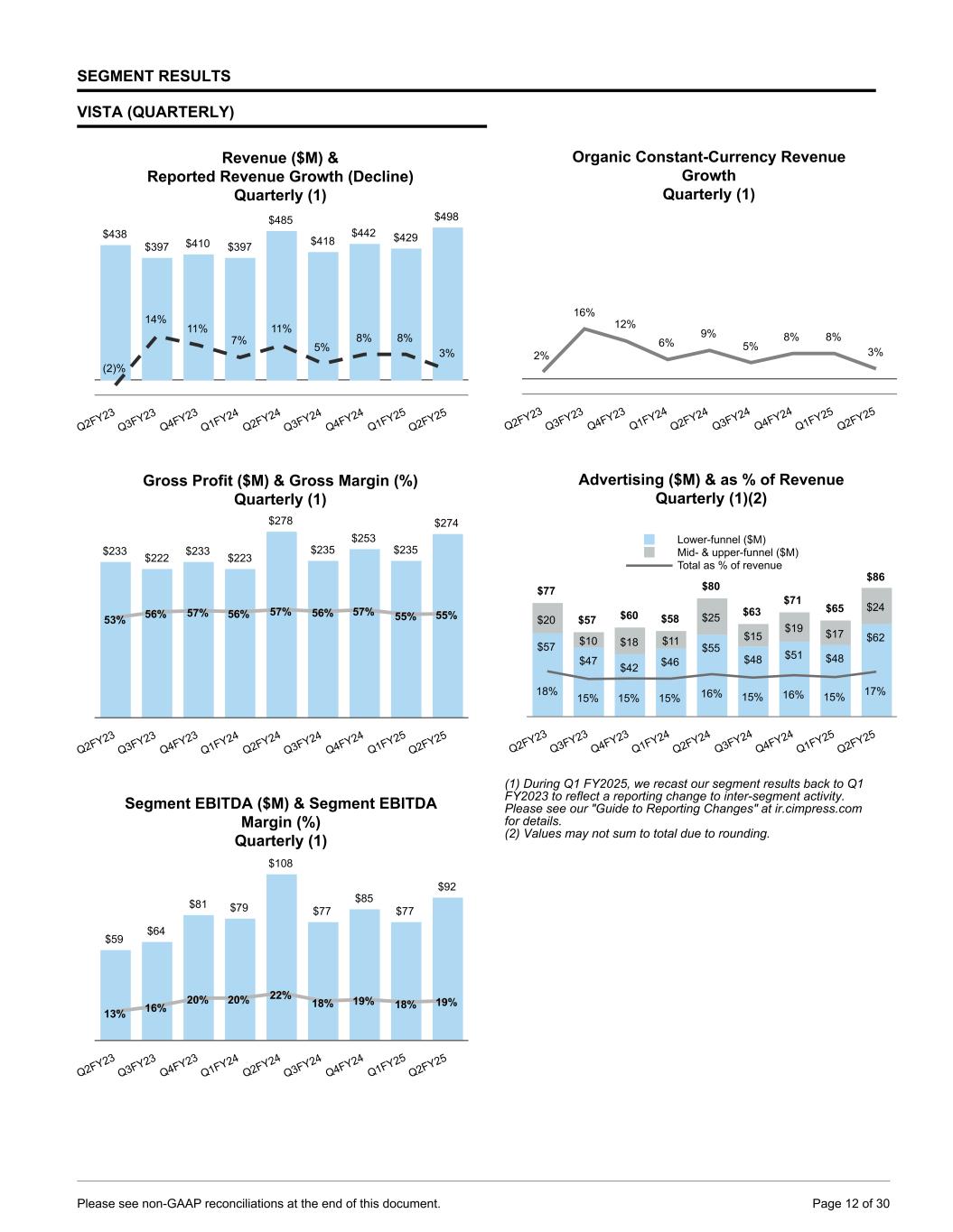 SEGMENT RESULTS VISTA (QUARTERLY) Revenue ($M) & Reported Revenue Growth (Decline) Quarterly (1) $438 $397 $410 $397 $485 $418 $442 $429 $498 (2)% 14% 11% 7% 11% 5% 8% 8% 3% Q2FY23 Q3FY23 Q4FY23 Q1FY24 Q2FY24 Q3FY24 Q4FY24 Q1FY25 Q2FY25 Gross Profit ($M) & Gross Margin (%) Quarterly (1) $233 $222 $233 $223 $278 $235 $253 $235 $274 53% 56% 57% 56% 57% 56% 57% 55% 55% Q2FY23 Q3FY23 Q4FY23 Q1FY24 Q2FY24 Q3FY24 Q4FY24 Q1FY25 Q2FY25 Segment EBITDA ($M) & Segment EBITDA Margin (%) Quarterly (1) $59 $64 $81 $79 $108 $77 $85 $77 $92 13% 16% 20% 20% 22% 18% 19% 18% 19% Q2FY23 Q3FY23 Q4FY23 Q1FY24 Q2FY24 Q3FY24 Q4FY24 Q1FY25 Q2FY25 Organic Constant-Currency Revenue Growth Quarterly (1) 2% 16% 12% 6% 9% 5% 8% 8% 3% Q2FY23 Q3FY23 Q4FY23 Q1FY24 Q2FY24 Q3FY24 Q4FY24 Q1FY25 Q2FY25 Advertising ($M) & as % of Revenue Quarterly (1)(2) $77 $57 $60 $58 $80 $63 $71 $65 $86 $57 $47 $42 $46 $55 $48 $51 $48 $62 $20 $10 $18 $11 $25 $15 $19 $17 $24 18% 15% 15% 15% 16% 15% 16% 15% 17% Lower-funnel ($M) Mid- & upper-funnel ($M) Total as % of revenue Q2FY23 Q3FY23 Q4FY23 Q1FY24 Q2FY24 Q3FY24 Q4FY24 Q1FY25 Q2FY25 (1) During Q1 FY2025, we recast our segment results back to Q1 FY2023 to reflect a reporting change to inter-segment activity. Please see our "Guide to Reporting Changes" at ir.cimpress.com for details. (2) Values may not sum to total due to rounding. Please see non-GAAP reconciliations at the end of this document. Page 12 of 30