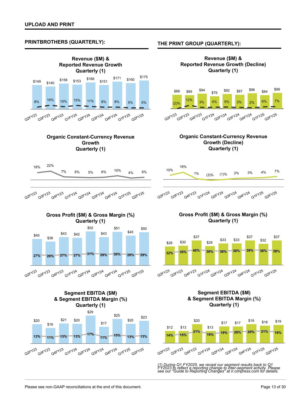 UPLOAD AND PRINT PRINTBROTHERS (QUARTERLY): Revenue ($M) & Reported Revenue Growth Quarterly (1) $149 $140 $158 $153 $166 $151 $171 $160 $175 8% 16% 10% 15% 11% 8% 8% 5% 5% Q2FY23 Q3FY23 Q4FY23 Q1FY24 Q2FY24 Q3FY24 Q4FY24 Q1FY25 Q2FY25 Organic Constant-Currency Revenue Growth Quarterly (1) 18% 22% 7% 6% 5% 6% 10% 4% 6% Q2FY23 Q3FY23 Q4FY23 Q1FY24 Q2FY24 Q3FY24 Q4FY24 Q1FY25 Q2FY25 Gross Profit ($M) & Gross Margin (%) Quarterly (1) $40 $36 $43 $42 $52 $43 $51 $45 $50 27% 26% 27% 27% 31% 29% 30% 28% 29% Q2FY23 Q3FY23 Q4FY23 Q1FY24 Q2FY24 Q3FY24 Q4FY24 Q1FY25 Q2FY25 Segment EBITDA ($M) & Segment EBITDA Margin (%) Quarterly (1) $20 $16 $21 $20 $29 $17 $25 $20 $23 13% 11% 13% 13% 17% 11% 15% 13% 13% Q2FY23 Q3FY23 Q4FY23 Q1FY24 Q2FY24 Q3FY24 Q4FY24 Q1FY25 Q2FY25 THE PRINT GROUP (QUARTERLY): Revenue ($M) & Reported Revenue Growth (Decline) Quarterly (1) $88 $85 $94 $79 $92 $87 $96 $84 $99 (2)% 12% 3% 4% 5% 3% 2% 6% 7% Q2FY23 Q3FY23 Q4FY23 Q1FY24 Q2FY24 Q3FY24 Q4FY24 Q1FY25 Q2FY25 0 Organic Constant-Currency Revenue Growth (Decline) Quarterly (1) 10% 18% 1% (3)% (1)% 2% 3% 4% 7% Q2FY23 Q3FY23 Q4FY23 Q1FY24 Q2FY24 Q3FY24 Q4FY24 Q1FY25 Q2FY25 Gross Profit ($M) & Gross Margin (%) Quarterly (1) $28 $30 $37 $29 $33 $33 $37 $32 $37 32% 35% 40% 36% 36% 38% 39% 38% 38% Q2FY23 Q3FY23 Q4FY23 Q1FY24 Q2FY24 Q3FY24 Q4FY24 Q1FY25 Q2FY25 Segment EBITDA ($M) & Segment EBITDA Margin (%) Quarterly (1) $12 $13 $20 $13 $17 $17 $19 $18 $19 14% 15% 21% 16% 19% 20% 20% 21% 19% Q2FY23 Q3FY23 Q4FY23 Q1FY24 Q2FY24 Q3FY24 Q4FY24 Q1FY25 Q2FY25 (1) During Q1 FY2025, we recast our segment results back to Q1 FY2023 to reflect a reporting change to inter-segment activity. Please see our "Guide to Reporting Changes" at ir.cimpress.com for details. Please see non-GAAP reconciliations at the end of this document. Page 13 of 30