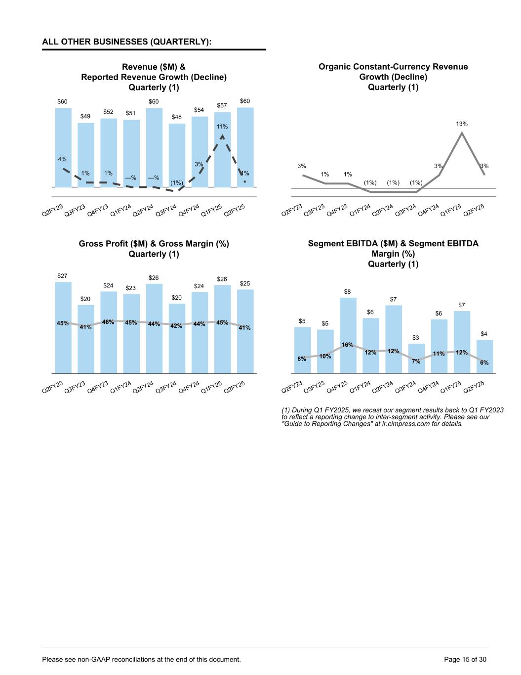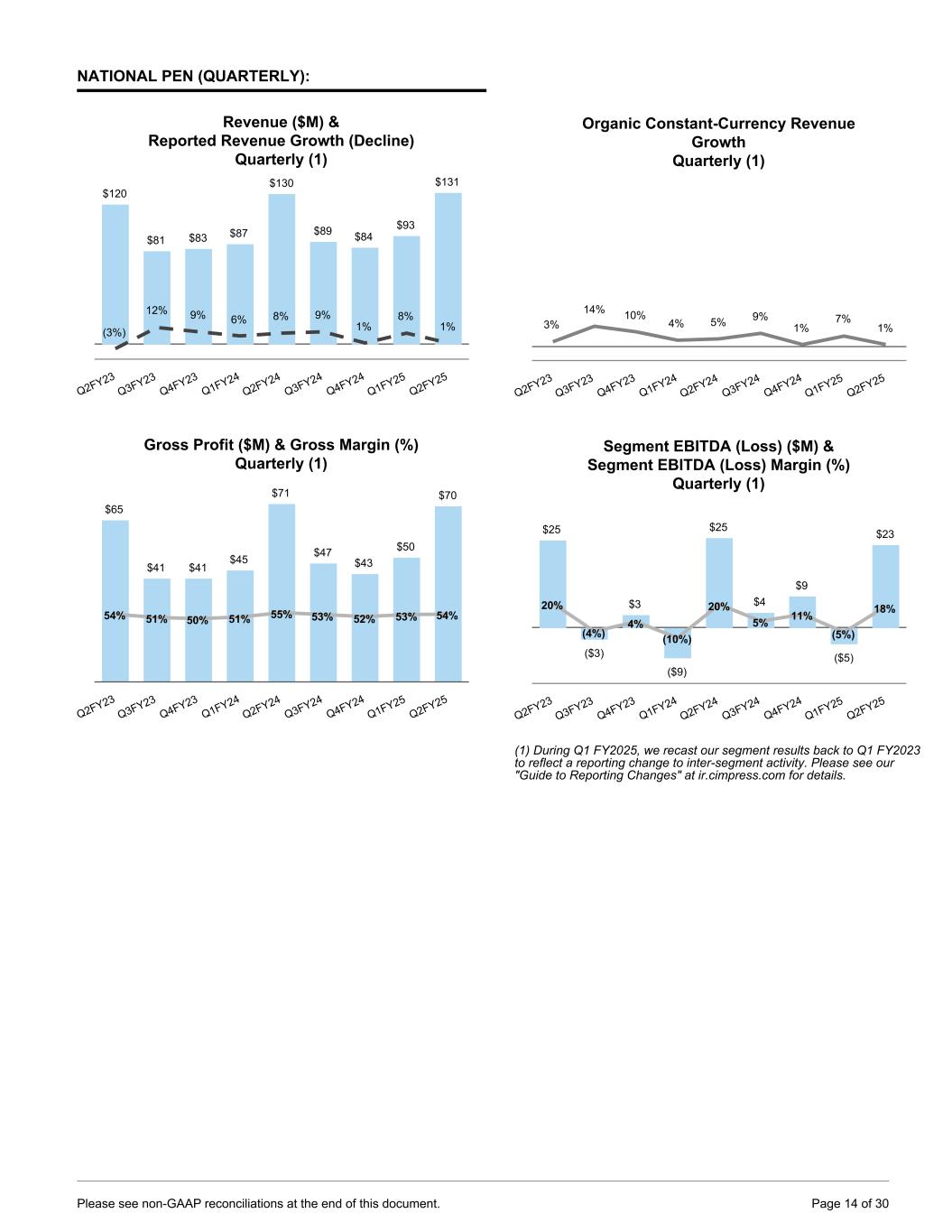 NATIONAL PEN (QUARTERLY): Revenue ($M) & Reported Revenue Growth (Decline) Quarterly (1) $120 $81 $83 $87 $130 $89 $84 $93 $131 (3%) 12% 9% 6% 8% 9% 1% 8% 1% Q2FY23 Q3FY23 Q4FY23 Q1FY24 Q2FY24 Q3FY24 Q4FY24 Q1FY25 Q2FY25 Gross Profit ($M) & Gross Margin (%) Quarterly (1) $65 $41 $41 $45 $71 $47 $43 $50 $70 54% 51% 50% 51% 55% 53% 52% 53% 54% Q2FY23 Q3FY23 Q4FY23 Q1FY24 Q2FY24 Q3FY24 Q4FY24 Q1FY25 Q2FY25 Organic Constant-Currency Revenue Growth Quarterly (1) 3% 14% 10% 4% 5% 9% 1% 7% 1% Q2FY23 Q3FY23 Q4FY23 Q1FY24 Q2FY24 Q3FY24 Q4FY24 Q1FY25 Q2FY25 Segment EBITDA (Loss) ($M) & Segment EBITDA (Loss) Margin (%) Quarterly (1) $25 ($3) $3 ($9) $25 $4 $9 ($5) $23 20% (4%) 4% (10%) 20% 5% 11% (5%) 18% Q2FY23 Q3FY23 Q4FY23 Q1FY24 Q2FY24 Q3FY24 Q4FY24 Q1FY25 Q2FY25 (1) During Q1 FY2025, we recast our segment results back to Q1 FY2023 to reflect a reporting change to inter-segment activity. Please see our "Guide to Reporting Changes" at ir.cimpress.com for details. Please see non-GAAP reconciliations at the end of this document. Page 14 of 30