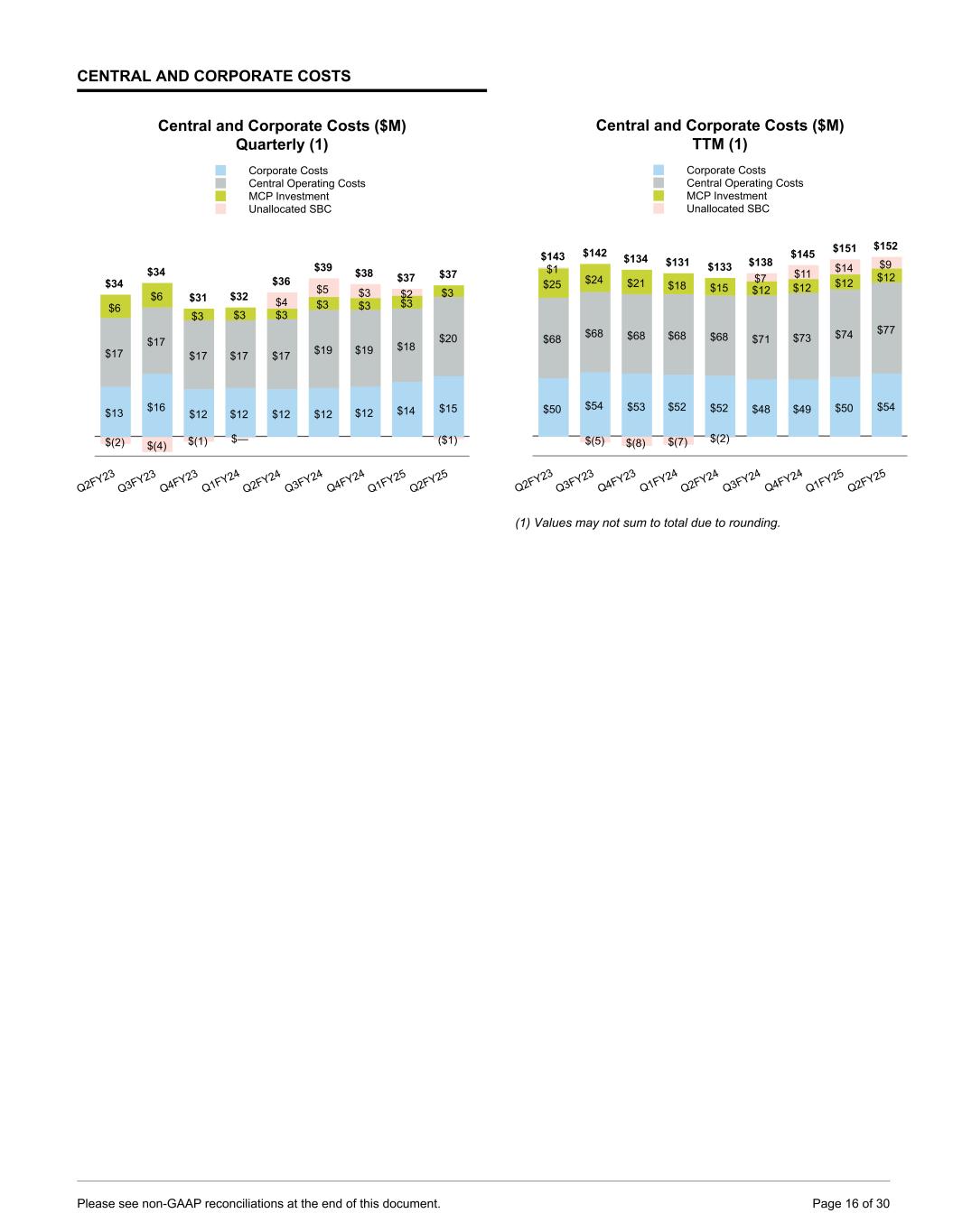 CENTRAL AND CORPORATE COSTS Central and Corporate Costs ($M) Quarterly (1) $13 $16 $12 $12 $12 $12 $12 $14 $15 $17 $17 $17 $17 $17 $19 $19 $18 $20 $6 $6 $3 $3 $3 $3 $3 $3 $3 $(2) $(4) $(1) $— $4 $5 $3 $2 ($1) $34 $34 $31 $32 $36 $39 $38 $37 $37 Corporate Costs Central Operating Costs MCP Investment Unallocated SBC Q2FY23 Q3FY23 Q4FY23 Q1FY24 Q2FY24 Q3FY24 Q4FY24 Q1FY25 Q2FY25 Central and Corporate Costs ($M) TTM (1) $50 $54 $53 $52 $52 $48 $49 $50 $54 $68 $68 $68 $68 $68 $71 $73 $74 $77 $25 $24 $21 $18 $15 $12 $12 $12 $12 $1 $(5) $(8) $(7) $(2) $7 $11 $14 $9 $143 $142 $134 $131 $133 $138 $145 $151 $152 Corporate Costs Central Operating Costs MCP Investment Unallocated SBC Q2FY23 Q3FY23 Q4FY23 Q1FY24 Q2FY24 Q3FY24 Q4FY24 Q1FY25 Q2FY25 (1) Values may not sum to total due to rounding. Please see non-GAAP reconciliations at the end of this document. Page 16 of 30