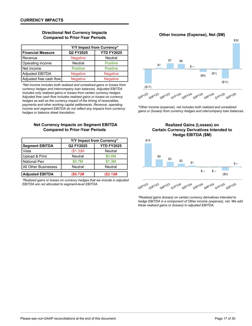 CURRENCY IMPACTS Directional Net Currency Impacts Compared to Prior-Year Periods Y/Y Impact from Currency* Financial Measure Q2 FY2025 YTD FY2025 Revenue Negative Neutral Operating income Neutral Positive Net income Positive Positive Adjusted EBITDA Negative Negative Adjusted free cash flow Negative Negative *Net income includes both realized and unrealized gains or losses from currency hedges and intercompany loan balances. Adjusted EBITDA includes only realized gains or losses from certain currency hedges. Adjusted free cash flow includes realized gains or losses on currency hedges as well as the currency impact of the timing of receivables, payments and other working capital settlements. Revenue, operating income and segment EBITDA do not reflect any impacts from currency hedges or balance sheet translation. Net Currency Impacts on Segment EBITDA Compared to Prior-Year Periods Y/Y Impact from Currency* Segment EBITDA Q2 FY2025 YTD FY2025 Vista ($1.3)M Neutral Upload & Print Neutral $0.6M National Pen $0.7M $1.3M All Other Businesses Neutral Neutral Adjusted EBITDA ($0.7)M ($2.1)M *Realized gains or losses on currency hedges that we include in adjusted EBITDA are not allocated to segment-level EBITDA. Other Income (Expense), Net ($M) ($17) $1 $7 $6 $— ($4) ($1) ($11) $32 Q2FY23 Q3FY23 Q4FY23 Q1FY24 Q2FY24 Q3FY24 Q4FY24 Q1FY25 Q2FY25 *Other income (expense), net includes both realized and unrealized gains or (losses) from currency hedges and intercompany loan balances. Realized Gains (Losses) on Certain Currency Derivatives Intended to Hedge EBITDA ($M) $15 $5 $3 $2 $1 $— $— ($2) $— Q2FY23 Q3FY23 Q4FY23 Q1FY24 Q2FY24 Q3FY24 Q4FY24 Q1FY25 Q2FY25 *Realized gains (losses) on certain currency derivatives intended to hedge EBITDA is a component of Other income (expense), net. We add these realized gains or (losses) to adjusted EBITDA. Please see non-GAAP reconciliations at the end of this document. Page 17 of 30