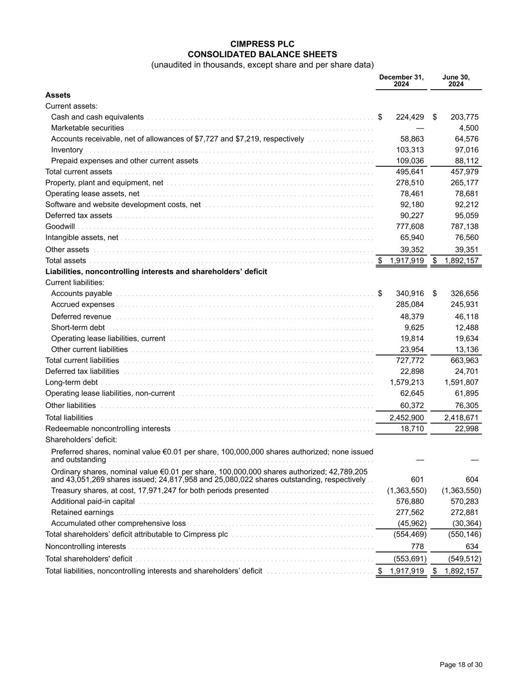 CIMPRESS PLC CONSOLIDATED BALANCE SHEETS (unaudited in thousands, except share and per share data) December 31, 2024 June 30, 2024 Assets Current assets: Cash and cash equivalents . . . . . . . . . . . . . . . . . . . . . . . . . . . . . . . . . . . . . . . . . . . . . . . . . . . . . . . . . . . $ 224,429 $ 203,775 Marketable securities . . . . . . . . . . . . . . . . . . . . . . . . . . . . . . . . . . . . . . . . . . . . . . . . . . . . . . . . . . . . . . . . — 4,500 Accounts receivable, net of allowances of $7,727 and $7,219, respectively . . . . . . . . . . . . . . . . . 58,863 64,576 Inventory . . . . . . . . . . . . . . . . . . . . . . . . . . . . . . . . . . . . . . . . . . . . . . . . . . . . . . . . . . . . . . . . . . . . . . . . . . . 103,313 97,016 Prepaid expenses and other current assets . . . . . . . . . . . . . . . . . . . . . . . . . . . . . . . . . . . . . . . . . . . . . 109,036 88,112 Total current assets . . . . . . . . . . . . . . . . . . . . . . . . . . . . . . . . . . . . . . . . . . . . . . . . . . . . . . . . . . . . . . . . . . . 495,641 457,979 Property, plant and equipment, net . . . . . . . . . . . . . . . . . . . . . . . . . . . . . . . . . . . . . . . . . . . . . . . . . . . . . . 278,510 265,177 Operating lease assets, net . . . . . . . . . . . . . . . . . . . . . . . . . . . . . . . . . . . . . . . . . . . . . . . . . . . . . . . . . . . . 78,461 78,681 Software and website development costs, net . . . . . . . . . . . . . . . . . . . . . . . . . . . . . . . . . . . . . . . . . . . . 92,180 92,212 Deferred tax assets . . . . . . . . . . . . . . . . . . . . . . . . . . . . . . . . . . . . . . . . . . . . . . . . . . . . . . . . . . . . . . . . . . . 90,227 95,059 Goodwill . . . . . . . . . . . . . . . . . . . . . . . . . . . . . . . . . . . . . . . . . . . . . . . . . . . . . . . . . . . . . . . . . . . . . . . . . . . . . 777,608 787,138 Intangible assets, net . . . . . . . . . . . . . . . . . . . . . . . . . . . . . . . . . . . . . . . . . . . . . . . . . . . . . . . . . . . . . . . . . . 65,940 76,560 Other assets . . . . . . . . . . . . . . . . . . . . . . . . . . . . . . . . . . . . . . . . . . . . . . . . . . . . . . . . . . . . . . . . . . . . . . . . . 39,352 39,351 Total assets . . . . . . . . . . . . . . . . . . . . . . . . . . . . . . . . . . . . . . . . . . . . . . . . . . . . . . . . . . . . . . . . . . . . . . . . . . $ 1,917,919 $ 1,892,157 Liabilities, noncontrolling interests and shareholders’ deficit Current liabilities: Accounts payable . . . . . . . . . . . . . . . . . . . . . . . . . . . . . . . . . . . . . . . . . . . . . . . . . . . . . . . . . . . . . . . . . . . $ 340,916 $ 326,656 Accrued expenses . . . . . . . . . . . . . . . . . . . . . . . . . . . . . . . . . . . . . . . . . . . . . . . . . . . . . . . . . . . . . . . . . . . 285,084 245,931 Deferred revenue . . . . . . . . . . . . . . . . . . . . . . . . . . . . . . . . . . . . . . . . . . . . . . . . . . . . . . . . . . . . . . . . . . . 48,379 46,118 Short-term debt . . . . . . . . . . . . . . . . . . . . . . . . . . . . . . . . . . . . . . . . . . . . . . . . . . . . . . . . . . . . . . . . . . . . . 9,625 12,488 Operating lease liabilities, current . . . . . . . . . . . . . . . . . . . . . . . . . . . . . . . . . . . . . . . . . . . . . . . . . . . . . 19,814 19,634 Other current liabilities . . . . . . . . . . . . . . . . . . . . . . . . . . . . . . . . . . . . . . . . . . . . . . . . . . . . . . . . . . . . . . . 23,954 13,136 Total current liabilities . . . . . . . . . . . . . . . . . . . . . . . . . . . . . . . . . . . . . . . . . . . . . . . . . . . . . . . . . . . . . . . . . 727,772 663,963 Deferred tax liabilities . . . . . . . . . . . . . . . . . . . . . . . . . . . . . . . . . . . . . . . . . . . . . . . . . . . . . . . . . . . . . . . . . 22,898 24,701 Long-term debt . . . . . . . . . . . . . . . . . . . . . . . . . . . . . . . . . . . . . . . . . . . . . . . . . . . . . . . . . . . . . . . . . . . . . . . 1,579,213 1,591,807 Operating lease liabilities, non-current . . . . . . . . . . . . . . . . . . . . . . . . . . . . . . . . . . . . . . . . . . . . . . . . . . . 62,645 61,895 Other liabilities . . . . . . . . . . . . . . . . . . . . . . . . . . . . . . . . . . . . . . . . . . . . . . . . . . . . . . . . . . . . . . . . . . . . . . . 60,372 76,305 Total liabilities . . . . . . . . . . . . . . . . . . . . . . . . . . . . . . . . . . . . . . . . . . . . . . . . . . . . . . . . . . . . . . . . . . . . . . . . 2,452,900 2,418,671 Redeemable noncontrolling interests . . . . . . . . . . . . . . . . . . . . . . . . . . . . . . . . . . . . . . . . . . . . . . . . . . . . 18,710 22,998 Shareholders’ deficit: Preferred shares, nominal value €0.01 per share, 100,000,000 shares authorized; none issued and outstanding . . . . . . . . . . . . . . . . . . . . . . . . . . . . . . . . . . . . . . . . . . . . . . . . . . . . . . . . . . . . . . . . . . . . . — — Ordinary shares, nominal value €0.01 per share, 100,000,000 shares authorized; 42,789,205 and 43,051,269 shares issued; 24,817,958 and 25,080,022 shares outstanding, respectively . . 601 604 Treasury shares, at cost, 17,971,247 for both periods presented . . . . . . . . . . . . . . . . . . . . . . . . . . . (1,363,550) (1,363,550) Additional paid-in capital . . . . . . . . . . . . . . . . . . . . . . . . . . . . . . . . . . . . . . . . . . . . . . . . . . . . . . . . . . . . . 576,880 570,283 Retained earnings . . . . . . . . . . . . . . . . . . . . . . . . . . . . . . . . . . . . . . . . . . . . . . . . . . . . . . . . . . . . . . . . . . . 277,562 272,881 Accumulated other comprehensive loss . . . . . . . . . . . . . . . . . . . . . . . . . . . . . . . . . . . . . . . . . . . . . . . . (45,962) (30,364) Total shareholders’ deficit attributable to Cimpress plc . . . . . . . . . . . . . . . . . . . . . . . . . . . . . . . . . . . . . (554,469) (550,146) Noncontrolling interests . . . . . . . . . . . .