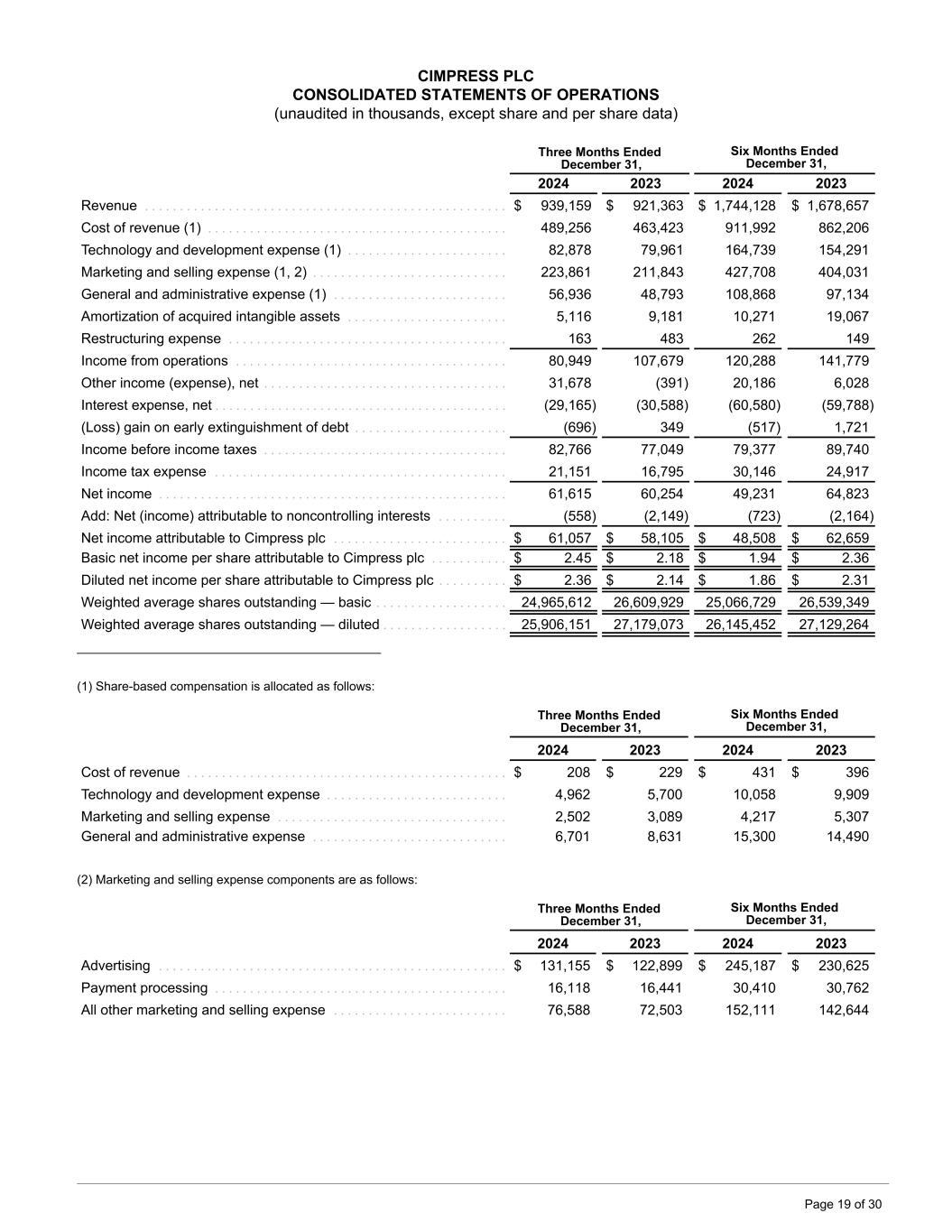 CIMPRESS PLC CONSOLIDATED STATEMENTS OF OPERATIONS (unaudited in thousands, except share and per share data) Three Months Ended December 31, Six Months Ended December 31, 2024 2023 2024 2023 Revenue . . . . . . . . . . . . . . . . . . . . . . . . . . . . . . . . . . . . . . . . . . . . . . . . . . . . $ 939,159 $ 921,363 $ 1,744,128 $ 1,678,657 Cost of revenue (1) . . . . . . . . . . . . . . . . . . . . . . . . . . . . . . . . . . . . . . . . . . . 489,256 463,423 911,992 862,206 Technology and development expense (1) . . . . . . . . . . . . . . . . . . . . . . . 82,878 79,961 164,739 154,291 Marketing and selling expense (1, 2) . . . . . . . . . . . . . . . . . . . . . . . . . . . . 223,861 211,843 427,708 404,031 General and administrative expense (1) . . . . . . . . . . . . . . . . . . . . . . . . . 56,936 48,793 108,868 97,134 Amortization of acquired intangible assets . . . . . . . . . . . . . . . . . . . . . . . 5,116 9,181 10,271 19,067 Restructuring expense . . . . . . . . . . . . . . . . . . . . . . . . . . . . . . . . . . . . . . . . 163 483 262 149 Income from operations . . . . . . . . . . . . . . . . . . . . . . . . . . . . . . . . . . . . . . . 80,949 107,679 120,288 141,779 Other income (expense), net . . . . . . . . . . . . . . . . . . . . . . . . . . . . . . . . . . . 31,678 (391) 20,186 6,028 Interest expense, net . . . . . . . . . . . . . . . . . . . . . . . . . . . . . . . . . . . . . . . . . . (29,165) (30,588) (60,580) (59,788) (Loss) gain on early extinguishment of debt . . . . . . . . . . . . . . . . . . . . . . (696) 349 (517) 1,721 Income before income taxes . . . . . . . . . . . . . . . . . . . . . . . . . . . . . . . . . . . 82,766 77,049 79,377 89,740 Income tax expense . . . . . . . . . . . . . . . . . . . . . . . . . . . . . . . . . . . . . . . . . . 21,151 16,795 30,146 24,917 Net income . . . . . . . . . . . . . . . . . . . . . . . . . . . . . . . . . . . . . . . . . . . . . . . . . . 61,615 60,254 49,231 64,823 Add: Net (income) attributable to noncontrolling interests . . . . . . . . . . (558) (2,149) (723) (2,164) Net income attributable to Cimpress plc . . . . . . . . . . . . . . . . . . . . . . . . . $ 61,057 $ 58,105 $ 48,508 $ 62,659 Basic net income per share attributable to Cimpress plc . . . . . . . . . . . $ 2.45 $ 2.18 $ 1.94 $ 2.36 Diluted net income per share attributable to Cimpress plc . . . . . . . . . . $ 2.36 $ 2.14 $ 1.86 $ 2.31 Weighted average shares outstanding — basic . . . . . . . . . . . . . . . . . . . 24,965,612 26,609,929 25,066,729 26,539,349 Weighted average shares outstanding — diluted . . . . . . . . . . . . . . . . . . 25,906,151 27,179,073 26,145,452 27,129,264 ____________________________________________ (1) Share-based compensation is allocated as follows: Three Months Ended December 31, Six Months Ended December 31, 2024 2023 2024 2023 Cost of revenue . . . . . . . . . . . . . . . . . . . . . . . . . . . . . . . . . . . . . . . . . . . . . . $ 208 $ 229 $ 431 $ 396 Technology and development expense . . . . . . . . . . . . . . . . . . . . . . . . . . 4,962 5,700 10,058 9,909 Marketing and selling expense . . . . . . . . . . . . . . . . . . . . . . . . . . . . . . . . . 2,502 3,089 4,217 5,307 General and administrative expense . . . . . . . . . . . . . . . . . . . . . . . . . . . . 6,701 8,631 15,300 14,490 (2) Marketing and selling expense components are as follows: Three Months Ended December 31, Six Months Ended December 31, 2024 2023 2024 2023 Advertising . . . . . . . . . . . . . . . . . . . . . . . . . . . . . . . . . . . . . . . . . . . . . . . . . . $ 131,155 $ 122,899 $ 245,187 $ 230,625 Payment processing . . . . . . . . . . . . . . . . . . . . . . . . . . . . . . . . . . . . . . . . . . 16,118 16,441 30,410 30,762 All other marketing and selling expense . . . . . . . . . . . . . . . . . . . . . . . . . 76,588 72,503 152,111 142,644 Page 19 of 30