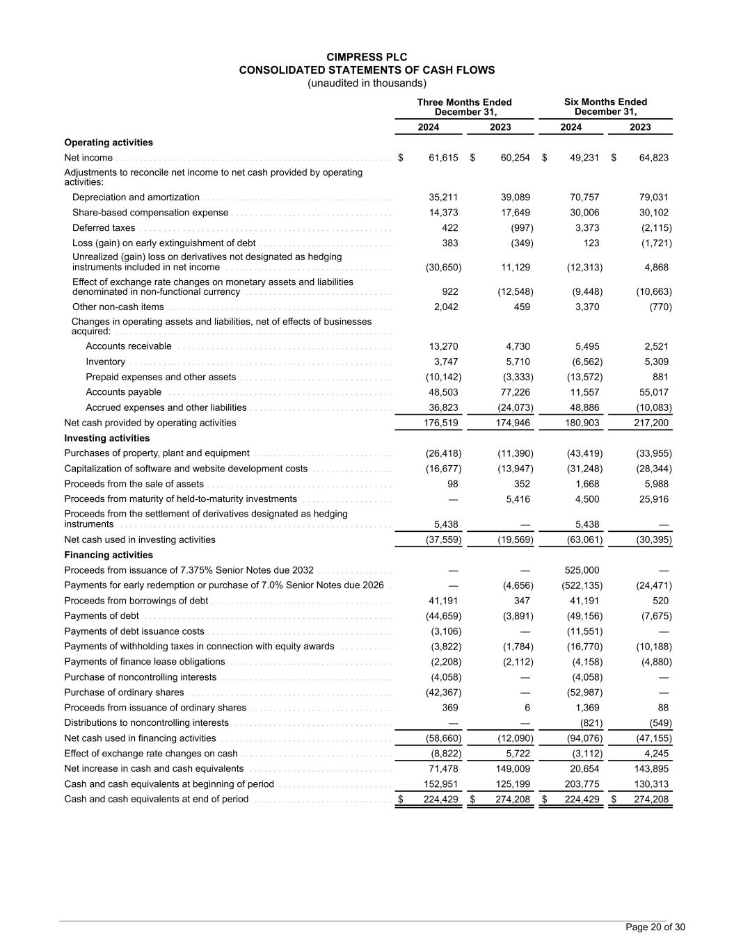 CIMPRESS PLC CONSOLIDATED STATEMENTS OF CASH FLOWS (unaudited in thousands) Three Months Ended December 31, Six Months Ended December 31, 2024 2023 2024 2023 Operating activities Net income . . . . . . . . . . . . . . . . . . . . . . . . . . . . . . . . . . . . . . . . . . . . . . . . . . . . . . . . . . $ 61,615 $ 60,254 $ 49,231 $ 64,823 Adjustments to reconcile net income to net cash provided by operating activities: Depreciation and amortization . . . . . . . . . . . . . . . . . . . . . . . . . . . . . . . . . . . . . . . . 35,211 39,089 70,757 79,031 Share-based compensation expense . . . . . . . . . . . . . . . . . . . . . . . . . . . . . . . . . . 14,373 17,649 30,006 30,102 Deferred taxes . . . . . . . . . . . . . . . . . . . . . . . . . . . . . . . . . . . . . . . . . . . . . . . . . . . . . 422 (997) 3,373 (2,115) Loss (gain) on early extinguishment of debt . . . . . . . . . . . . . . . . . . . . . . . . . . . . 383 (349) 123 (1,721) Unrealized (gain) loss on derivatives not designated as hedging instruments included in net income . . . . . . . . . . . . . . . . . . . . . . . . . . . . . . . . . . . (30,650) 11,129 (12,313) 4,868 Effect of exchange rate changes on monetary assets and liabilities denominated in non-functional currency . . . . . . . . . . . . . . . . . . . . . . . . . . . . . . . 922 (12,548) (9,448) (10,663) Other non-cash items . . . . . . . . . . . . . . . . . . . . . . . . . . . . . . . . . . . . . . . . . . . . . . . 2,042 459 3,370 (770) Changes in operating assets and liabilities, net of effects of businesses acquired: . . . . . . . . . . . . . . . . . . . . . . . . . . . . . . . . . . . . . . . . . . . . . . . . . . . . . . . . . . Accounts receivable . . . . . . . . . . . . . . . . . . . . . . . . . . . . . . . . . . . . . . . . . . . . . 13,270 4,730 5,495 2,521 Inventory . . . . . . . . . . . . . . . . . . . . . . . . . . . . . . . . . . . . . . . . . . . . . . . . . . . . . . . 3,747 5,710 (6,562) 5,309 Prepaid expenses and other assets . . . . . . . . . . . . . . . . . . . . . . . . . . . . . . . . (10,142) (3,333) (13,572) 881 Accounts payable . . . . . . . . . . . . . . . . . . . . . . . . . . . . . . . . . . . . . . . . . . . . . . . 48,503 77,226 11,557 55,017 Accrued expenses and other liabilities . . . . . . . . . . . . . . . . . . . . . . . . . . . . . . 36,823 (24,073) 48,886 (10,083) Net cash provided by operating activities 176,519 174,946 180,903 217,200 Investing activities Purchases of property, plant and equipment . . . . . . . . . . . . . . . . . . . . . . . . . . . . . (26,418) (11,390) (43,419) (33,955) Capitalization of software and website development costs . . . . . . . . . . . . . . . . . (16,677) (13,947) (31,248) (28,344) Proceeds from the sale of assets . . . . . . . . . . . . . . . . . . . . . . . . . . . . . . . . . . . . . . . 98 352 1,668 5,988 Proceeds from maturity of held-to-maturity investments . . . . . . . . . . . . . . . . . . . — 5,416 4,500 25,916 Proceeds from the settlement of derivatives designated as hedging instruments . . . . . . . . . . . . . . . . . . . . . . . . . . . . . . . . . . . . . . . . . . . . . . . . . . . . . . . . . 5,438 — 5,438 — Net cash used in investing activities (37,559) (19,569) (63,061) (30,395) Financing activities Proceeds from issuance of 7.375% Senior Notes due 2032 . . . . . . . . . . . . . . . . — — 525,000 — Payments for early redemption or purchase of 7.0% Senior Notes due 2026 . — (4,656) (522,135) (24,471) Proceeds from borrowings of debt . . . . . . . . . . . . . . . . . . . . . . . . . . . . . . . . . . . . . . 41,191 347 41,191 520 Payments of debt . . . . . . . . . . . . . . . . . . . . . . . . . . . . . . . . . . . . . . . . . . . . . . . . . . . . (44,659) (3,891) (49,156) (7,675) Payments of debt issuance costs . . . . . . . . . . . . . . . . . . . . . . . . . . . . . . . . . . . . . . . (3,106) — (11,551) — Payments of withholding taxes in connection with equity awards . . . . . . . . . . . (3,822) (1,784) (16,770) (10,188) Payments of finance lease obligations . . . . . . . . . . . . . . . . . . . . . . . . . . . . . . . . . . (2,208) (2,112) (4,158) (4,880) Purchase of noncontrolling interests . . . . . . . . . . . . . . . . . . . . . . . . . . . . . . . . . . . . (4,058) — (4,058) — Purchase of ordinary shares . . . . . . . . . . . . . . . . . . . . . . . . . . . . . . . . . . . . . . . . . . . (42,367) — (52,987) — Proceeds from issuance of ordinary shares . . . . . . . . . . . . . . . . . . . . . . . . . . . . . . 369 6 1,369 88 Distributions to noncontrolling interests . . . . . . . . . . . . . . . . . . . . . . . . . . . . . . . . . — — (821) (549) Net cash used in financing activities . . . . . . . . . . . . . . . . . . . . . . . . . . . . . . . . . . . . (58,660) (12,090) (94,076) (47,155) Effect of exchange rate changes on cash . . . . . . . . . . . . . . . . . . . . . . . . . . . . . . . . (8,822) 5,722 (3,112) 4,245 Net increase in cash and cash equivalents . . . . . . . . . . . . . . . . . . . . . . . . . . . . . . 71,478 149,009 20,654 143,895 Cash and cash equivalents at beginning of period . . . . . . . . . . . . . . . . . . . . . . . . 152,951 125,199 203,775 130,313 Cash and cash equivalents at end of period . . . . . . . . . . . . . . . . . . . . . . . . . . . . . $ 224,429 $ 274,208 $ 224,429 $ 274,208 Page 20 of 30