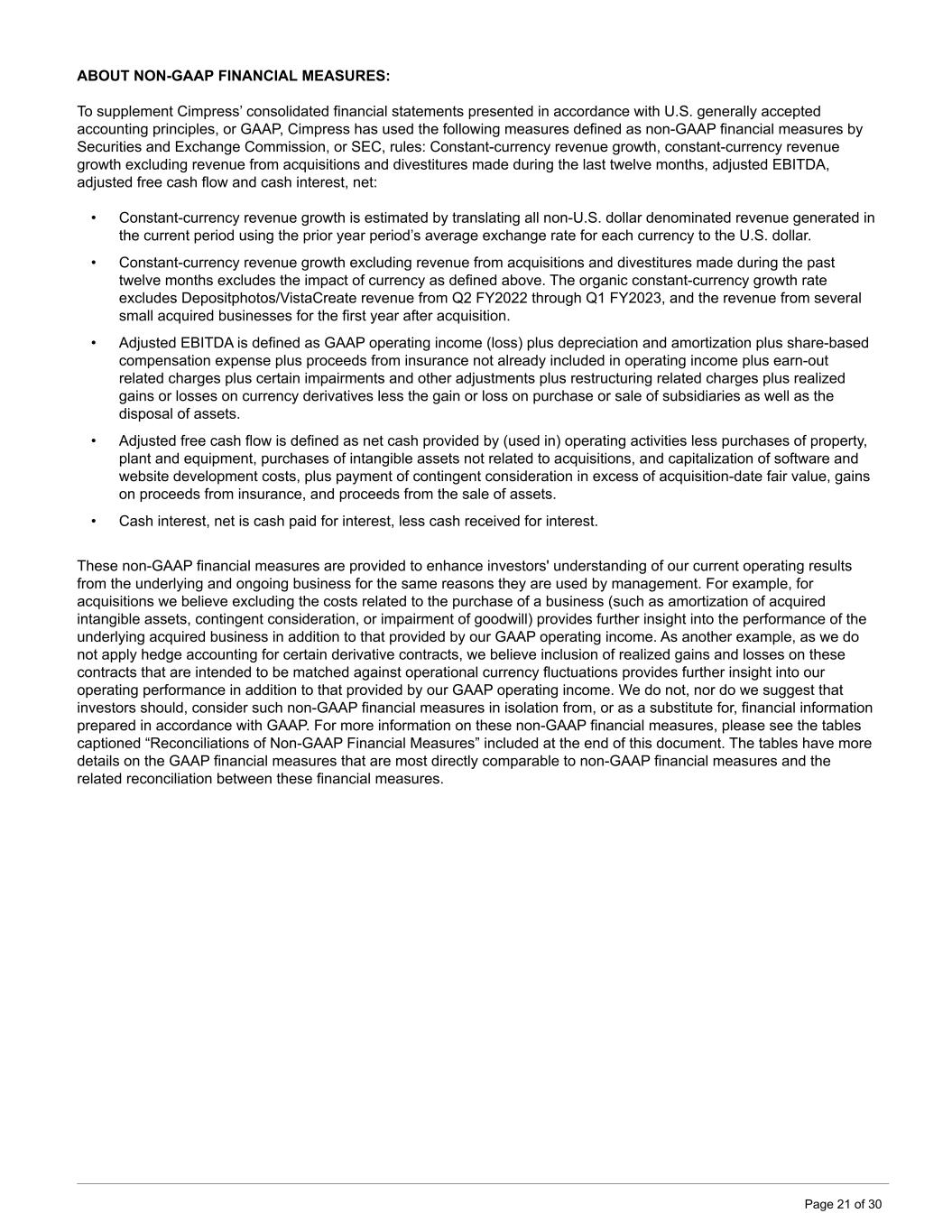 ABOUT NON-GAAP FINANCIAL MEASURES: To supplement Cimpress’ consolidated financial statements presented in accordance with U.S. generally accepted accounting principles, or GAAP, Cimpress has used the following measures defined as non-GAAP financial measures by Securities and Exchange Commission, or SEC, rules: Constant-currency revenue growth, constant-currency revenue growth excluding revenue from acquisitions and divestitures made during the last twelve months, adjusted EBITDA, adjusted free cash flow and cash interest, net: • Constant-currency revenue growth is estimated by translating all non-U.S. dollar denominated revenue generated in the current period using the prior year period’s average exchange rate for each currency to the U.S. dollar. • Constant-currency revenue growth excluding revenue from acquisitions and divestitures made during the past twelve months excludes the impact of currency as defined above. The organic constant-currency growth rate excludes Depositphotos/VistaCreate revenue from Q2 FY2022 through Q1 FY2023, and the revenue from several small acquired businesses for the first year after acquisition. • Adjusted EBITDA is defined as GAAP operating income (loss) plus depreciation and amortization plus share-based compensation expense plus proceeds from insurance not already included in operating income plus earn-out related charges plus certain impairments and other adjustments plus restructuring related charges plus realized gains or losses on currency derivatives less the gain or loss on purchase or sale of subsidiaries as well as the disposal of assets. • Adjusted free cash flow is defined as net cash provided by (used in) operating activities less purchases of property, plant and equipment, purchases of intangible assets not related to acquisitions, and capitalization of software and website development costs, plus payment of contingent consideration in excess of acquisition-date fair value, gains on proceeds from insurance, and proceeds from the sale of assets. • Cash interest, net is cash paid for interest, less cash received for interest. These non-GAAP financial measures are provided to enhance investors' understanding of our current operating results from the underlying and ongoing business for the same reasons they are used by management. For example, for acquisitions we believe excluding the costs related to the purchase of a business (such as amortization of acquired intangible assets, contingent consideration, or impairment of goodwill) provides further insight into the performance of the underlying acquired business in addition to that provided by our GAAP operating income. As another example, as we do not apply hedge accounting for certain derivative contracts, we believe inclusion of realized gains and losses on these contracts that are intended to be matched against operational currency fluctuations provides further insight into our operating performance in addition to that provided by our GAAP operating income. We do not, nor do we suggest that investors should, consider such non-GAAP financial measures in isolation from, or as a substitute for, financial information prepared in accordance with GAAP. For more information on these non-GAAP financial measures, please see the tables captioned “Reconciliations of Non-GAAP Financial Measures” included at the end of this document. The tables have more details on the GAAP financial measures that are most directly comparable to non-GAAP financial measures and the related reconciliation between these financial measures. Page 21 of 30