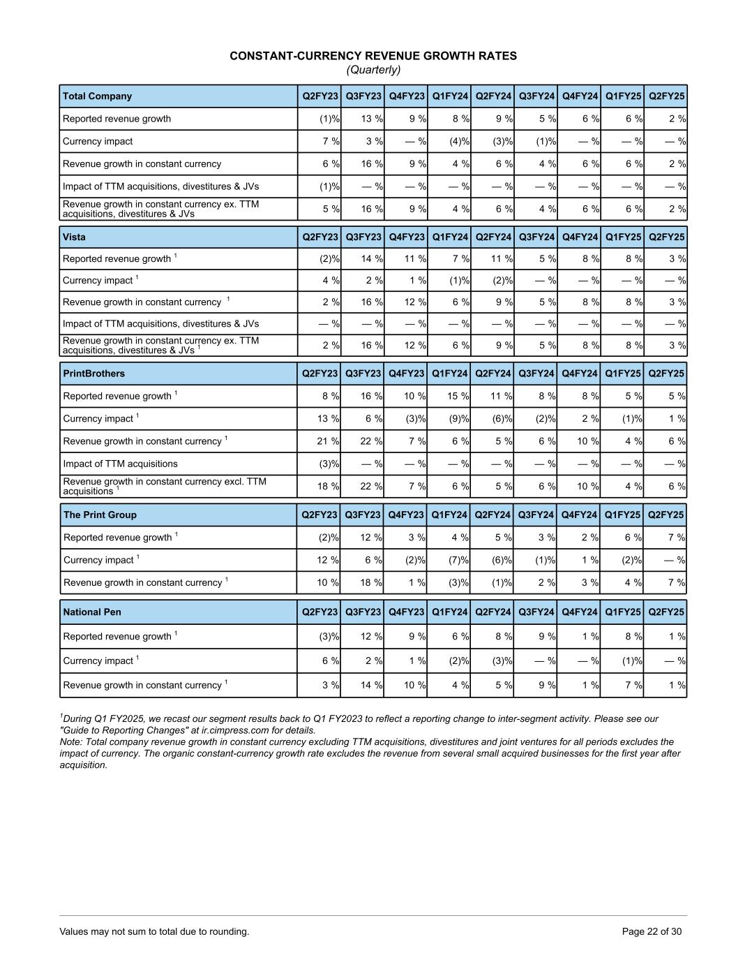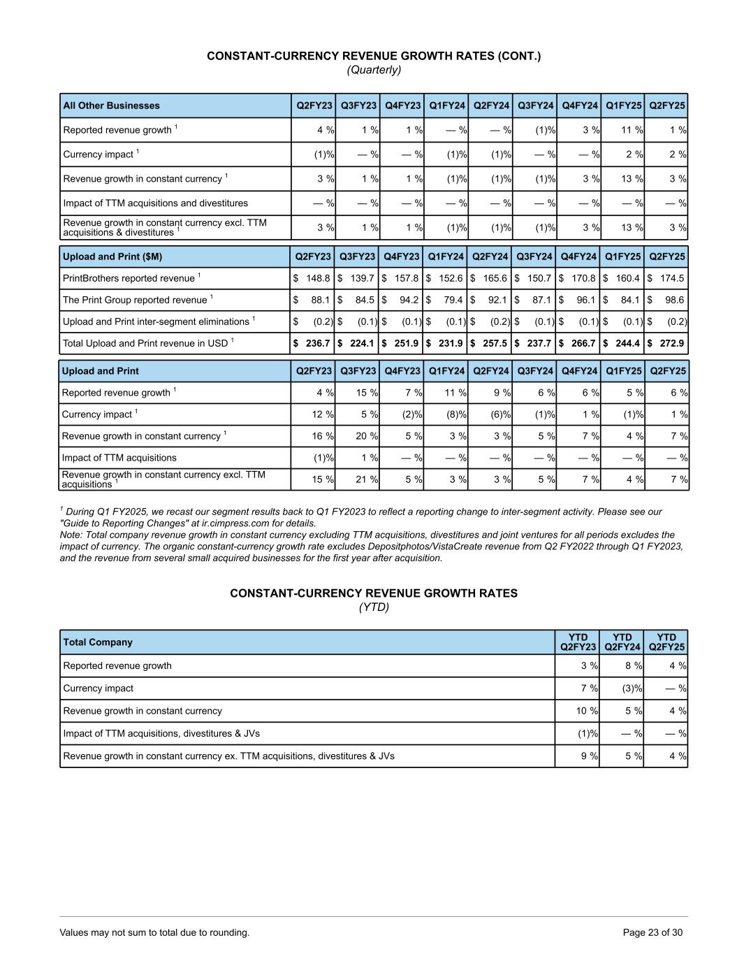 CONSTANT-CURRENCY REVENUE GROWTH RATES (Quarterly) Total Company Q2FY23 Q3FY23 Q4FY23 Q1FY24 Q2FY24 Q3FY24 Q4FY24 Q1FY25 Q2FY25 Reported revenue growth (1) % 13 % 9 % 8 % 9 % 5 % 6 % 6 % 2 % Currency impact 7 % 3 % — % (4) % (3) % (1) % — % — % — % Revenue growth in constant currency 6 % 16 % 9 % 4 % 6 % 4 % 6 % 6 % 2 % Impact of TTM acquisitions, divestitures & JVs (1) % — % — % — % — % — % — % — % — % Revenue growth in constant currency ex. TTM acquisitions, divestitures & JVs 5 % 16 % 9 % 4 % 6 % 4 % 6 % 6 % 2 % Vista Q2FY23 Q3FY23 Q4FY23 Q1FY24 Q2FY24 Q3FY24 Q4FY24 Q1FY25 Q2FY25 Reported revenue growth 1 (2) % 14 % 11 % 7 % 11 % 5 % 8 % 8 % 3 % Currency impact 1 4 % 2 % 1 % (1) % (2) % — % — % — % — % Revenue growth in constant currency 1 2 % 16 % 12 % 6 % 9 % 5 % 8 % 8 % 3 % Impact of TTM acquisitions, divestitures & JVs — % — % — % — % — % — % — % — % — % Revenue growth in constant currency ex. TTM acquisitions, divestitures & JVs 1 2 % 16 % 12 % 6 % 9 % 5 % 8 % 8 % 3 % PrintBrothers Q2FY23 Q3FY23 Q4FY23 Q1FY24 Q2FY24 Q3FY24 Q4FY24 Q1FY25 Q2FY25 Reported revenue growth 1 8 % 16 % 10 % 15 % 11 % 8 % 8 % 5 % 5 % Currency impact 1 13 % 6 % (3) % (9) % (6) % (2) % 2 % (1) % 1 % Revenue growth in constant currency 1 21 % 22 % 7 % 6 % 5 % 6 % 10 % 4 % 6 % Impact of TTM acquisitions (3) % — % — % — % — % — % — % — % — % Revenue growth in constant currency excl. TTM acquisitions 1 18 % 22 % 7 % 6 % 5 % 6 % 10 % 4 % 6 % The Print Group Q2FY23 Q3FY23 Q4FY23 Q1FY24 Q2FY24 Q3FY24 Q4FY24 Q1FY25 Q2FY25 Reported revenue growth 1 (2) % 12 % 3 % 4 % 5 % 3 % 2 % 6 % 7 % Currency impact 1 12 % 6 % (2) % (7) % (6) % (1) % 1 % (2) % — % Revenue growth in constant currency 1 10 % 18 % 1 % (3) % (1) % 2 % 3 % 4 % 7 % National Pen Q2FY23 Q3FY23 Q4FY23 Q1FY24 Q2FY24 Q3FY24 Q4FY24 Q1FY25 Q2FY25 Reported revenue growth 1 (3) % 12 % 9 % 6 % 8 % 9 % 1 % 8 % 1 % Currency impact 1 6 % 2 % 1 % (2) % (3) % — % — % (1) % — % Revenue growth in constant currency 1 3 % 14 % 10 % 4 % 5 % 9 % 1 % 7 % 1 % 1During Q1 FY2025, we recast our segment results back to Q1 FY2023 to reflect a reporting change to inter-segment activity. Please see our "Guide to Reporting Changes" at ir.cimpress.com for details. Note: Total company revenue growth in constant currency excluding TTM acquisitions, divestitures and joint ventures for all periods excludes the impact of currency. The organic constant-currency growth rate excludes the revenue from several small acquired businesses for the first year after acquisition. Values may not sum to total due to rounding. Page 22 of 30