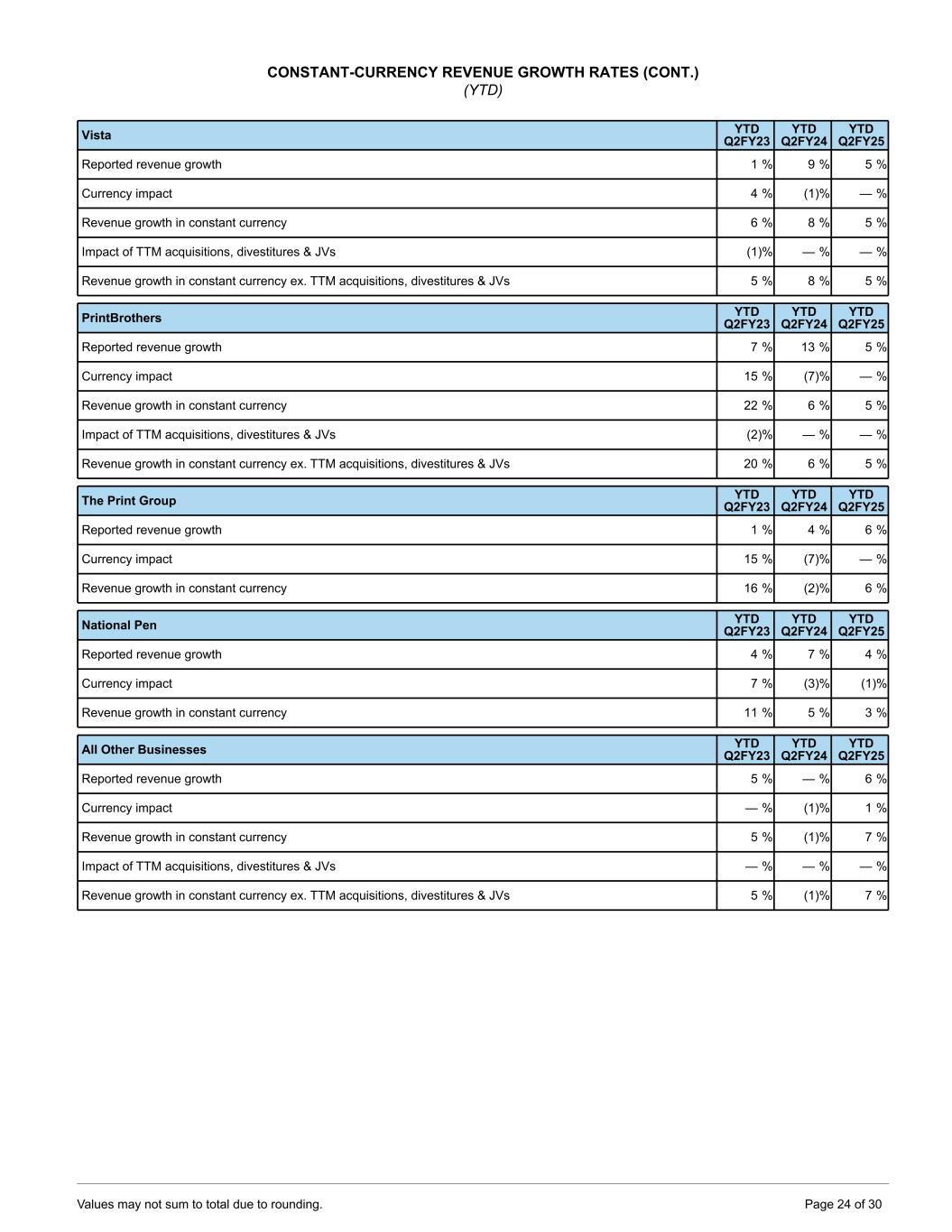 CONSTANT-CURRENCY REVENUE GROWTH RATES (CONT.) (YTD) Vista YTD Q2FY23 YTD Q2FY24 YTD Q2FY25 Reported revenue growth 1 % 9 % 5 % Currency impact 4 % (1) % — % Revenue growth in constant currency 6 % 8 % 5 % Impact of TTM acquisitions, divestitures & JVs (1) % — % — % Revenue growth in constant currency ex. TTM acquisitions, divestitures & JVs 5 % 8 % 5 % PrintBrothers YTD Q2FY23 YTD Q2FY24 YTD Q2FY25 Reported revenue growth 7 % 13 % 5 % Currency impact 15 % (7) % — % Revenue growth in constant currency 22 % 6 % 5 % Impact of TTM acquisitions, divestitures & JVs (2) % — % — % Revenue growth in constant currency ex. TTM acquisitions, divestitures & JVs 20 % 6 % 5 % The Print Group YTD Q2FY23 YTD Q2FY24 YTD Q2FY25 Reported revenue growth 1 % 4 % 6 % Currency impact 15 % (7) % — % Revenue growth in constant currency 16 % (2) % 6 % National Pen YTD Q2FY23 YTD Q2FY24 YTD Q2FY25 Reported revenue growth 4 % 7 % 4 % Currency impact 7 % (3) % (1) % Revenue growth in constant currency 11 % 5 % 3 % All Other Businesses YTD Q2FY23 YTD Q2FY24 YTD Q2FY25 Reported revenue growth 5 % — % 6 % Currency impact — % (1) % 1 % Revenue growth in constant currency 5 % (1) % 7 % Impact of TTM acquisitions, divestitures & JVs — % — % — % Revenue growth in constant currency ex. TTM acquisitions, divestitures & JVs 5 % (1) % 7 % Values may not sum to total due to rounding. Page 24 of 30