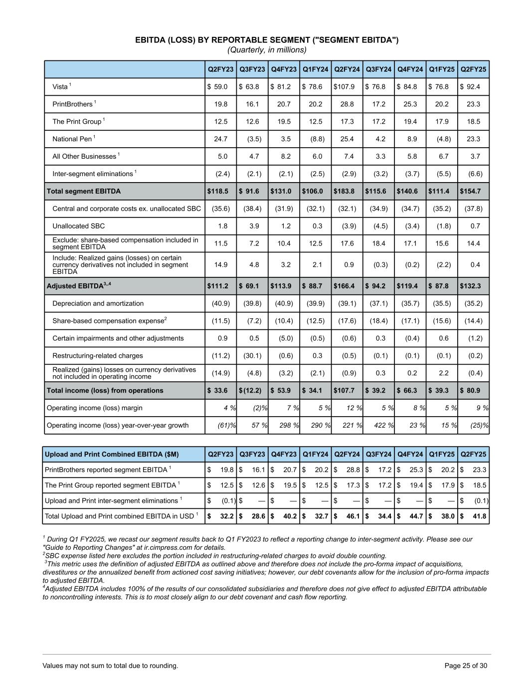EBITDA (LOSS) BY REPORTABLE SEGMENT ("SEGMENT EBITDA") (Quarterly, in millions) Q2FY23 Q3FY23 Q4FY23 Q1FY24 Q2FY24 Q3FY24 Q4FY24 Q1FY25 Q2FY25 Vista 1 $ 59.0 $ 63.8 $ 81.2 $ 78.6 $ 107.9 $ 76.8 $ 84.8 $ 76.8 $ 92.4 PrintBrothers 1 19.8 16.1 20.7 20.2 28.8 17.2 25.3 20.2 23.3 The Print Group 1 12.5 12.6 19.5 12.5 17.3 17.2 19.4 17.9 18.5 National Pen 1 24.7 (3.5) 3.5 (8.8) 25.4 4.2 8.9 (4.8) 23.3 All Other Businesses 1 5.0 4.7 8.2 6.0 7.4 3.3 5.8 6.7 3.7 Inter-segment eliminations 1 (2.4) (2.1) (2.1) (2.5) (2.9) (3.2) (3.7) (5.5) (6.6) Total segment EBITDA $ 118.5 $ 91.6 $ 131.0 $ 106.0 $ 183.8 $ 115.6 $ 140.6 $ 111.4 $ 154.7 Central and corporate costs ex. unallocated SBC (35.6) (38.4) (31.9) (32.1) (32.1) (34.9) (34.7) (35.2) (37.8) Unallocated SBC 1.8 3.9 1.2 0.3 (3.9) (4.5) (3.4) (1.8) 0.7 Exclude: share-based compensation included in segment EBITDA 11.5 7.2 10.4 12.5 17.6 18.4 17.1 15.6 14.4 Include: Realized gains (losses) on certain currency derivatives not included in segment EBITDA 14.9 4.8 3.2 2.1 0.9 (0.3) (0.2) (2.2) 0.4 Adjusted EBITDA3,,4 $ 111.2 $ 69.1 $ 113.9 $ 88.7 $ 166.4 $ 94.2 $ 119.4 $ 87.8 $ 132.3 Depreciation and amortization (40.9) (39.8) (40.9) (39.9) (39.1) (37.1) (35.7) (35.5) (35.2) Share-based compensation expense2 (11.5) (7.2) (10.4) (12.5) (17.6) (18.4) (17.1) (15.6) (14.4) Certain impairments and other adjustments 0.9 0.5 (5.0) (0.5) (0.6) 0.3 (0.4) 0.6 (1.2) Restructuring-related charges (11.2) (30.1) (0.6) 0.3 (0.5) (0.1) (0.1) (0.1) (0.2) Realized (gains) losses on currency derivatives not included in operating income (14.9) (4.8) (3.2) (2.1) (0.9) 0.3 0.2 2.2 (0.4) Total income (loss) from operations $ 33.6 $ (12.2) $ 53.9 $ 34.1 $ 107.7 $ 39.2 $ 66.3 $ 39.3 $ 80.9 Operating income (loss) margin 4 % (2) % 7 % 5 % 12 % 5 % 8 % 5 % 9 % Operating income (loss) year-over-year growth (61) % 57 % 298 % 290 % 221 % 422 % 23 % 15 % (25) % Upload and Print Combined EBITDA ($M) Q2FY23 Q3FY23 Q4FY23 Q1FY24 Q2FY24 Q3FY24 Q4FY24 Q1FY25 Q2FY25 PrintBrothers reported segment EBITDA 1 $ 19.8 $ 16.1 $ 20.7 $ 20.2 $ 28.8 $ 17.2 $ 25.3 $ 20.2 $ 23.3 The Print Group reported segment EBITDA 1 $ 12.5 $ 12.6 $ 19.5 $ 12.5 $ 17.3 $ 17.2 $ 19.4 $ 17.9 $ 18.5 Upload and Print inter-segment eliminations 1 $ (0.1) $ — $ — $ — $ — $ — $ — $ — $ (0.1) Total Upload and Print combined EBITDA in USD 1 $ 32.2 $ 28.6 $ 40.2 $ 32.7 $ 46.1 $ 34.4 $ 44.7 $ 38.0 $ 41.8 1 During Q1 FY2025, we recast our segment results back to Q1 FY2023 to reflect a reporting change to inter-segment activity. Please see our "Guide to Reporting Changes" at ir.cimpress.com for details. 2SBC expense listed here excludes the portion included in restructuring-related charges to avoid double counting. 3This metric uses the definition of adjusted EBITDA as outlined above and therefore does not include the pro-forma impact of acquisitions, divestitures or the annualized benefit from actioned cost saving initiatives; however, our debt covenants allow for the inclusion of pro-forma impacts to adjusted EBITDA. 4Adjusted EBITDA includes 100% of the results of our consolidated subsidiaries and therefore does not give effect to adjusted EBITDA attributable to noncontrolling interests. This is to most closely align to our debt covenant and cash flow reporting. Values may not sum to total due to rounding. Page 25 of 30