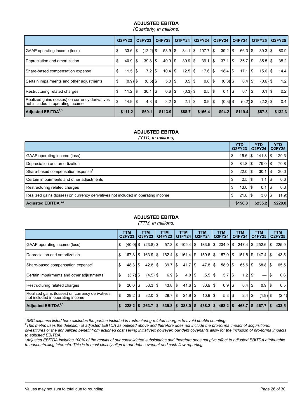 ADJUSTED EBITDA (Quarterly, in millions) Q2FY23 Q3FY23 Q4FY23 Q1FY24 Q2FY24 Q3FY24 Q4FY24 Q1FY25 Q2FY25 GAAP operating income (loss) $ 33.6 $ (12.2) $ 53.9 $ 34.1 $ 107.7 $ 39.2 $ 66.3 $ 39.3 $ 80.9 Depreciation and amortization $ 40.9 $ 39.8 $ 40.9 $ 39.9 $ 39.1 $ 37.1 $ 35.7 $ 35.5 $ 35.2 Share-based compensation expense1 $ 11.5 $ 7.2 $ 10.4 $ 12.5 $ 17.6 $ 18.4 $ 17.1 $ 15.6 $ 14.4 Certain impairments and other adjustments $ (0.9) $ (0.5) $ 5.0 $ 0.5 $ 0.6 $ (0.3) $ 0.4 $ (0.6) $ 1.2 Restructuring related charges $ 11.2 $ 30.1 $ 0.6 $ (0.3) $ 0.5 $ 0.1 $ 0.1 $ 0.1 $ 0.2 Realized gains (losses) on currency derivatives not included in operating income $ 14.9 $ 4.8 $ 3.2 $ 2.1 $ 0.9 $ (0.3) $ (0.2) $ (2.2) $ 0.4 Adjusted EBITDA2,3 $111.2 $69.1 $113.9 $88.7 $166.4 $94.2 $119.4 $87.8 $132.3 ADJUSTED EBITDA (YTD, in millions) YTD Q2FY23 YTD Q2FY24 YTD Q2FY25 GAAP operating income (loss) $ 15.6 $ 141.8 $ 120.3 Depreciation and amortization $ 81.8 $ 79.0 $ 70.8 Share-based compensation expense1 $ 22.0 $ 30.1 $ 30.0 Certain impairments and other adjustments $ 2.5 $ 1.1 $ 0.6 Restructuring related charges $ 13.0 $ 0.1 $ 0.3 Realized gains (losses) on currency derivatives not included in operating income $ 21.8 $ 3.0 $ (1.9) Adjusted EBITDA 2,3 $156.8 $255.2 $220.0 ADJUSTED EBITDA (TTM, in millions) TTM Q2FY23 TTM Q3FY23 TTM Q4FY23 TTM Q1FY24 TTM Q2FY24 TTM Q3FY24 TTM Q4FY24 TTM Q1FY25 TTM Q2FY25 GAAP operating income (loss) $ (40.0) $ (23.8) $ 57.3 $ 109.4 $ 183.5 $ 234.9 $ 247.4 $ 252.6 $ 225.9 Depreciation and amortization $ 167.8 $ 163.9 $ 162.4 $ 161.4 $ 159.6 $ 157.0 $ 151.8 $ 147.4 $ 143.5 Share-based compensation expense1 $ 48.3 $ 42.8 $ 39.7 $ 41.7 $ 47.8 $ 58.9 $ 65.6 $ 68.8 $ 65.5 Certain impairments and other adjustments $ (3.7) $ (4.5) $ 6.9 $ 4.0 $ 5.5 $ 5.7 $ 1.2 $ — $ 0.6 Restructuring related charges $ 26.6 $ 53.3 $ 43.8 $ 41.6 $ 30.9 $ 0.9 $ 0.4 $ 0.9 $ 0.5 Realized gains (losses) on currency derivatives not included in operating income $ 29.2 $ 32.0 $ 29.7 $ 24.9 $ 10.9 $ 5.8 $ 2.4 $ (1.9) $ (2.4) Adjusted EBITDA2,3 $ 228.2 $ 263.7 $ 339.8 $ 383.0 $ 438.2 $ 463.2 $ 468.7 $ 467.7 $ 433.5 1SBC expense listed here excludes the portion included in restructuring-related charges to avoid double counting. 2This metric uses the definition of adjusted EBITDA as outlined above and therefore does not include the pro-forma impact of acquisitions, divestitures or the annualized benefit from actioned cost saving initiatives; however, our debt covenants allow for the inclusion of pro-forma impacts to adjusted EBITDA. 3Adjusted EBITDA includes 100% of the results of our consolidated subsidiaries and therefore does not give effect to adjusted EBITDA attributable to noncontrolling interests. This is to most closely align to our debt covenant and cash flow reporting. Values may not sum to total due to rounding. Page 26 of 30