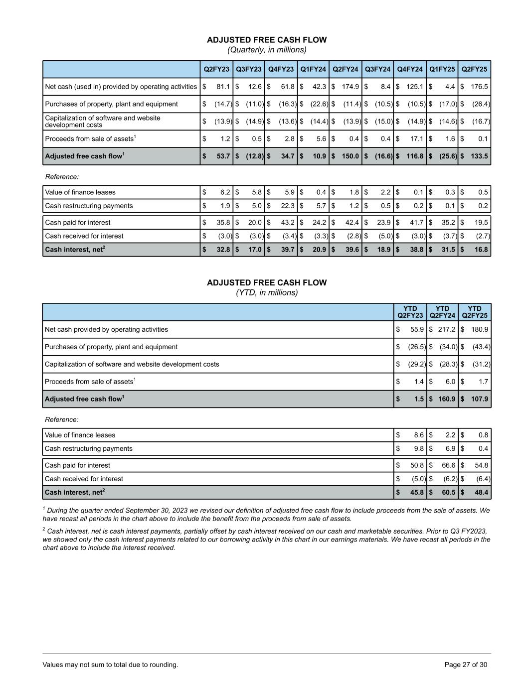 ADJUSTED FREE CASH FLOW (Quarterly, in millions) Q2FY23 Q3FY23 Q4FY23 Q1FY24 Q2FY24 Q3FY24 Q4FY24 Q1FY25 Q2FY25 Net cash (used in) provided by operating activities $ 81.1 $ 12.6 $ 61.8 $ 42.3 $ 174.9 $ 8.4 $ 125.1 $ 4.4 $ 176.5 Purchases of property, plant and equipment $ (14.7) $ (11.0) $ (16.3) $ (22.6) $ (11.4) $ (10.5) $ (10.5) $ (17.0) $ (26.4) Capitalization of software and website development costs $ (13.9) $ (14.9) $ (13.6) $ (14.4) $ (13.9) $ (15.0) $ (14.9) $ (14.6) $ (16.7) Proceeds from sale of assets1 $ 1.2 $ 0.5 $ 2.8 $ 5.6 $ 0.4 $ 0.4 $ 17.1 $ 1.6 $ 0.1 Adjusted free cash flow1 $ 53.7 $ (12.8) $ 34.7 $ 10.9 $ 150.0 $ (16.6) $ 116.8 $ (25.6) $ 133.5 Reference: Value of finance leases $ 6.2 $ 5.8 $ 5.9 $ 0.4 $ 1.8 $ 2.2 $ 0.1 $ 0.3 $ 0.5 Cash restructuring payments $ 1.9 $ 5.0 $ 22.3 $ 5.7 $ 1.2 $ 0.5 $ 0.2 $ 0.1 $ 0.2 Cash paid for interest $ 35.8 $ 20.0 $ 43.2 $ 24.2 $ 42.4 $ 23.9 $ 41.7 $ 35.2 $ 19.5 Cash received for interest $ (3.0) $ (3.0) $ (3.4) $ (3.3) $ (2.8) $ (5.0) $ (3.0) $ (3.7) $ (2.7) Cash interest, net2 $ 32.8 $ 17.0 $ 39.7 $ 20.9 $ 39.6 $ 18.9 $ 38.8 $ 31.5 $ 16.8 ADJUSTED FREE CASH FLOW (YTD, in millions) YTD Q2FY23 YTD Q2FY24 YTD Q2FY25 Net cash provided by operating activities $ 55.9 $ 217.2 $ 180.9 Purchases of property, plant and equipment $ (26.5) $ (34.0) $ (43.4) Capitalization of software and website development costs $ (29.2) $ (28.3) $ (31.2) Proceeds from sale of assets1 $ 1.4 $ 6.0 $ 1.7 Adjusted free cash flow1 $ 1.5 $ 160.9 $ 107.9 Reference: Value of finance leases $ 8.6 $ 2.2 $ 0.8 Cash restructuring payments $ 9.8 $ 6.9 $ 0.4 Cash paid for interest $ 50.8 $ 66.6 $ 54.8 Cash received for interest $ (5.0) $ (6.2) $ (6.4) Cash interest, net2 $ 45.8 $ 60.5 $ 48.4 1 During the quarter ended September 30, 2023 we revised our definition of adjusted free cash flow to include proceeds from the sale of assets. We have recast all periods in the chart above to include the benefit from the proceeds from sale of assets. 2 Cash interest, net is cash interest payments, partially offset by cash interest received on our cash and marketable securities. Prior to Q3 FY2023, we showed only the cash interest payments related to our borrowing activity in this chart in our earnings materials. We have recast all periods in the chart above to include the interest received. Values may not sum to total due to rounding. Page 27 of 30